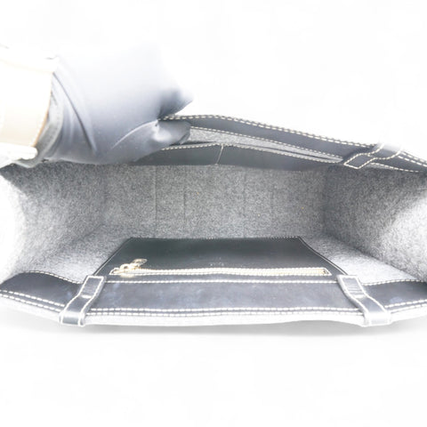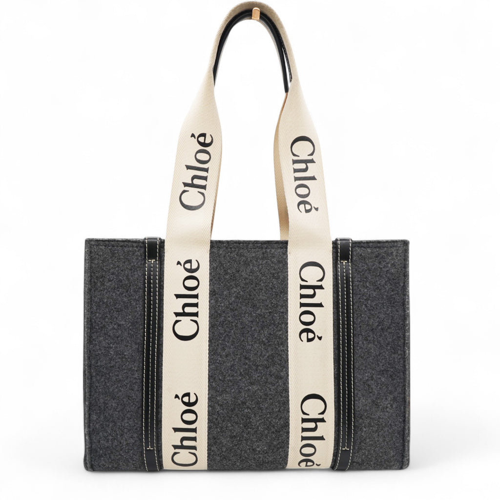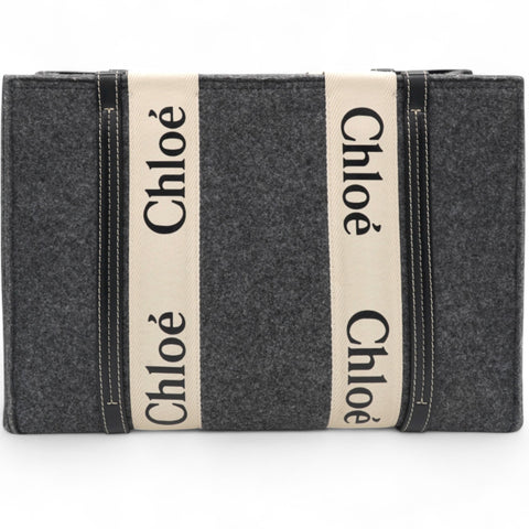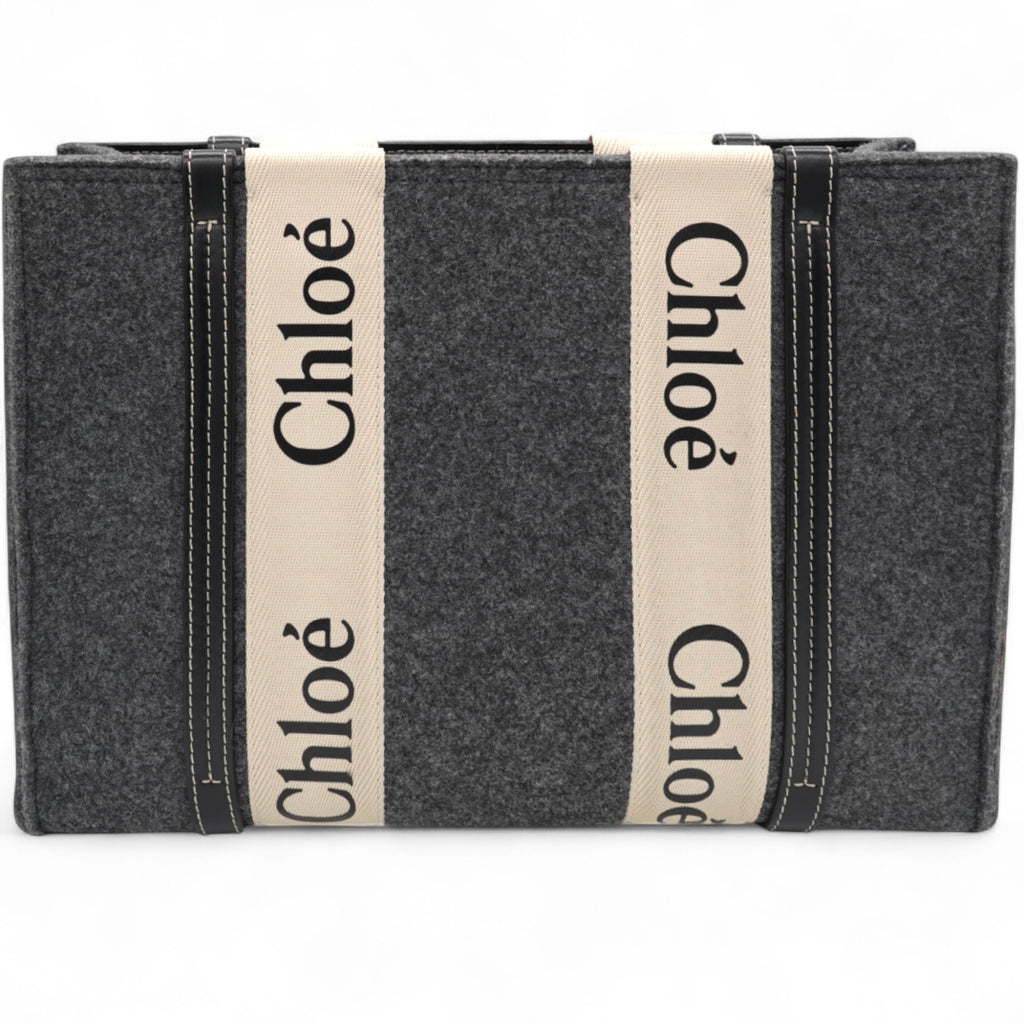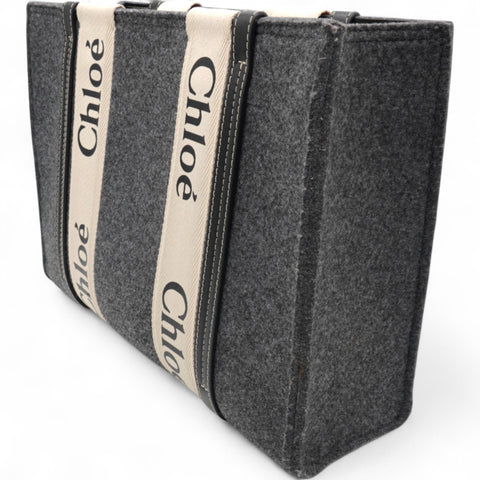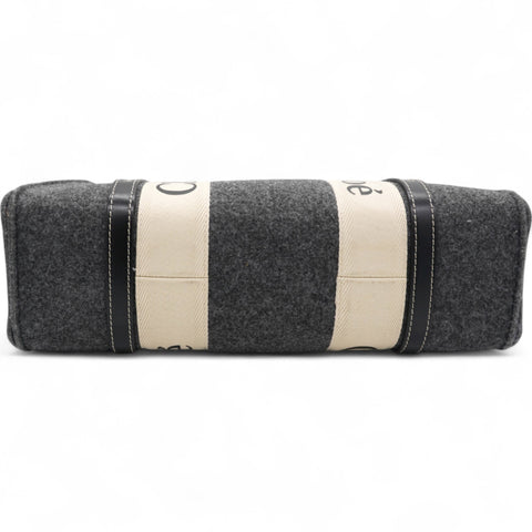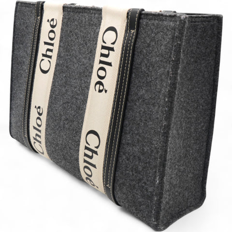 | This chic tote is crafted of grey felt. The bag features off-white top handles and strap detail accented with vertical Chloé logos in black. The top is open to a grey felt interior with black leather zipper and patch pockets. |