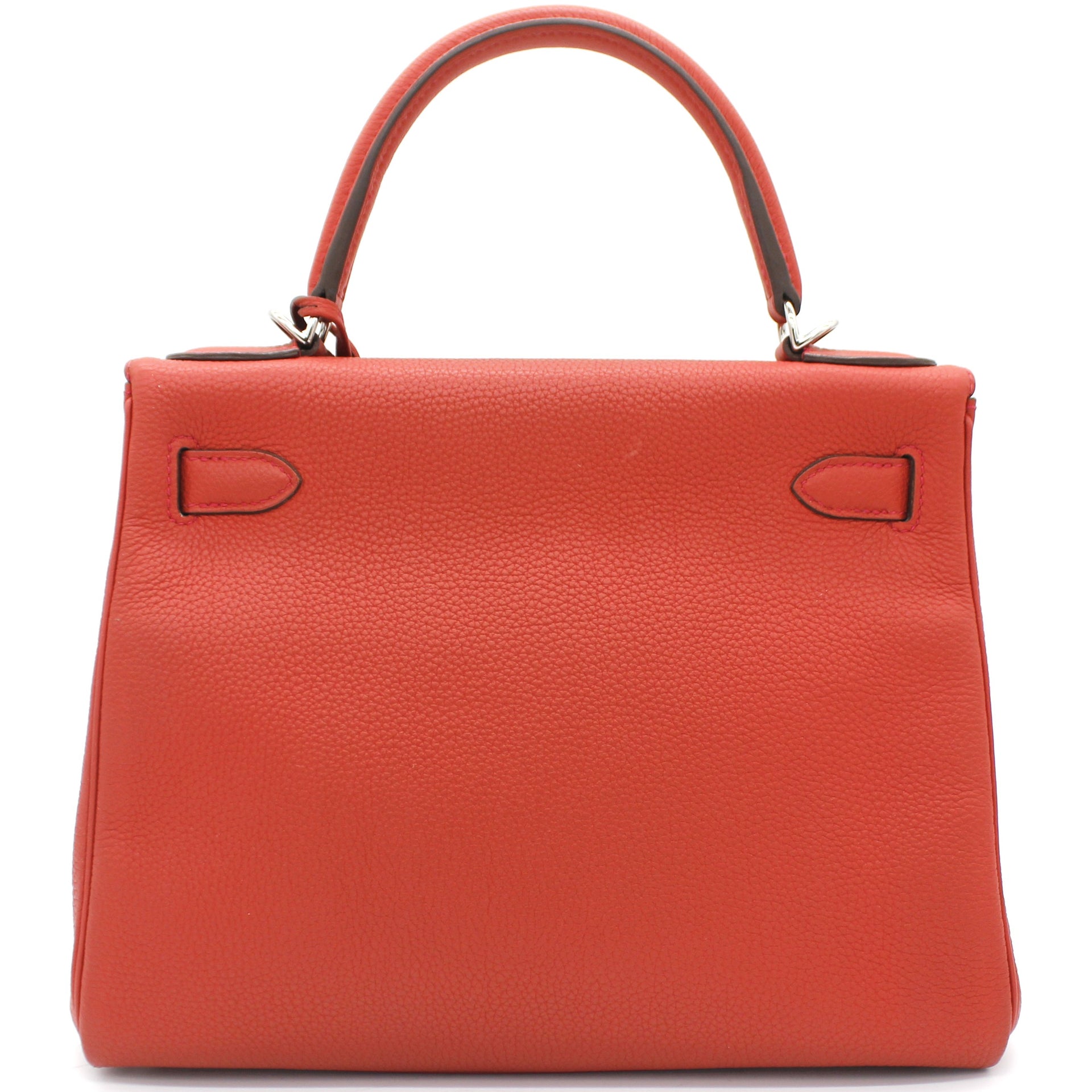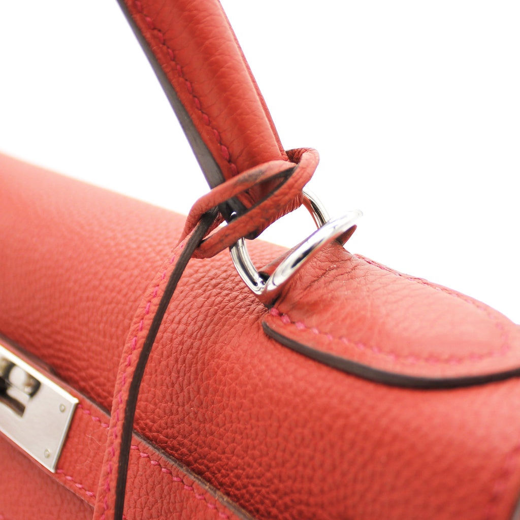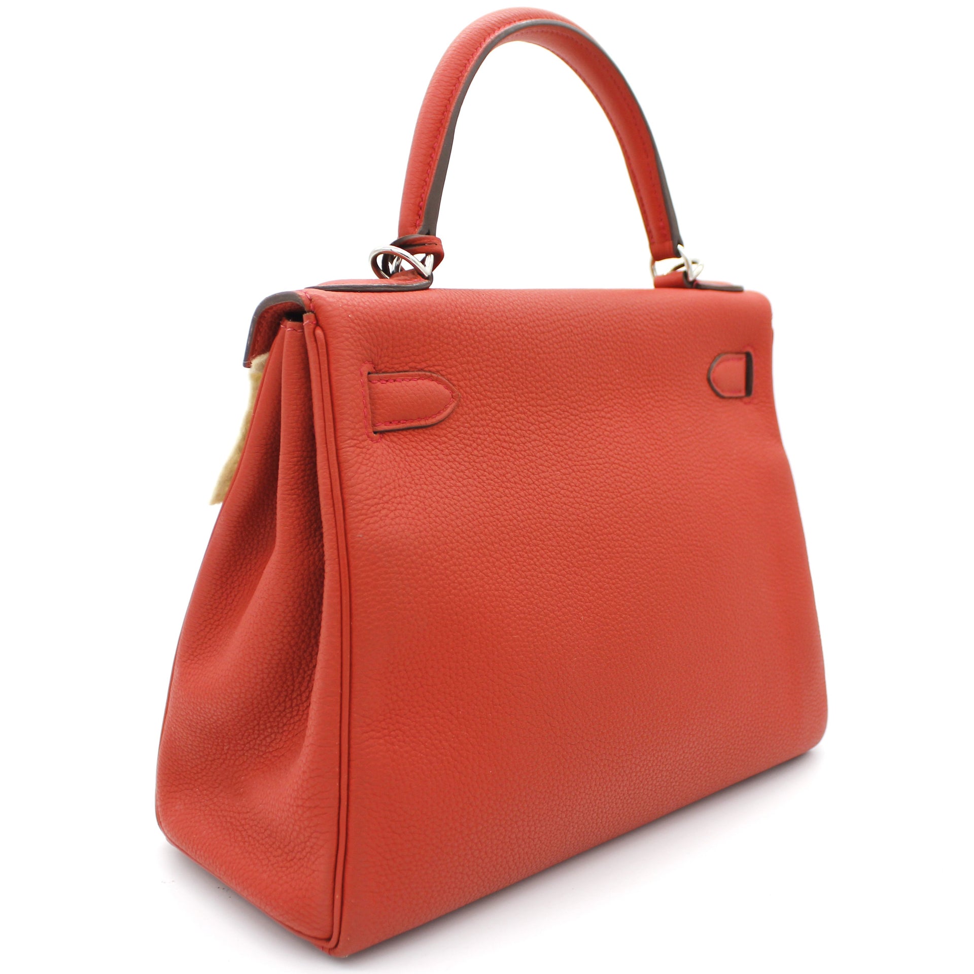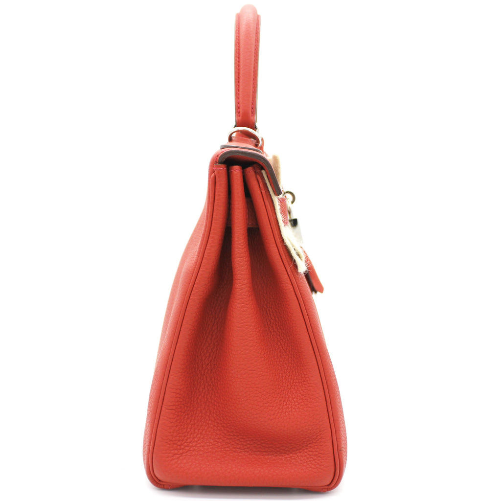 | Hermès Kelly 28 crafted in Togo leather in Géranuim and designed with hardware and tonal stitching. Interior has 1 slip pocket and 1 zip pocket. |