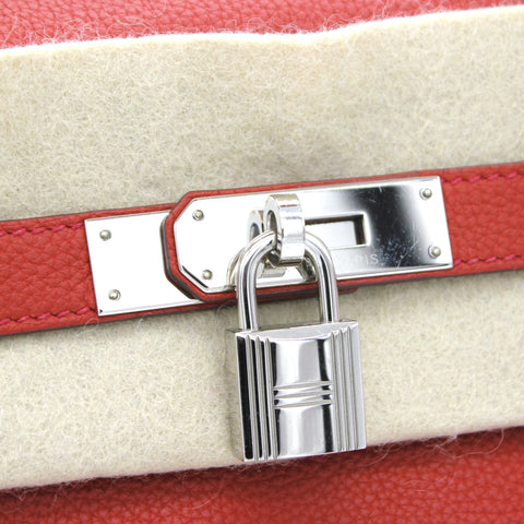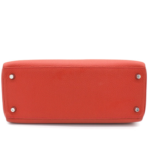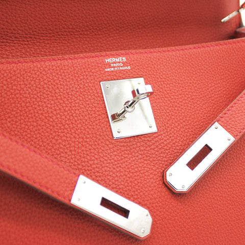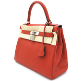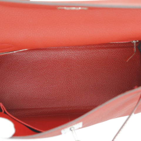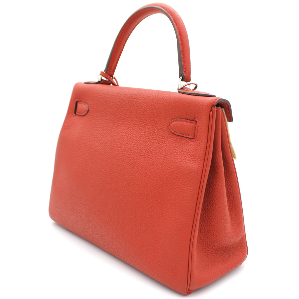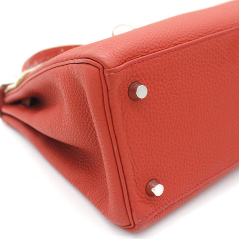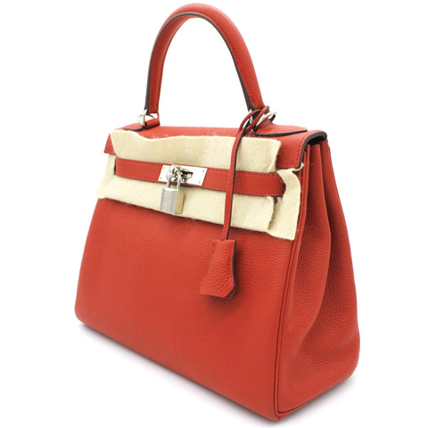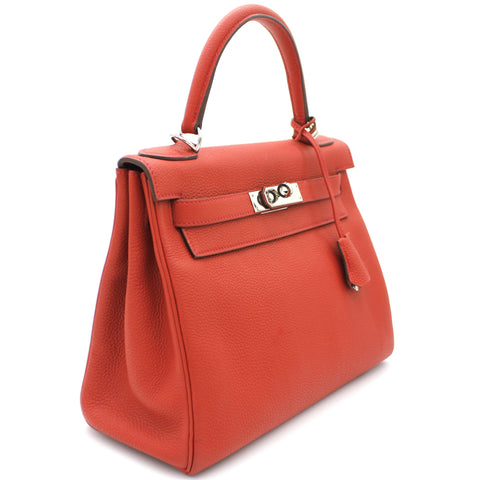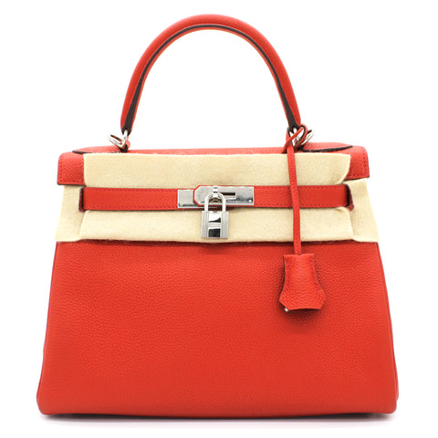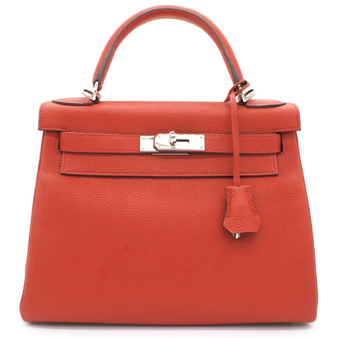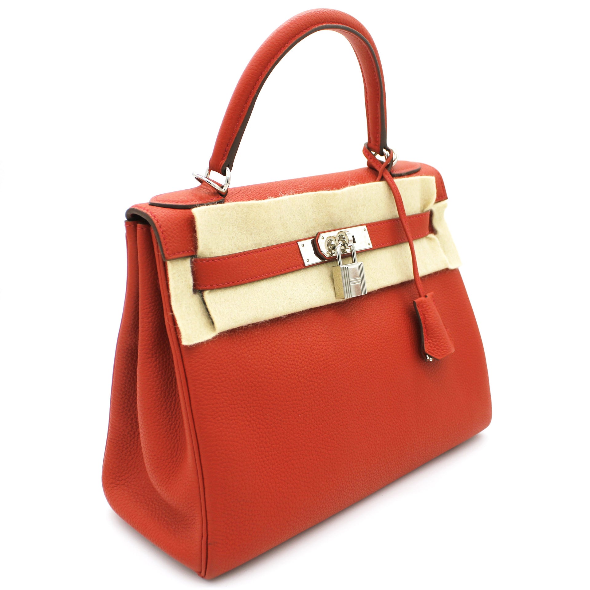 | Hermès Kelly 28 crafted in Togo leather in Géranuim and designed with hardware and tonal stitching. Interior has 1 slip pocket and 1 zip pocket. |