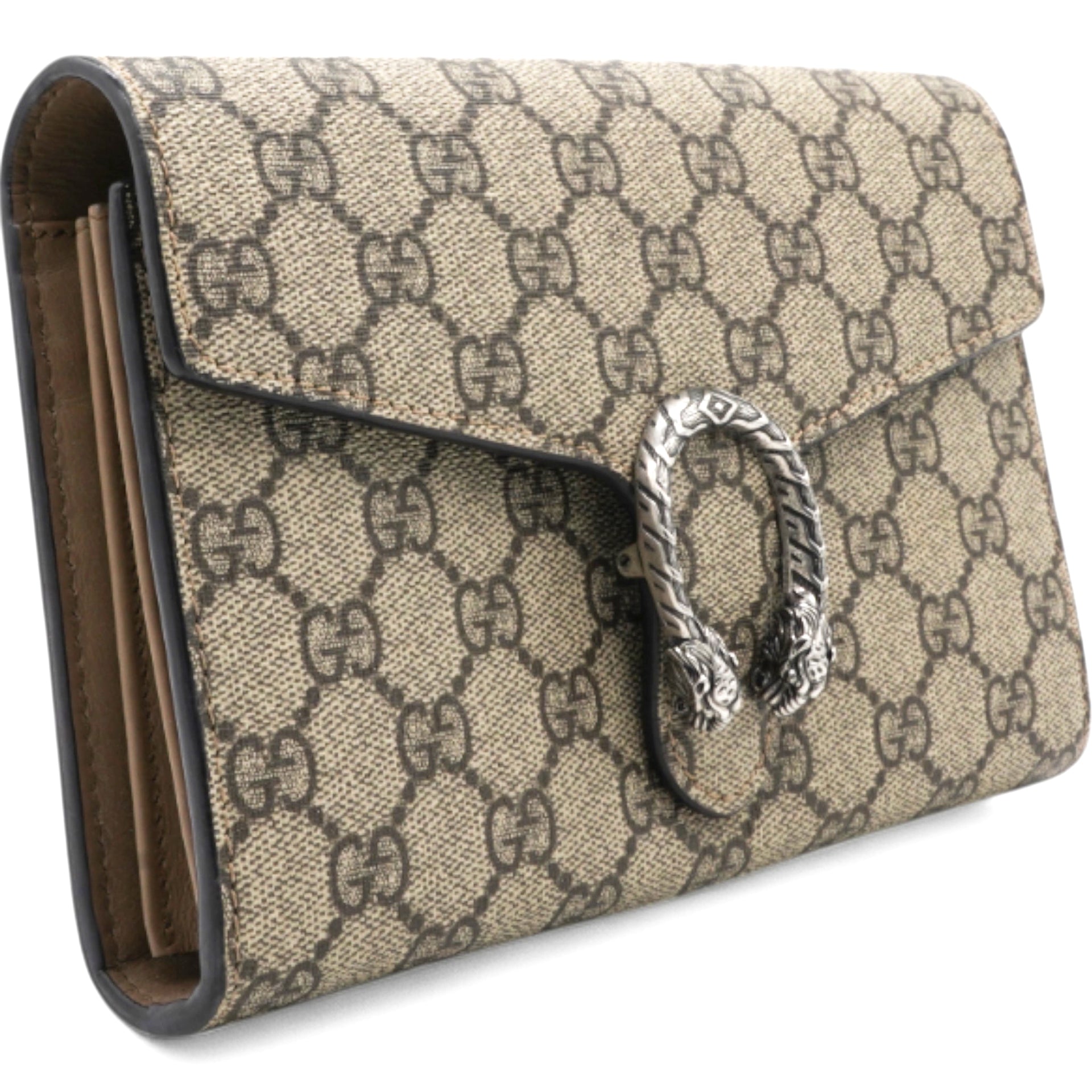 This wallet is crafted of Gucci GG monogram coated canvas. The bag features a removable aged silver chainlink shoulder strap and a textured horseshoe closure with tiger head spurs. This opens to a partitioned brown fabric and taupe leather interior with card slots, patch pockets, and a zippered compartment.