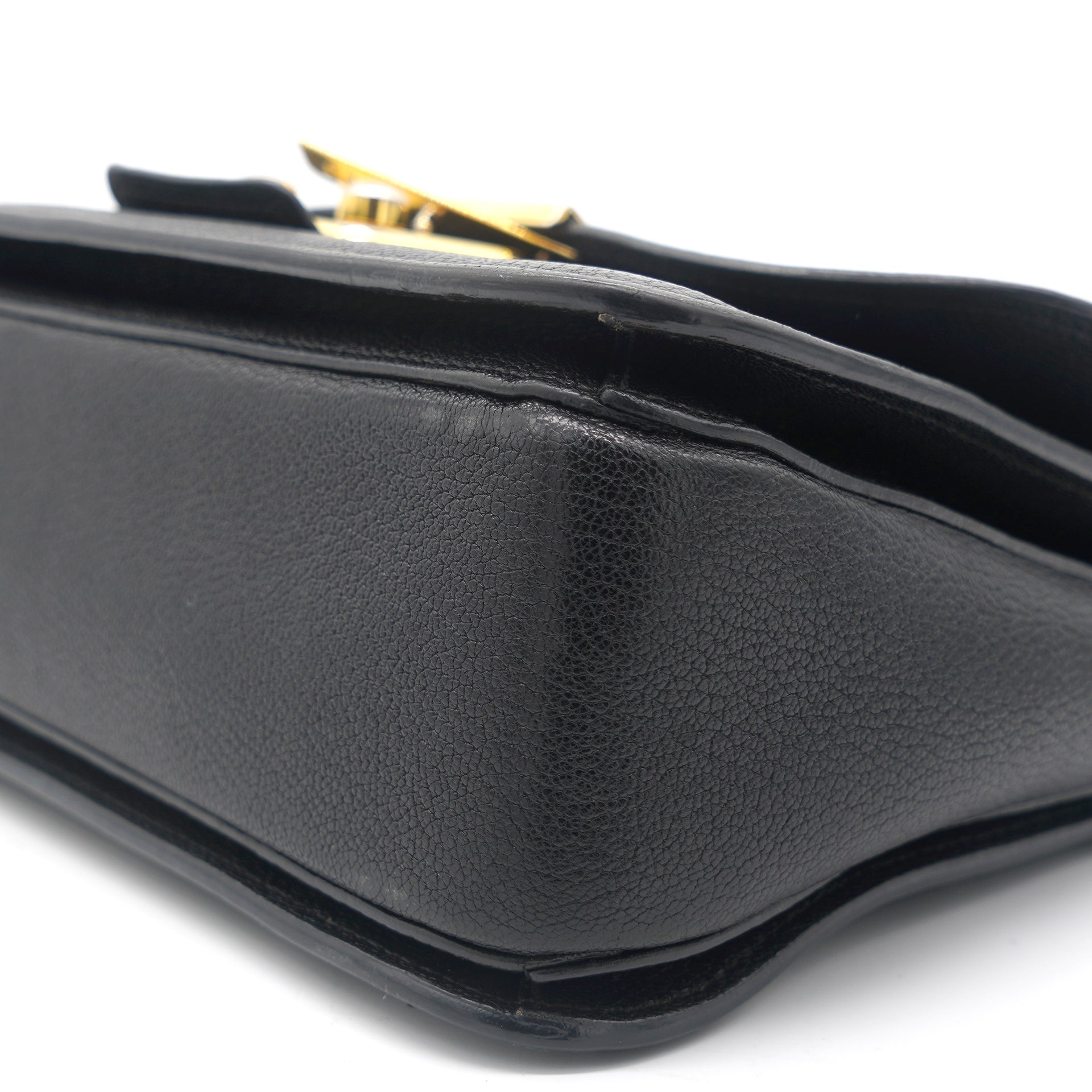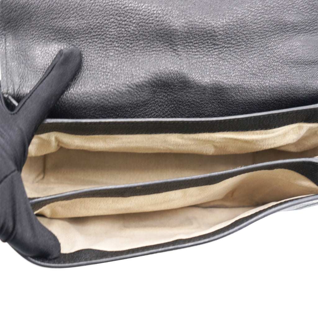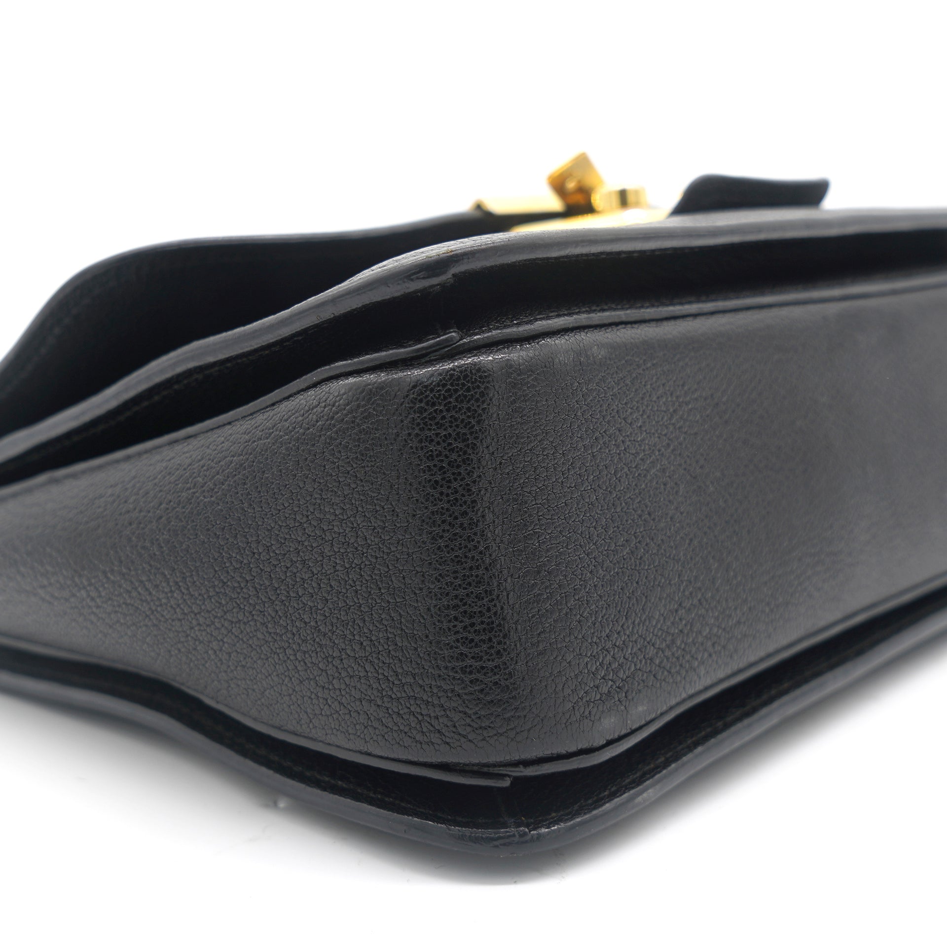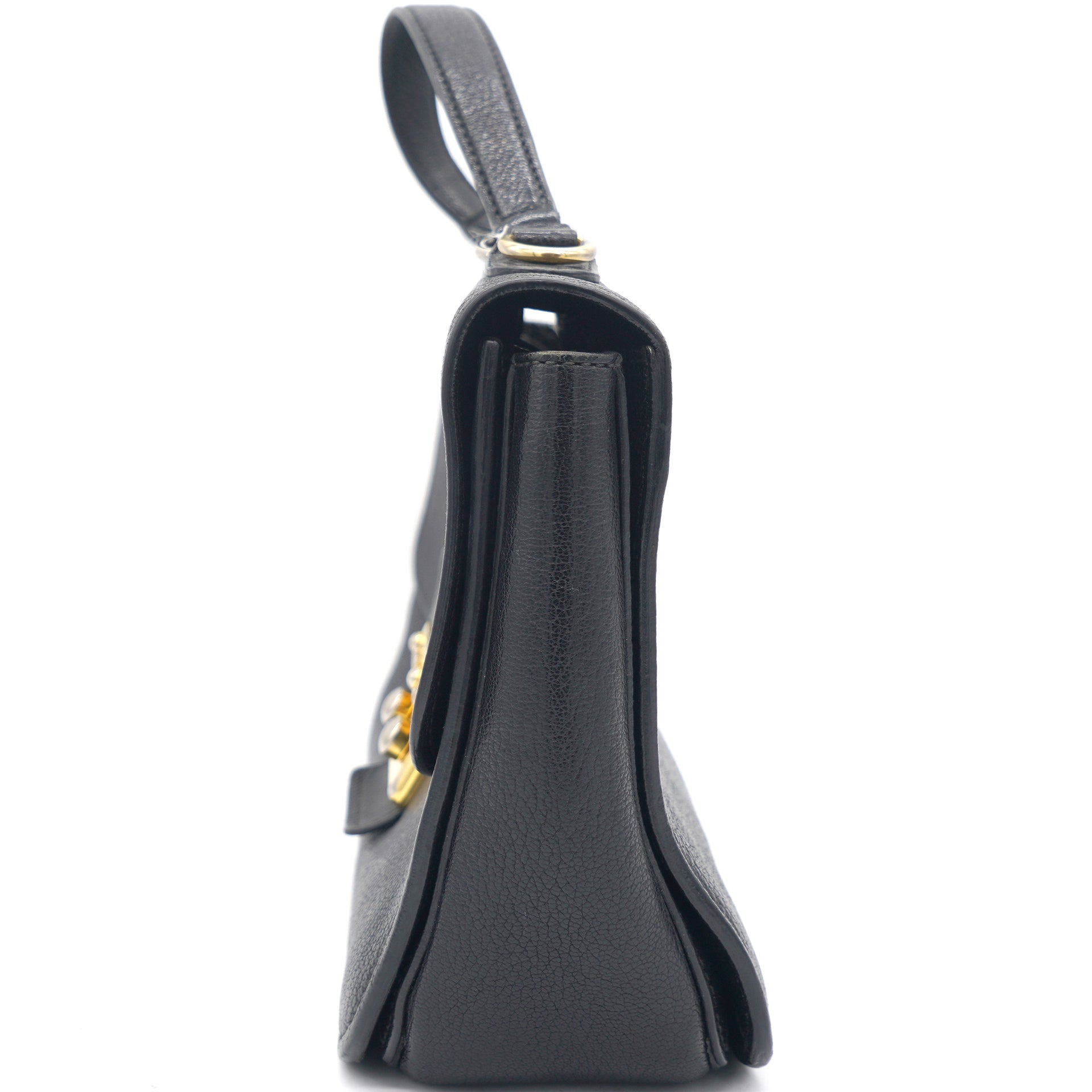 | This chic day to evening bag is crafted of luxurious goatskin leather in black. It features a frontal half flap with a brass press lock that opens to a partitioned beige interior with three storage compartments and a zipper pocket. This functional bag is also versatile, as it is accompanied by an optional shoulder strap. This is an excellent bag, ideal for everyday use |