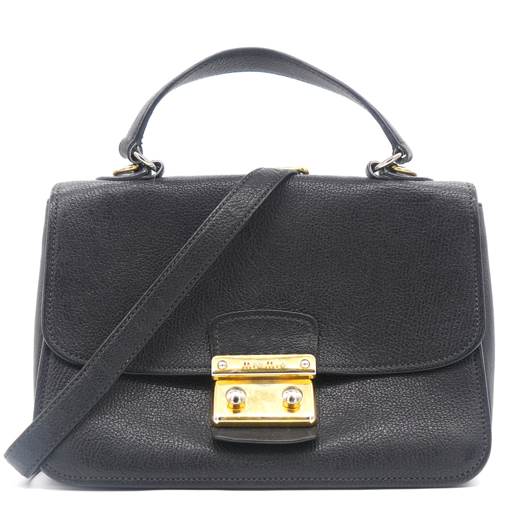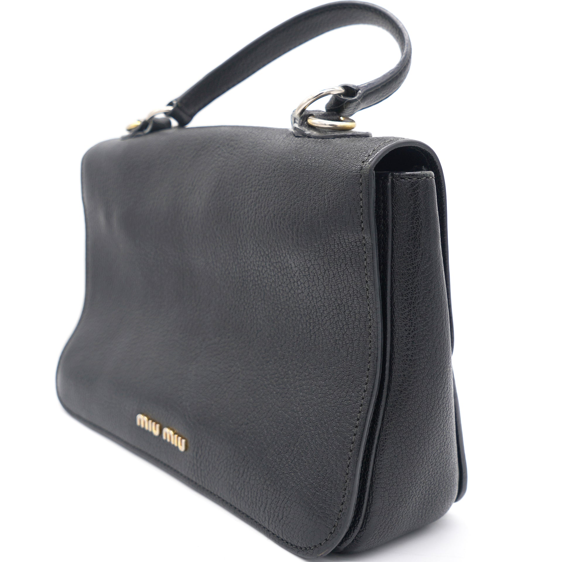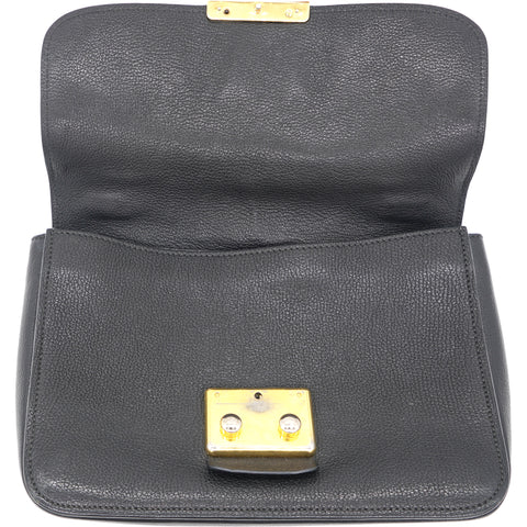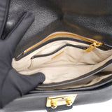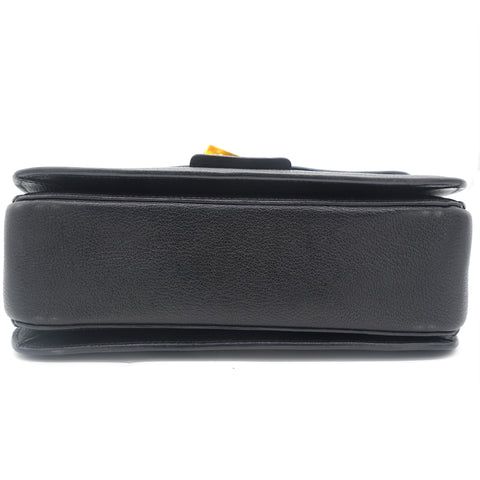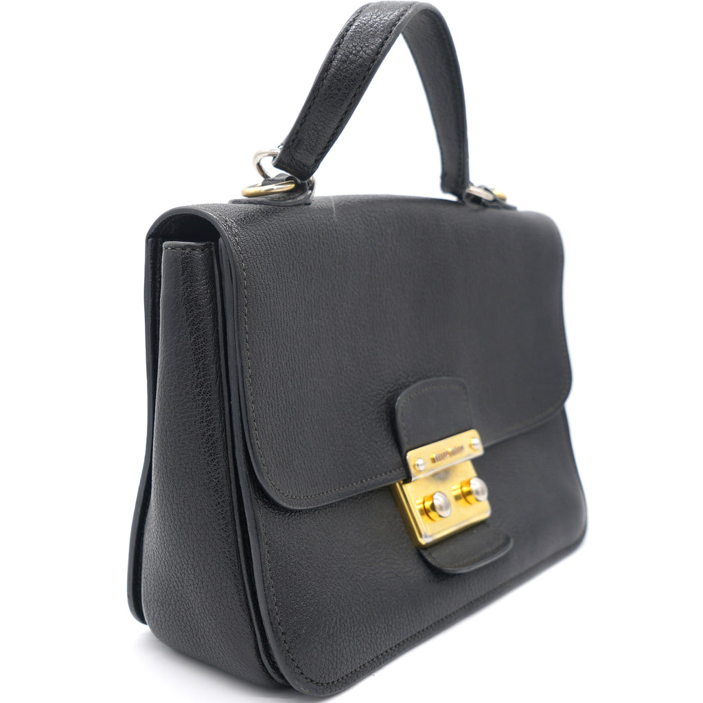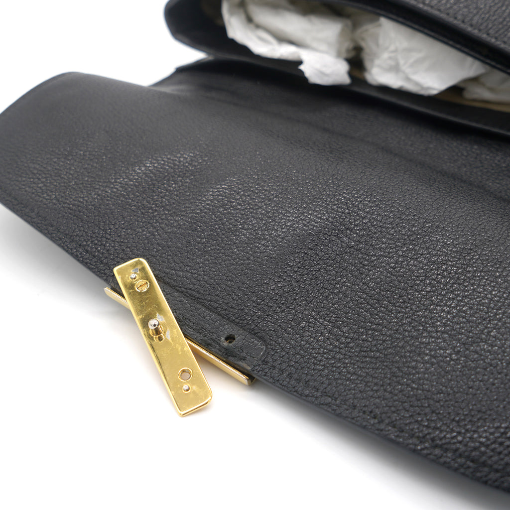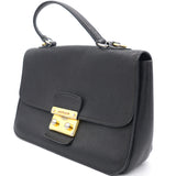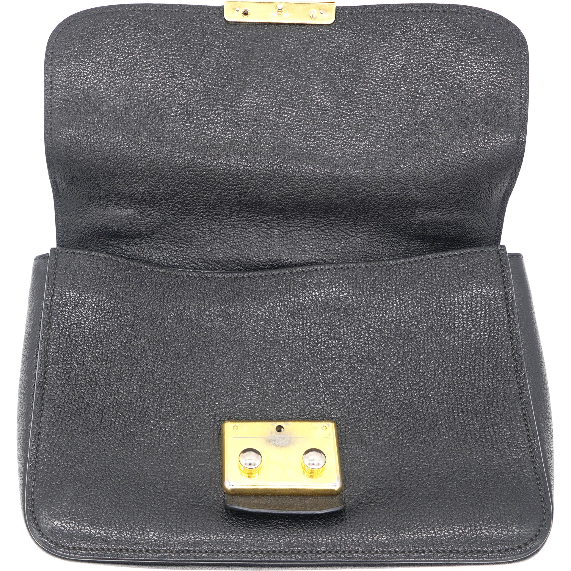 | This chic day to evening bag is crafted of luxurious goatskin leather in black. It features a frontal half flap with a brass press lock that opens to a partitioned beige interior with three storage compartments and a zipper pocket. This functional bag is also versatile, as it is accompanied by an optional shoulder strap. This is an excellent bag, ideal for everyday use |