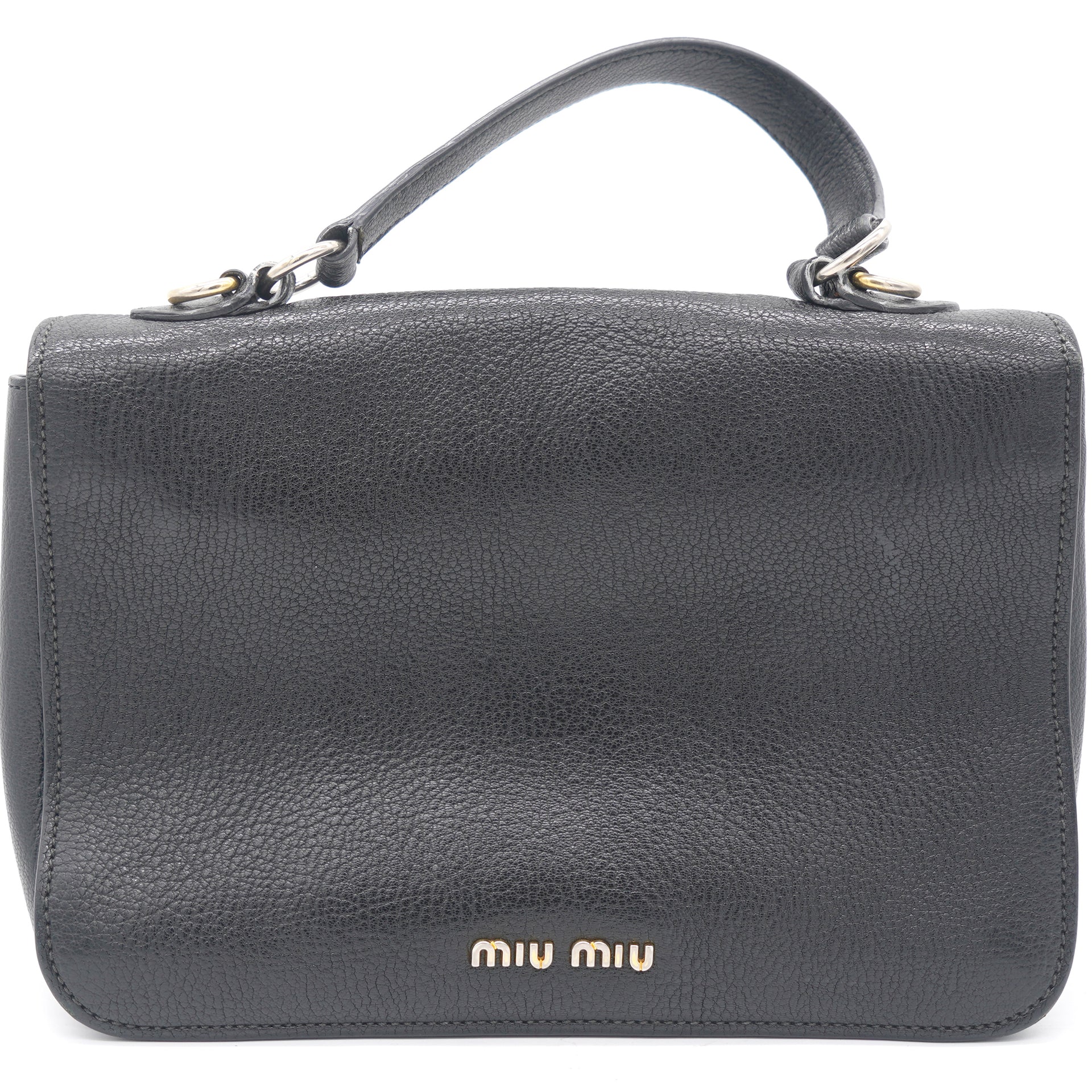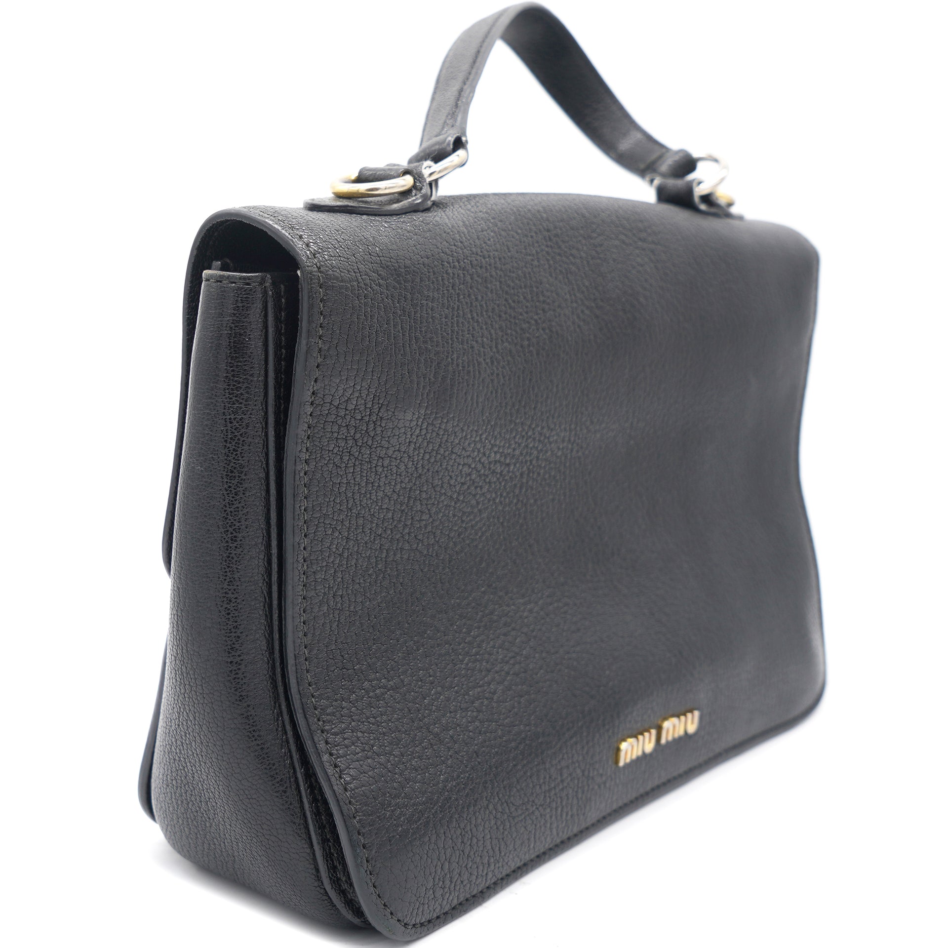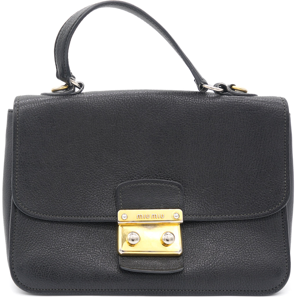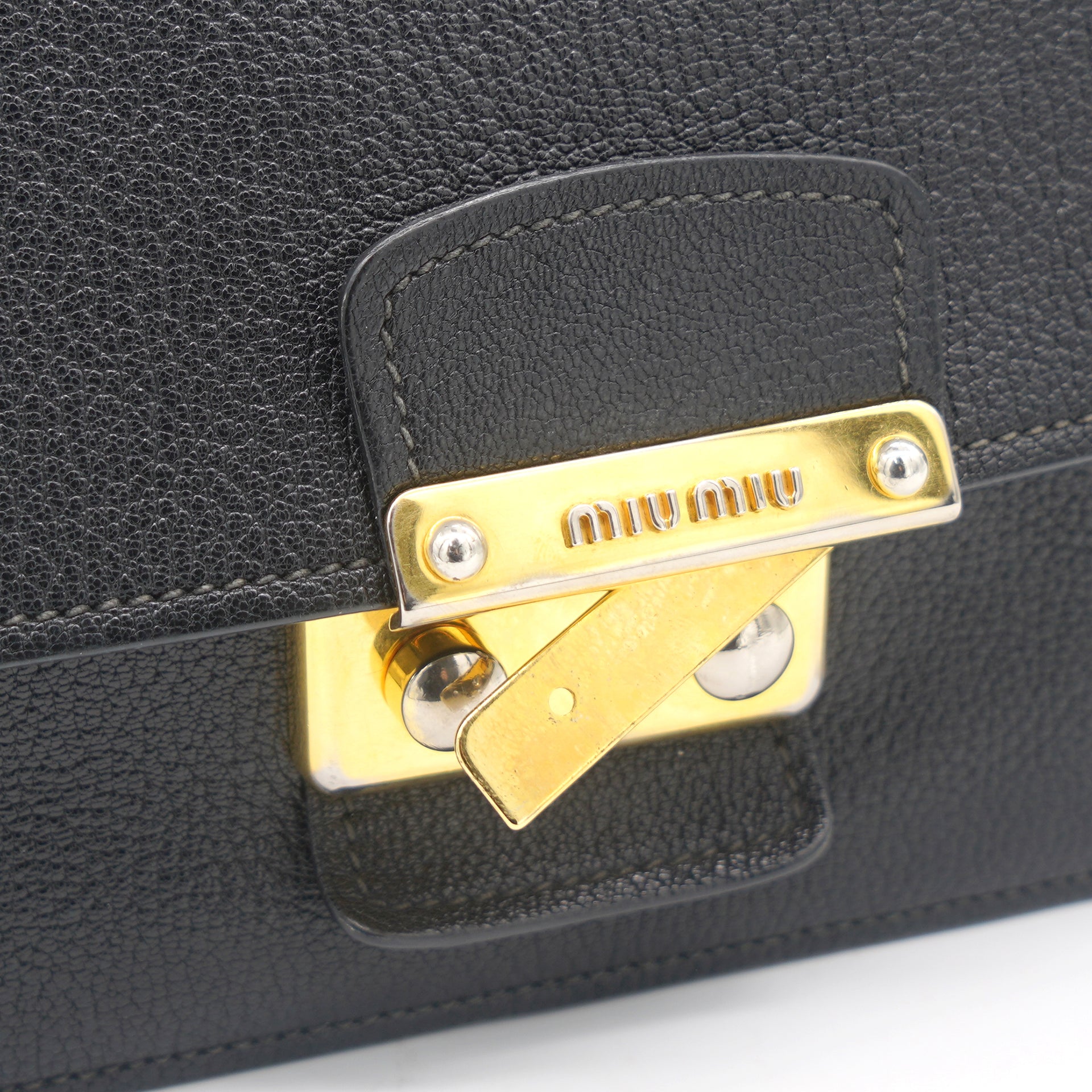 | This chic day to evening bag is crafted of luxurious goatskin leather in black. It features a frontal half flap with a brass press lock that opens to a partitioned beige interior with three storage compartments and a zipper pocket. This functional bag is also versatile, as it is accompanied by an optional shoulder strap. This is an excellent bag, ideal for everyday use |