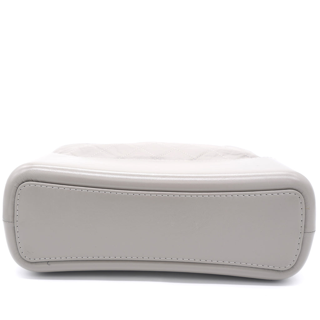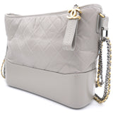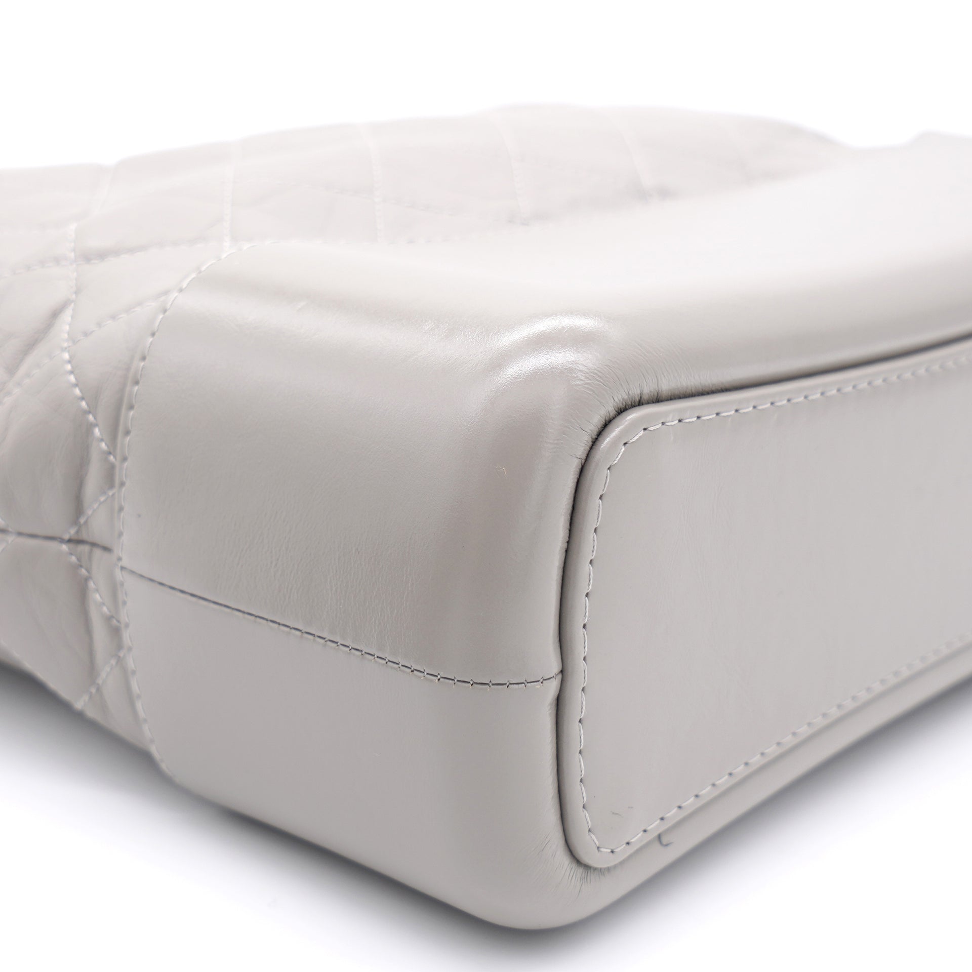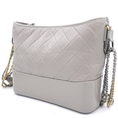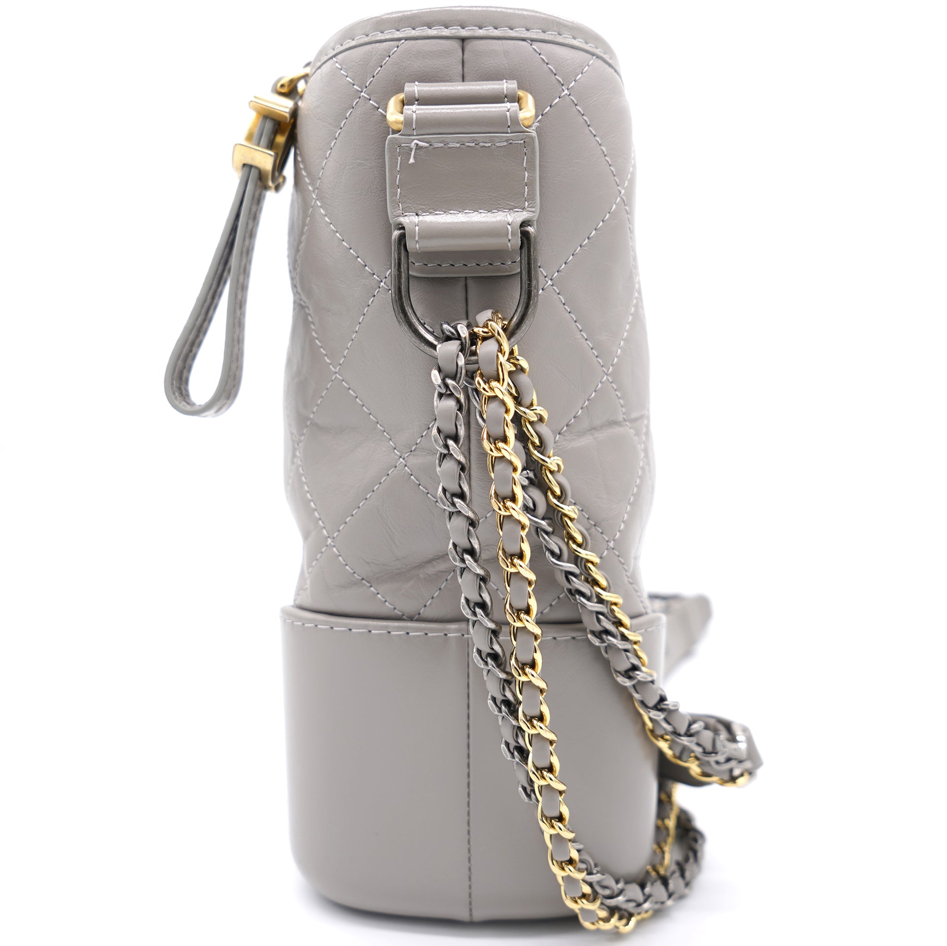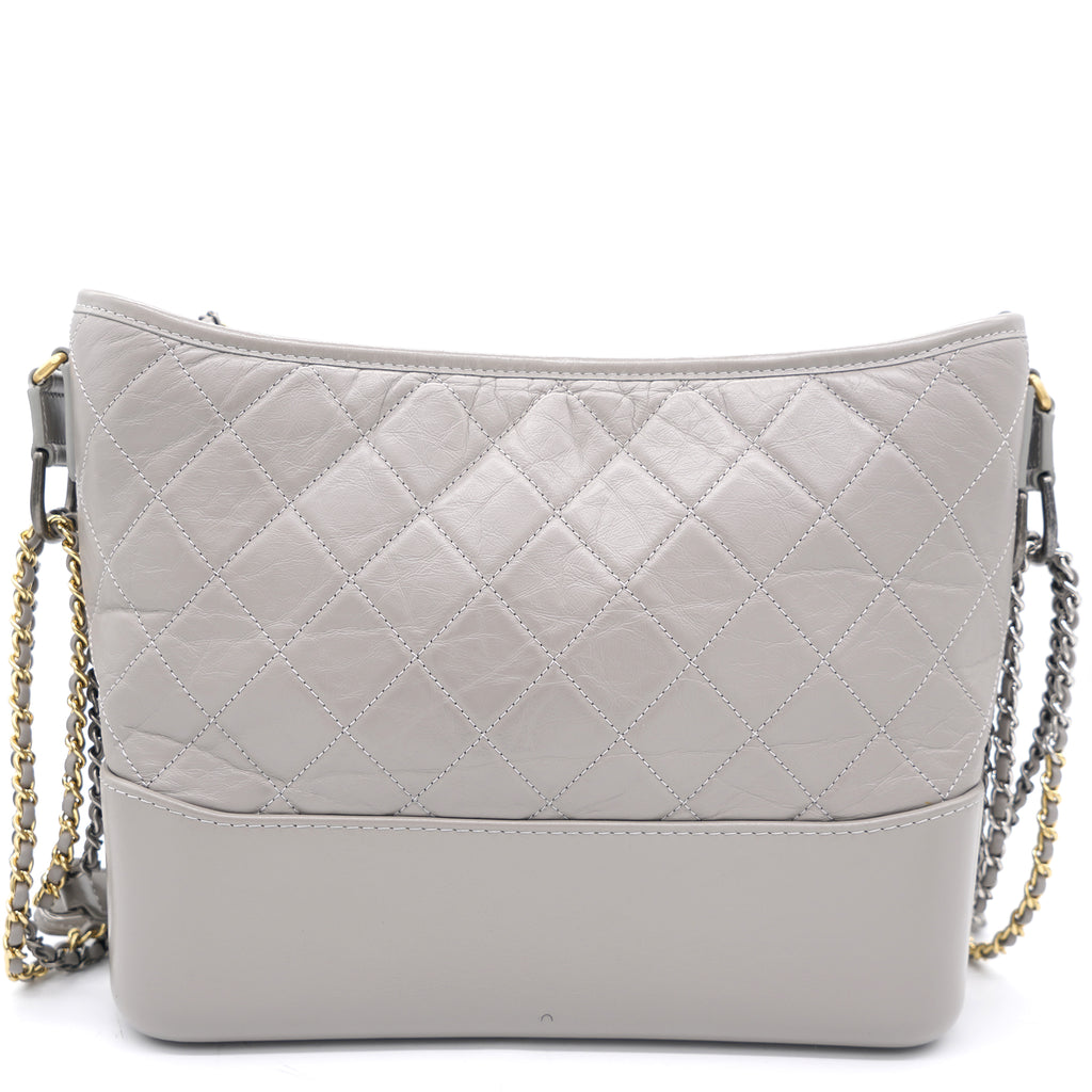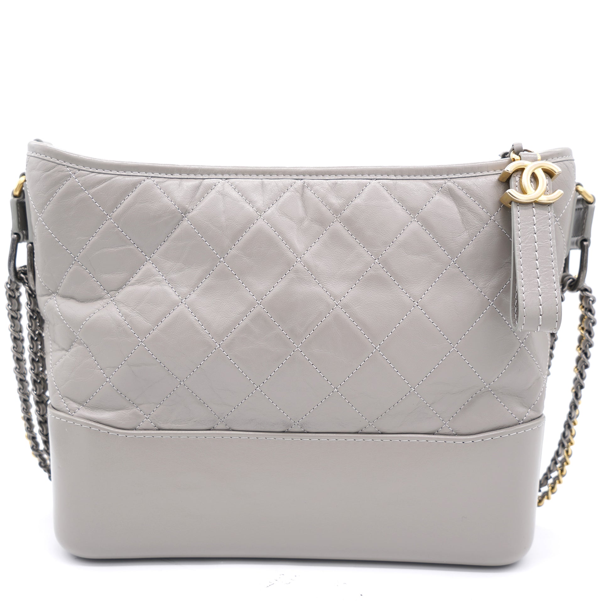 | Chanel’s newest silhouette, the Gabrielle, in Quilted Aged Calfskin Leather. Intentionally “distressed” grey aged calfskin with signature Chanel grey quilting on top portion and smooth lower body. Multitoned hardware double straps combine aged-gold metal with grey leather. May be carried single or double, on the shoulder or cross the body. Zippered top accesses the grey fabric interior. |