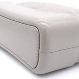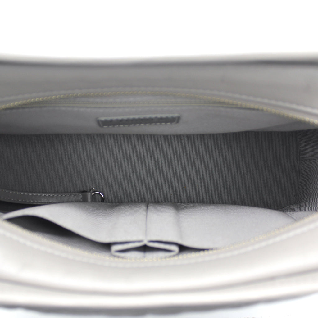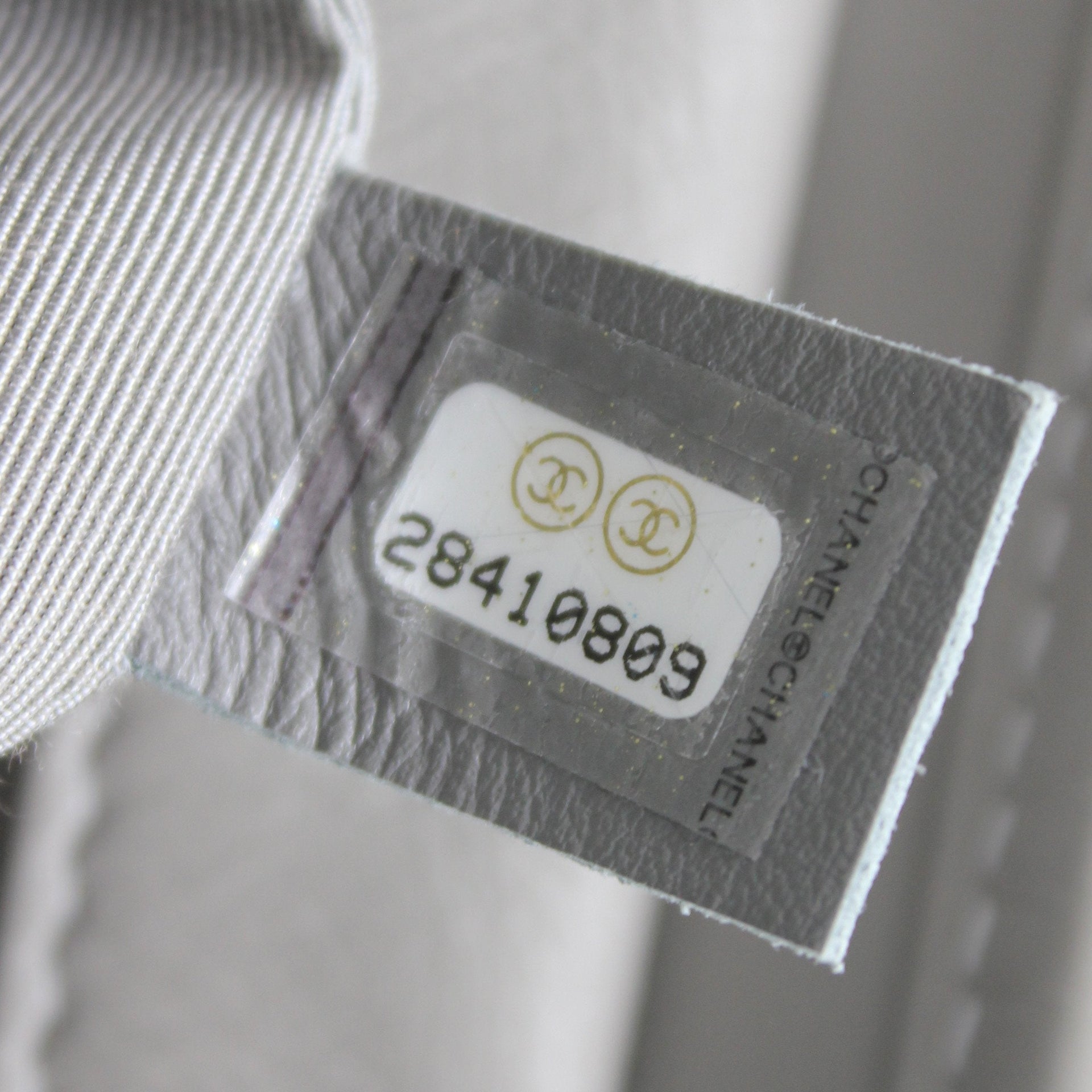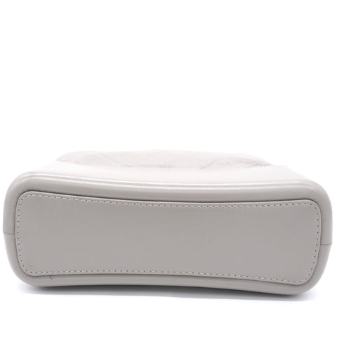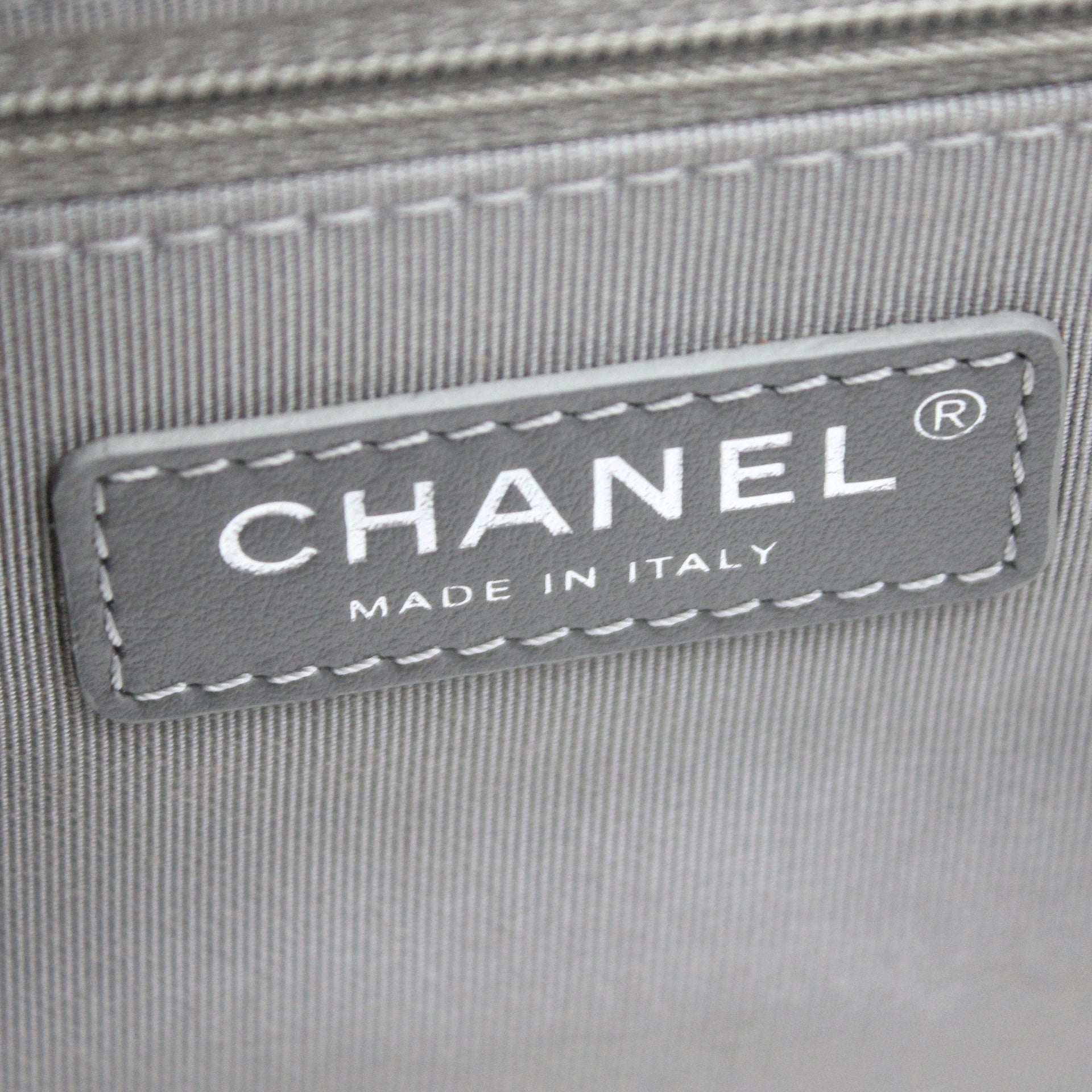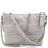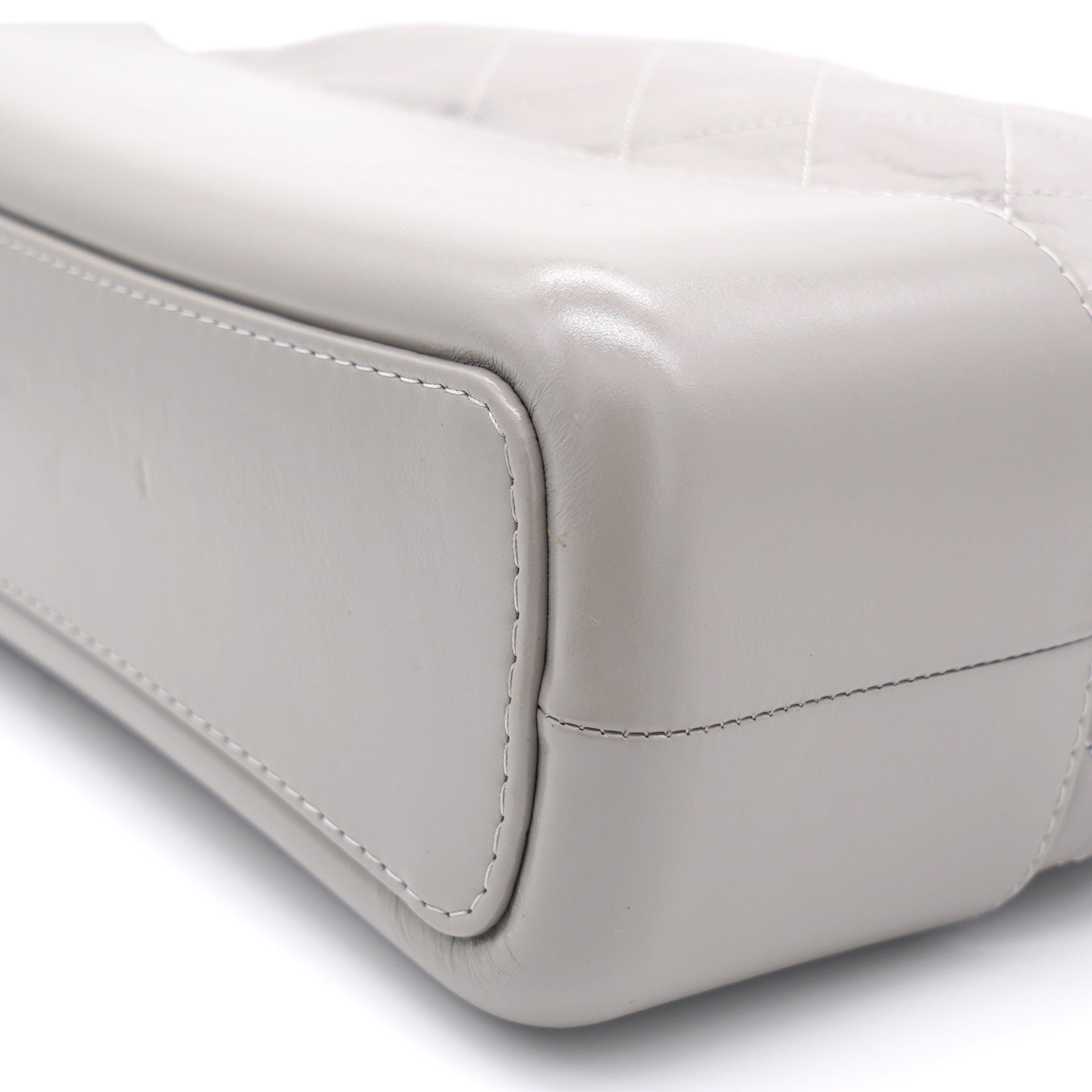 | Chanel’s newest silhouette, the Gabrielle, in Quilted Aged Calfskin Leather. Intentionally “distressed” grey aged calfskin with signature Chanel grey quilting on top portion and smooth lower body. Multitoned hardware double straps combine aged-gold metal with grey leather. May be carried single or double, on the shoulder or cross the body. Zippered top accesses the grey fabric interior. |