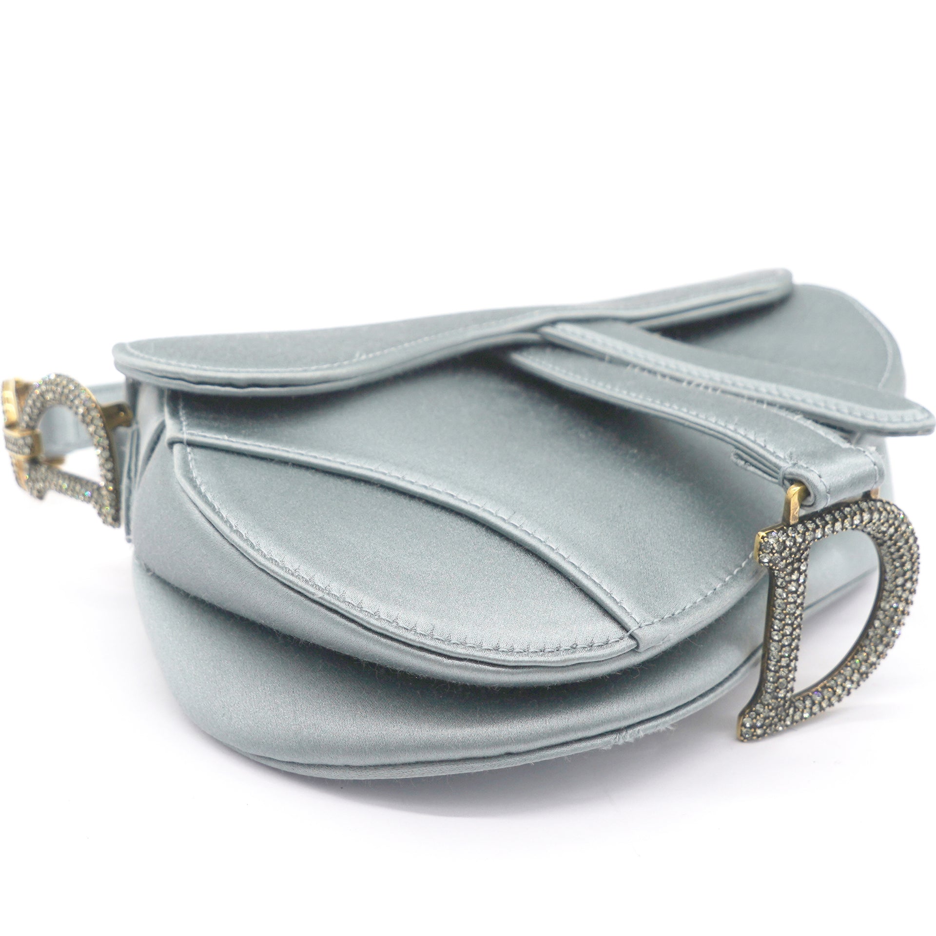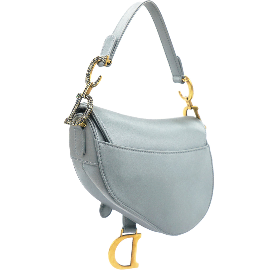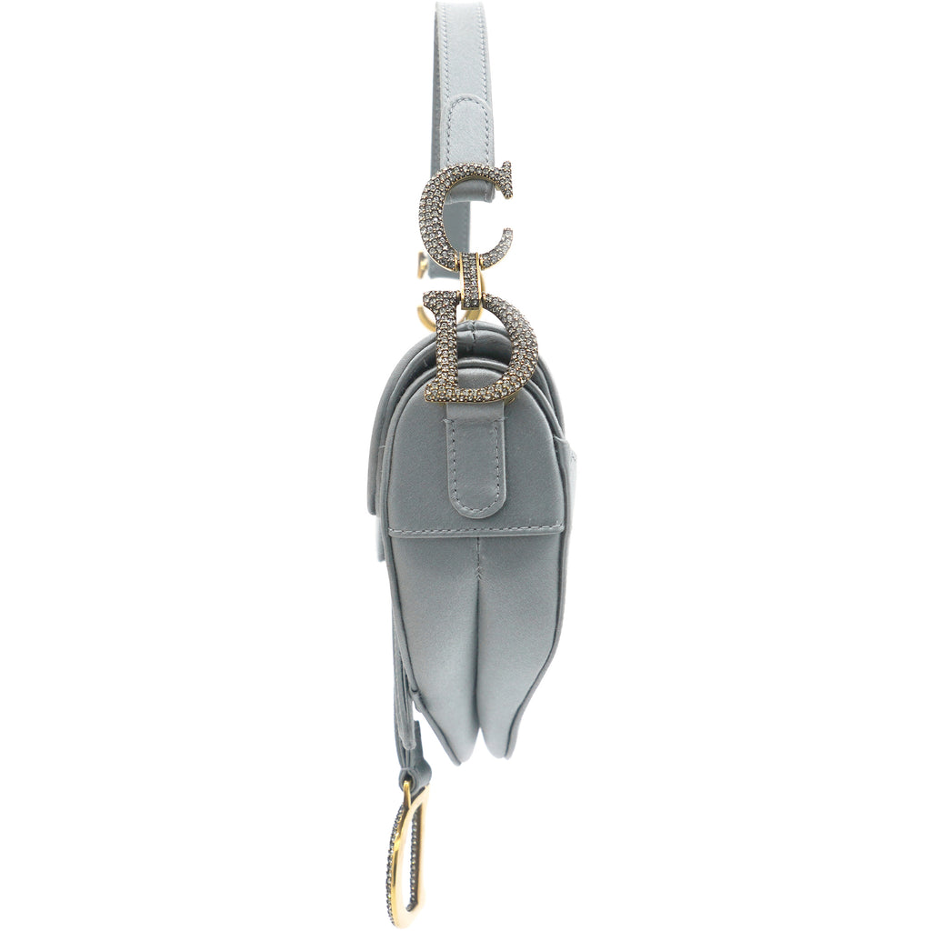 | This distinctive Dior contemporary classic features the saddlebag style in grey satin with a front flap. It has a short grey satin material shoulder strap with an aged gold with crystals "C" and "D" on either end of the handle for handle rings, and a prominent hanging Dior "D" charm. The interior of the bag is grey satin material as well. |