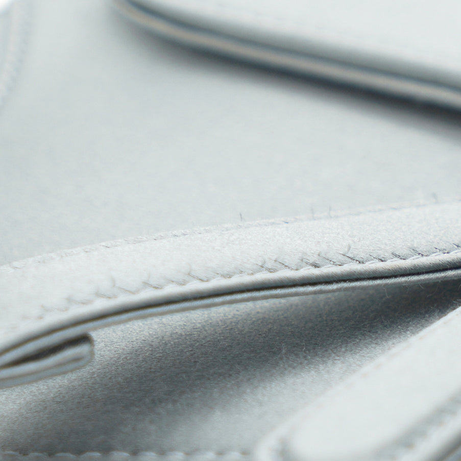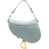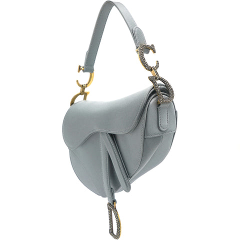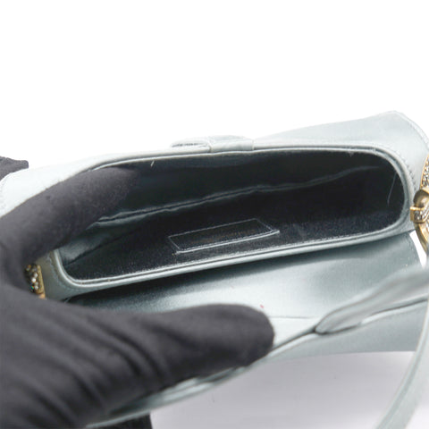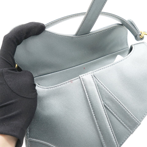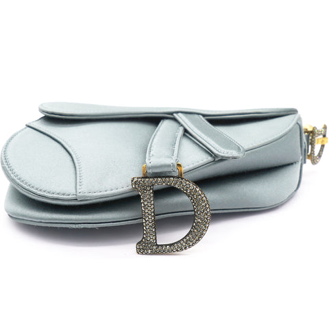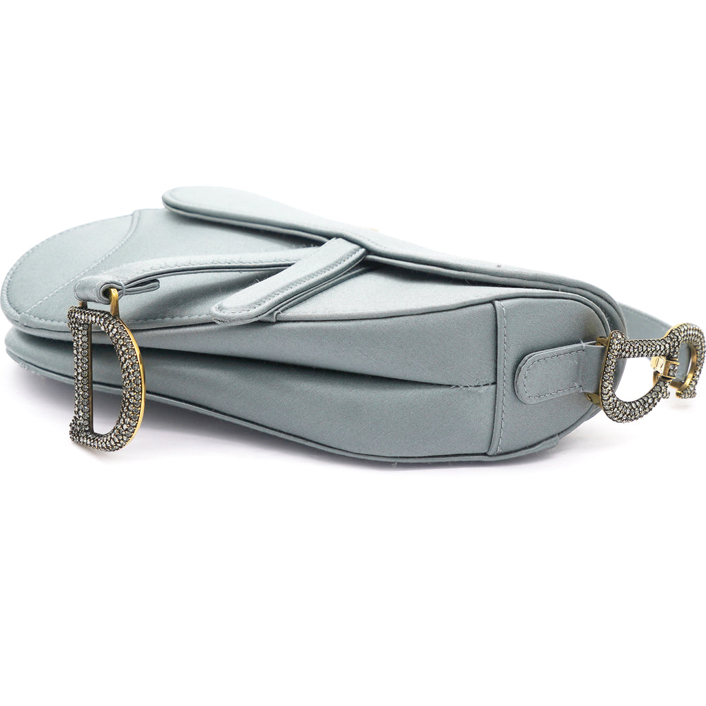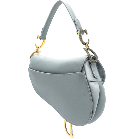 | This distinctive Dior contemporary classic features the saddlebag style in grey satin with a front flap. It has a short grey satin material shoulder strap with an aged gold with crystals "C" and "D" on either end of the handle for handle rings, and a prominent hanging Dior "D" charm. The interior of the bag is grey satin material as well. |