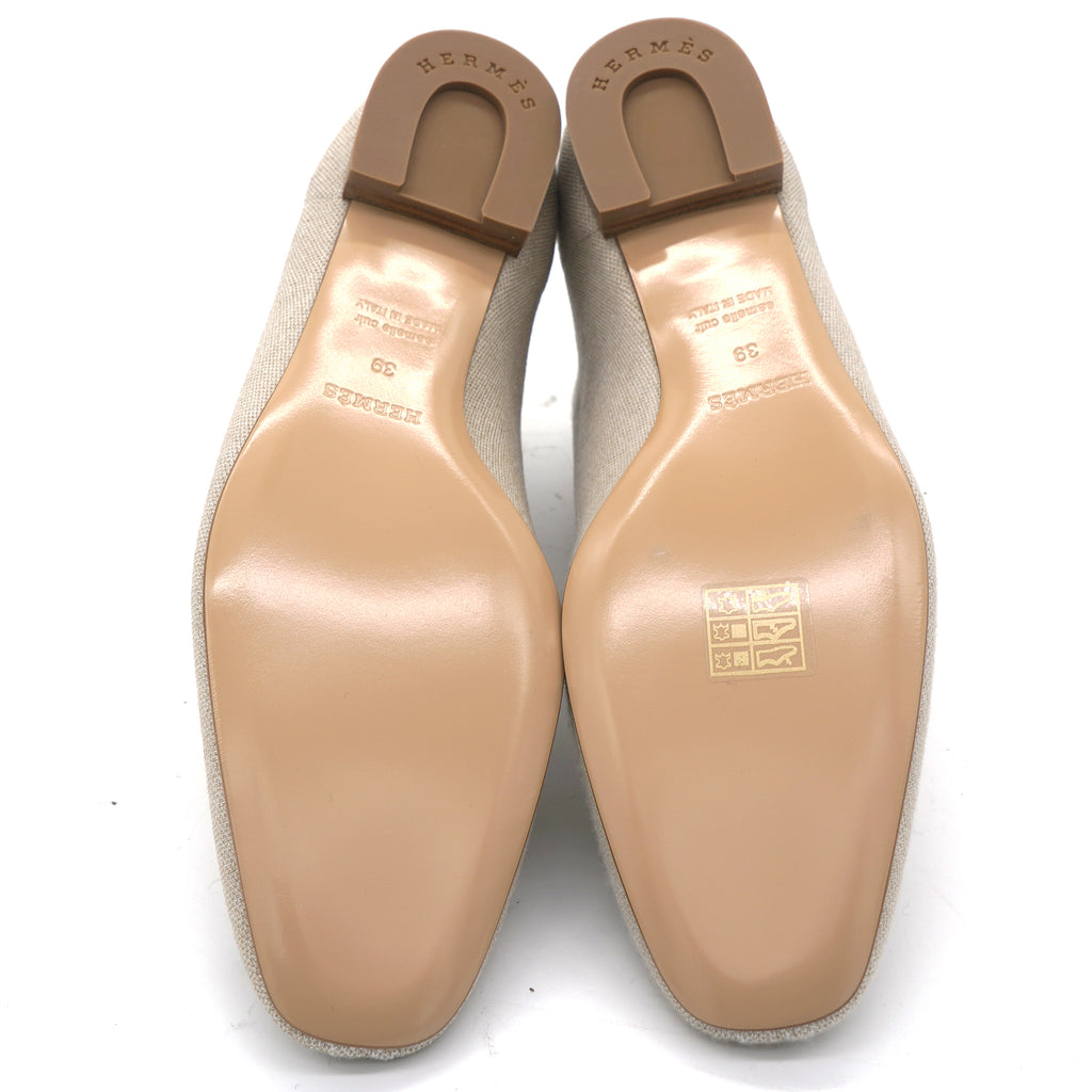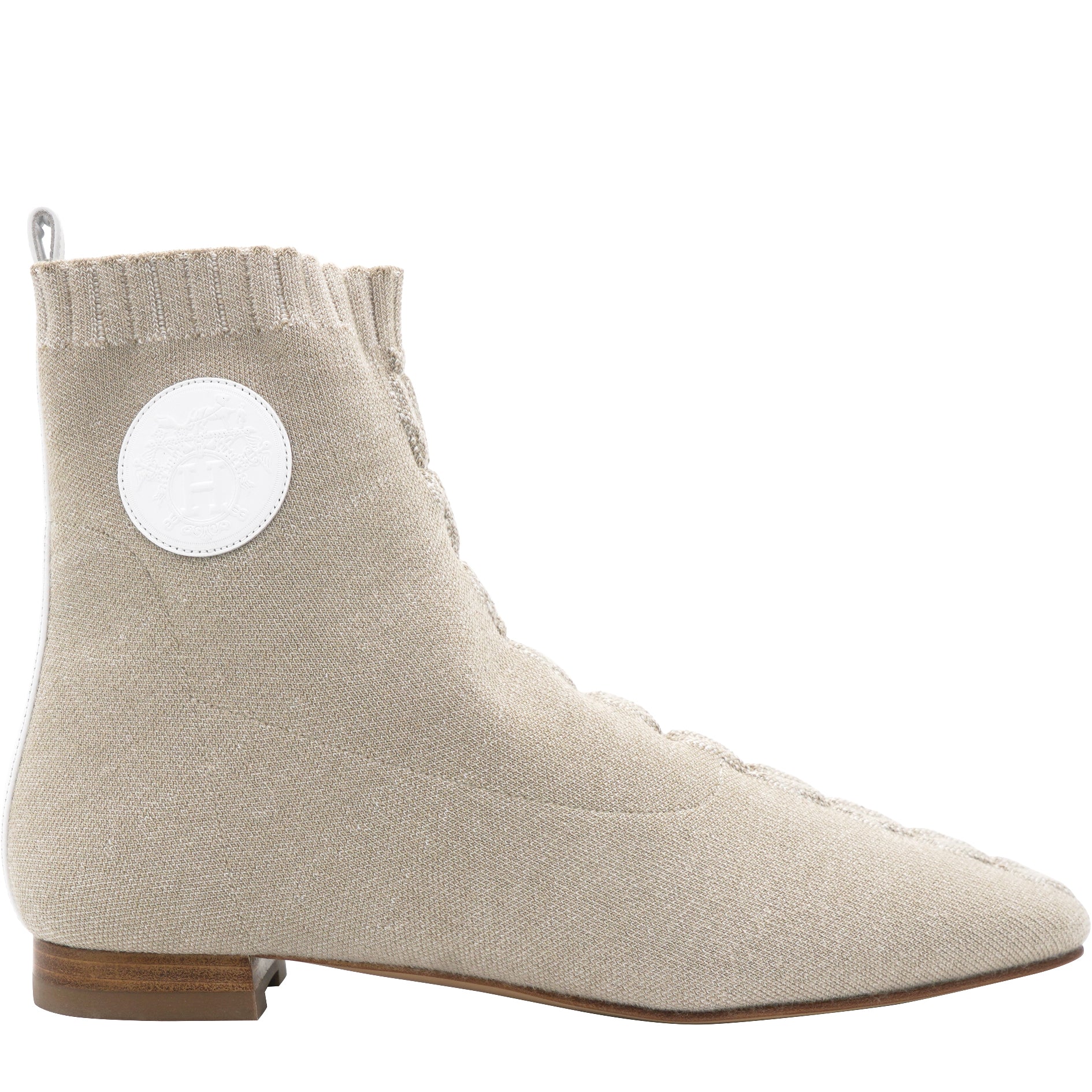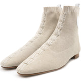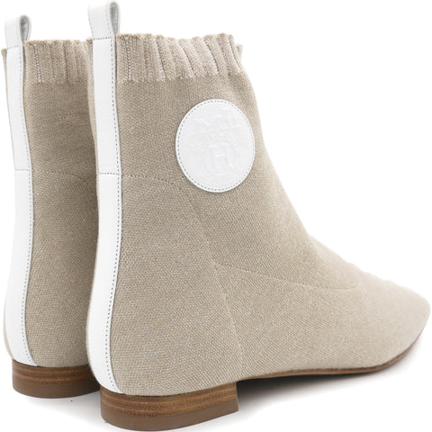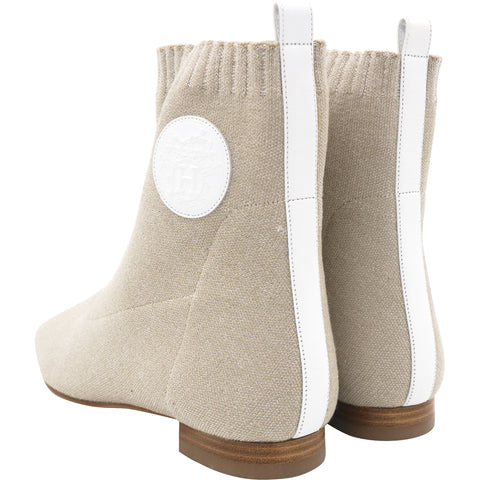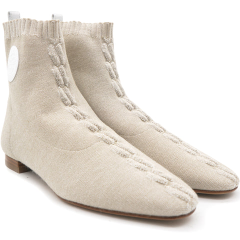 | These ankle boots are crafted of fine beige knit fabric. They feature a tapered, squared toe and a 2.5-inch stacked heel. |