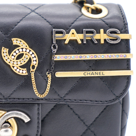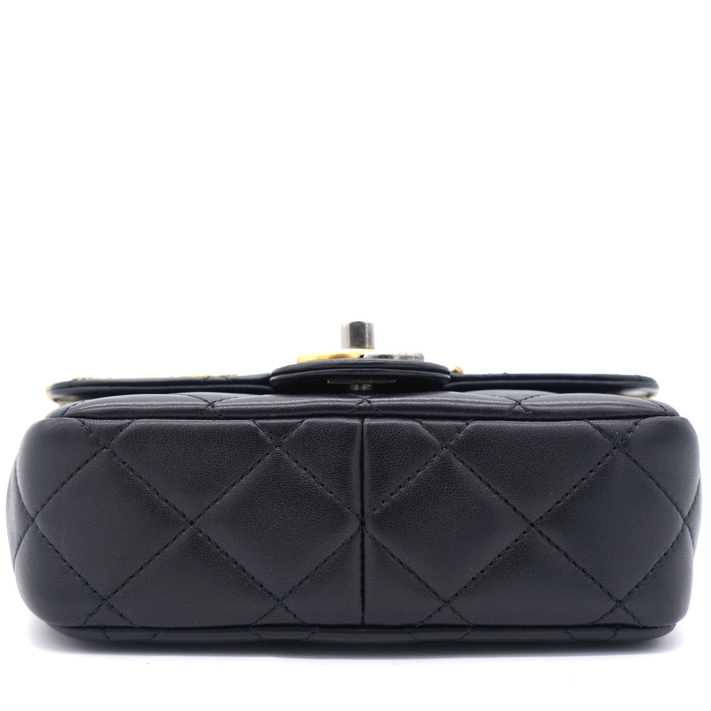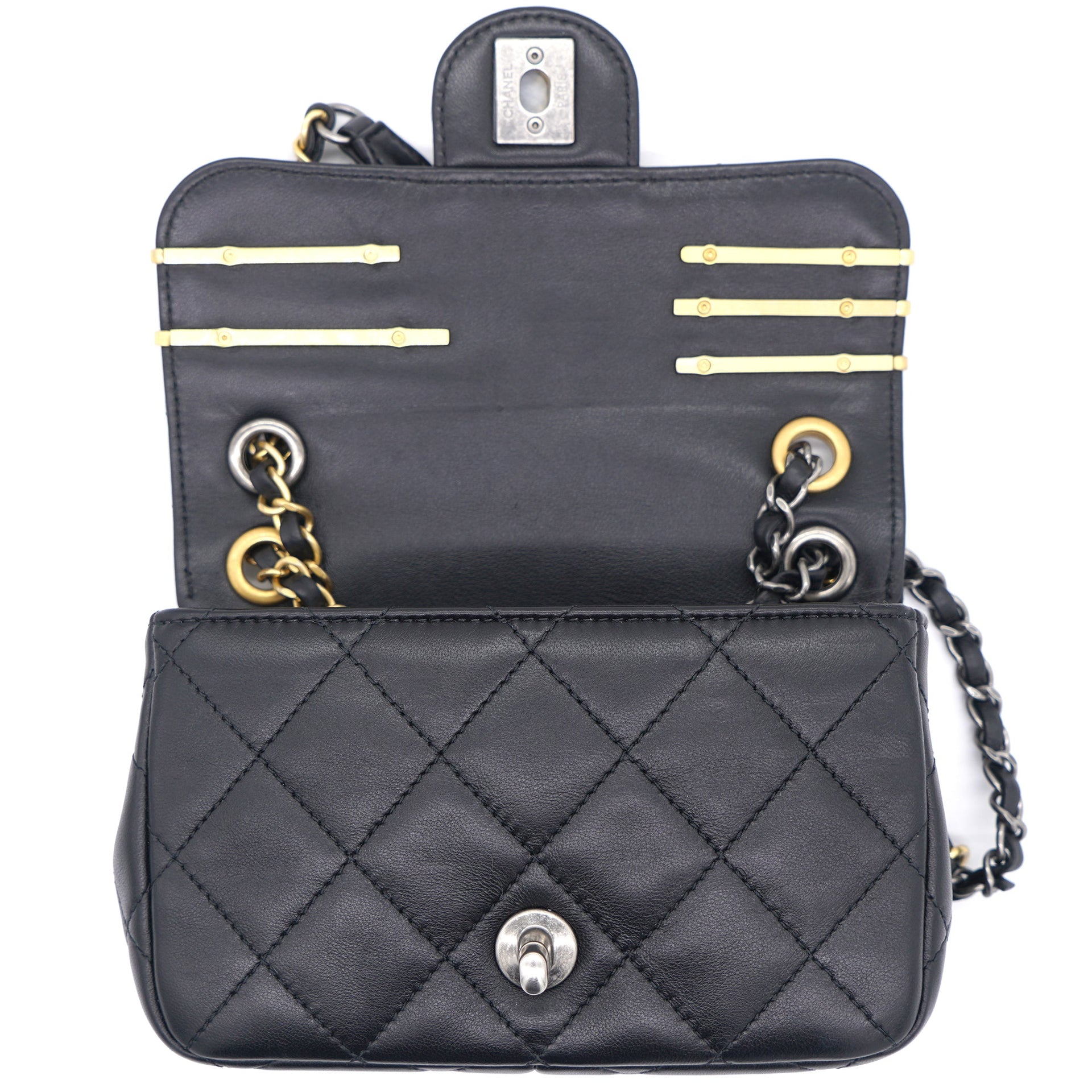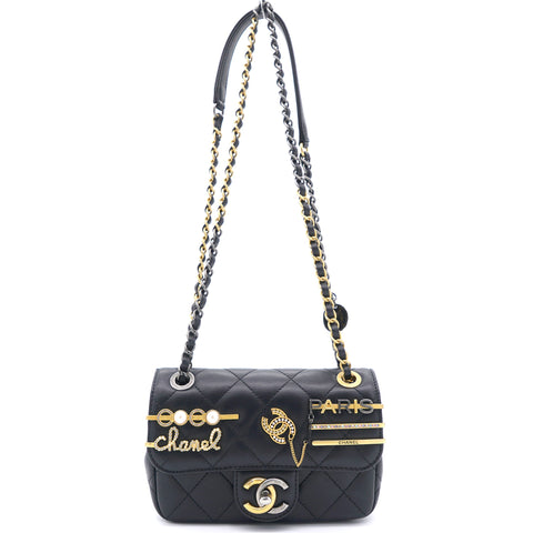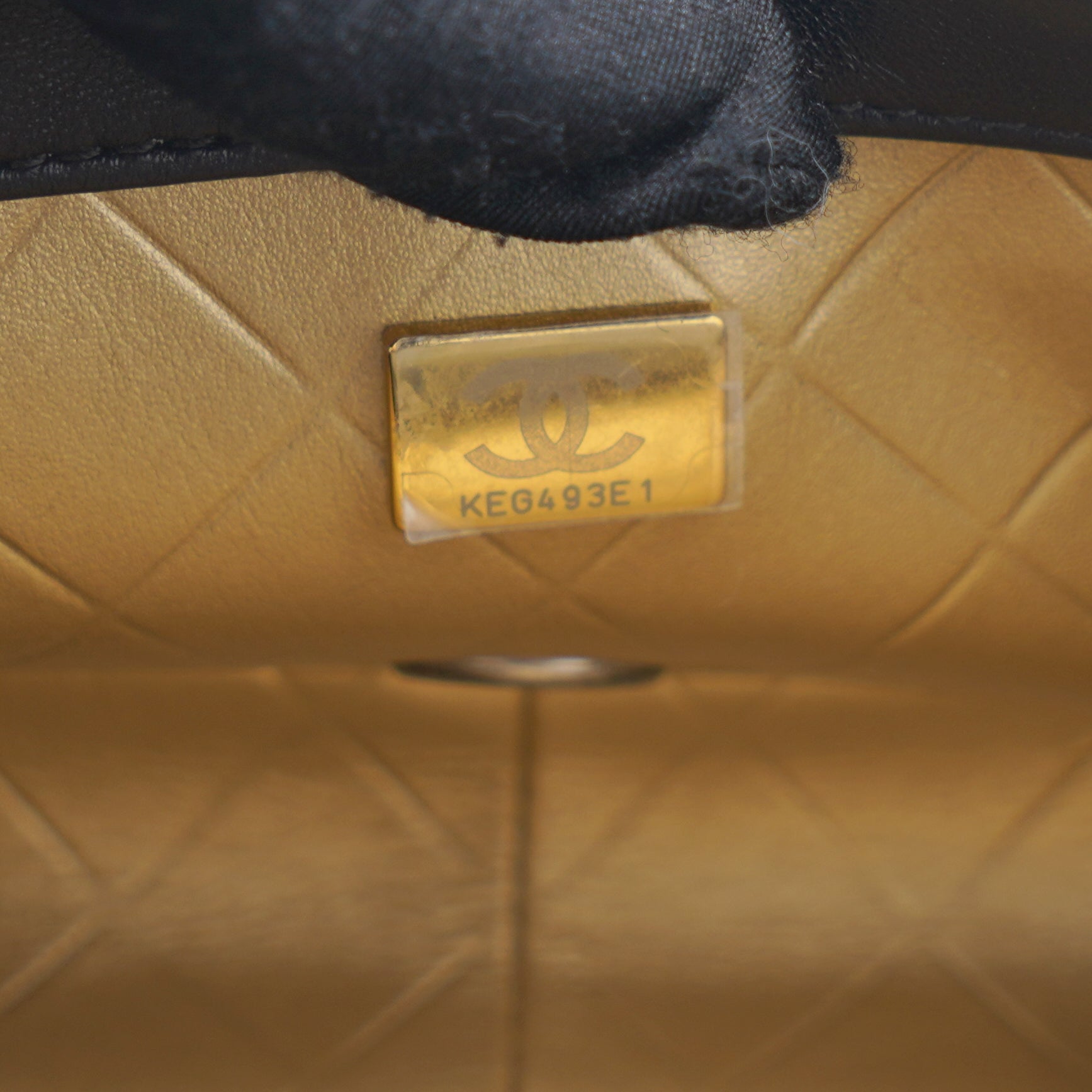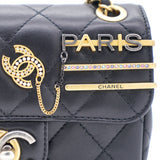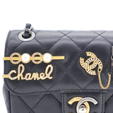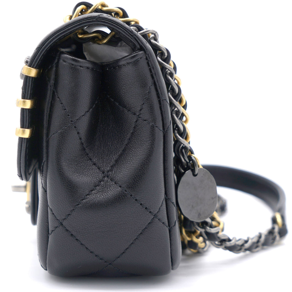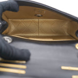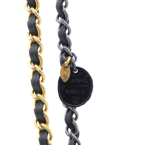 | This stylish clutch wallet is finely crafted of lambskin quilted leather. The bag features a large Chanel Interlocking CC logo in an aged gold and ruthenium chain link threaded with leather design, with a ruthenium and aged gold chain link shoulder strap threaded with leather. The CC turn lock opens to a contrasting gold leather with a flat pocket. |