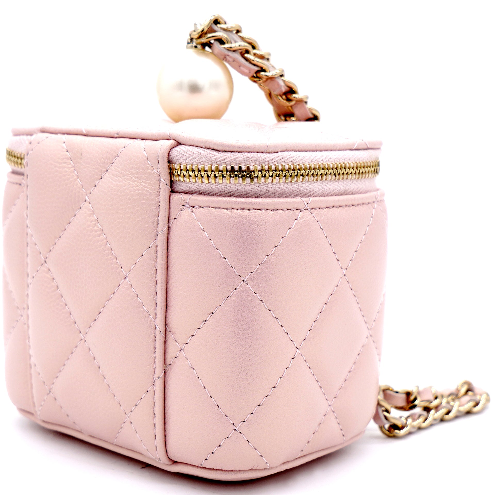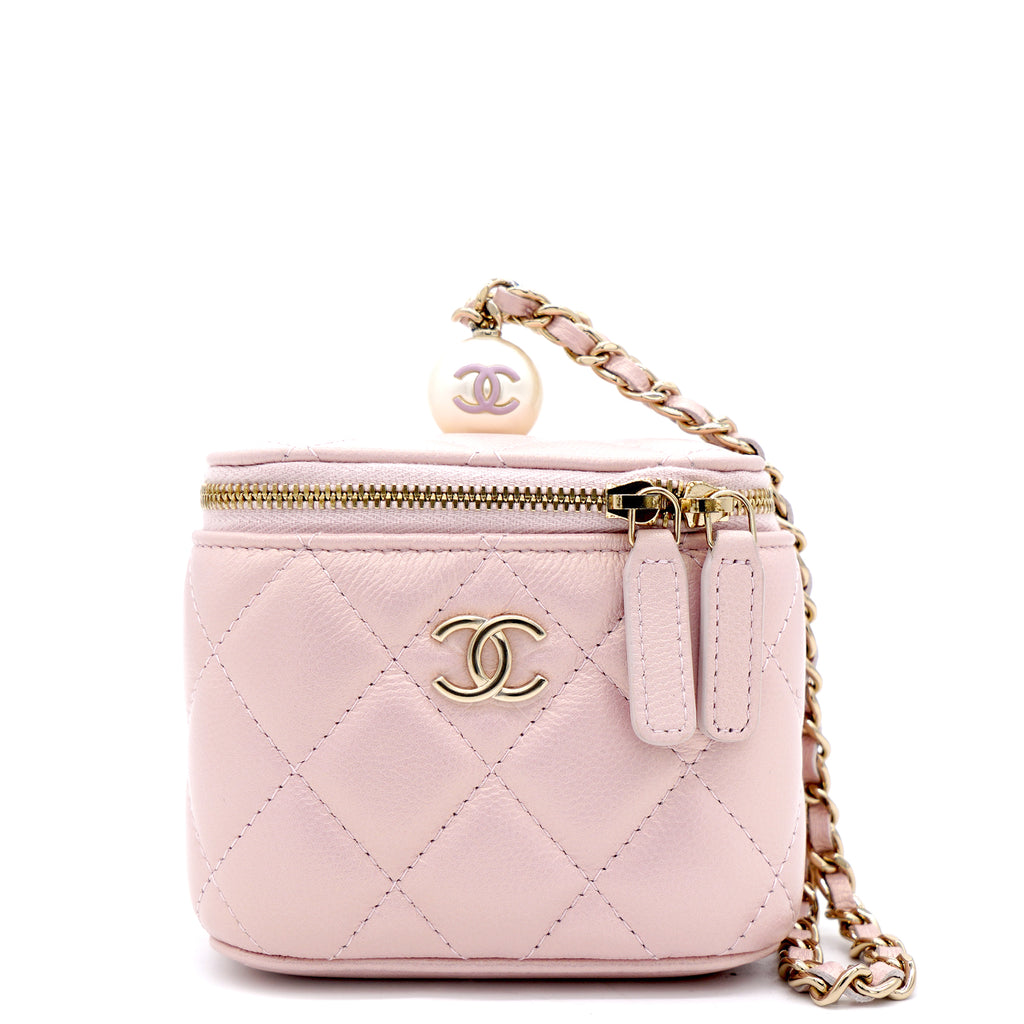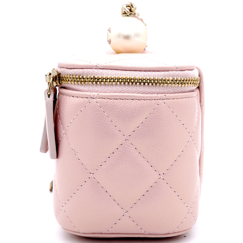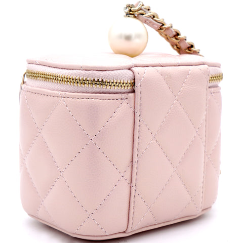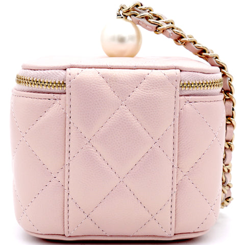 | This statement piece is crafted from the beautiful Caviar Leather adorned with pearl details on the handle and finished with champagne gold hardware, opening up to tonal colour fabric with lipstick compartment. |