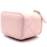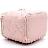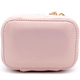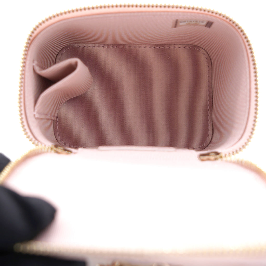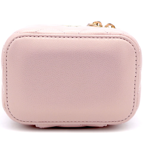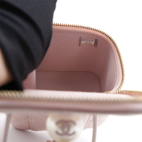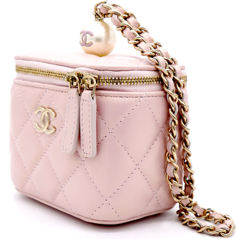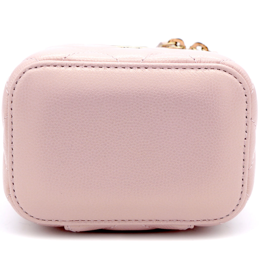 | This statement piece is crafted from the beautiful Caviar Leather adorned with pearl details on the handle and finished with champagne gold hardware, opening up to tonal colour fabric with lipstick compartment. |