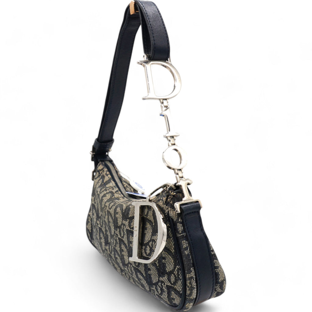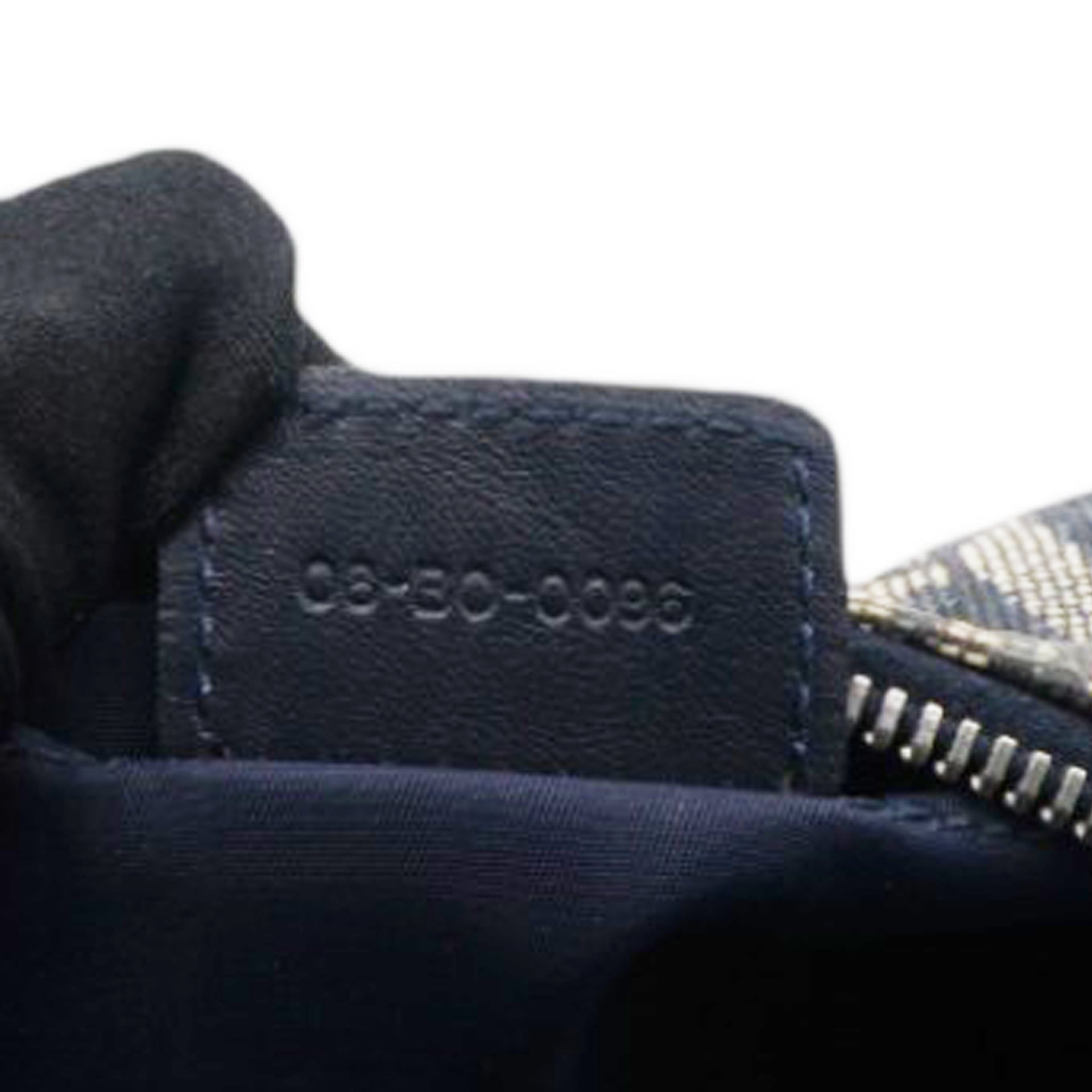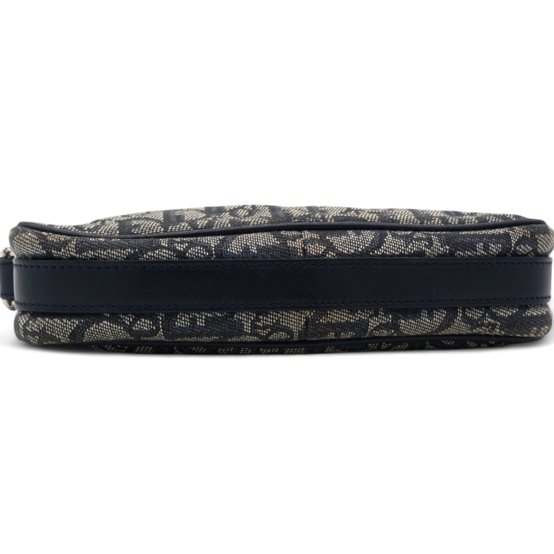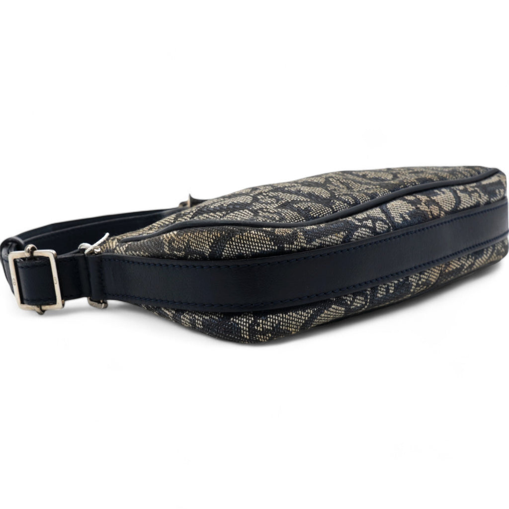| This throwback saddle bag is made of navy on blue Dior monogram canvas. The bag features blue cowhide leather trim including an adjustable looping handle and silver hardware. The top zipper opens to a steel blue fabric interior with a patched pocket. |