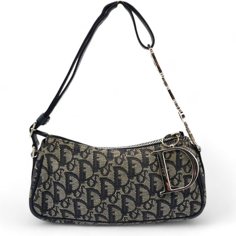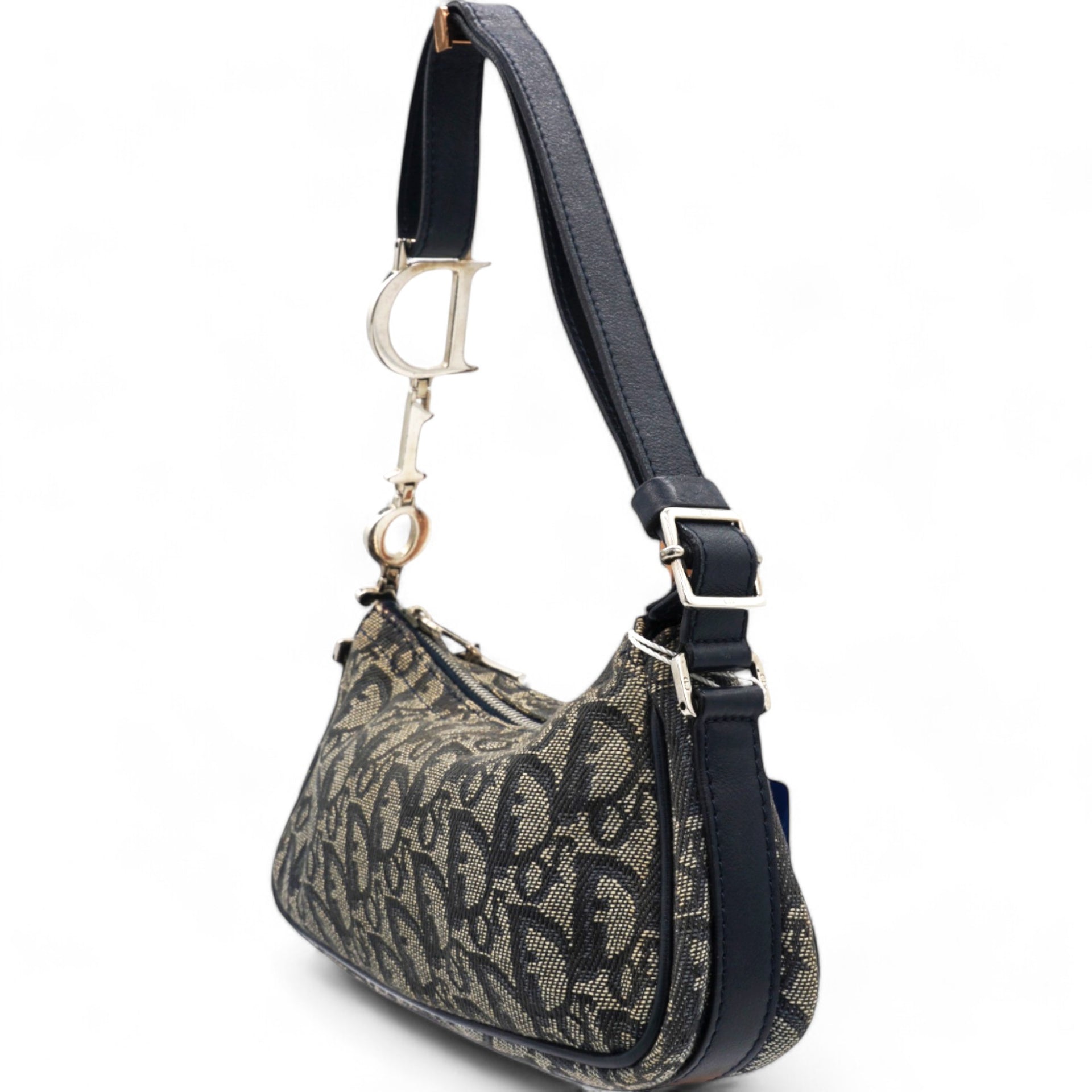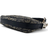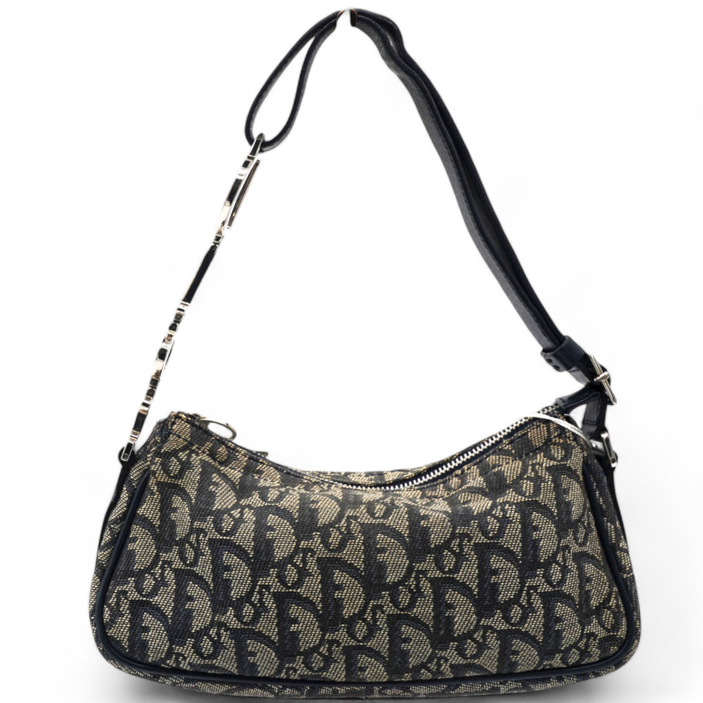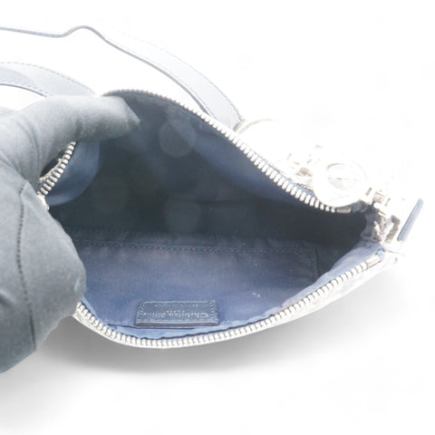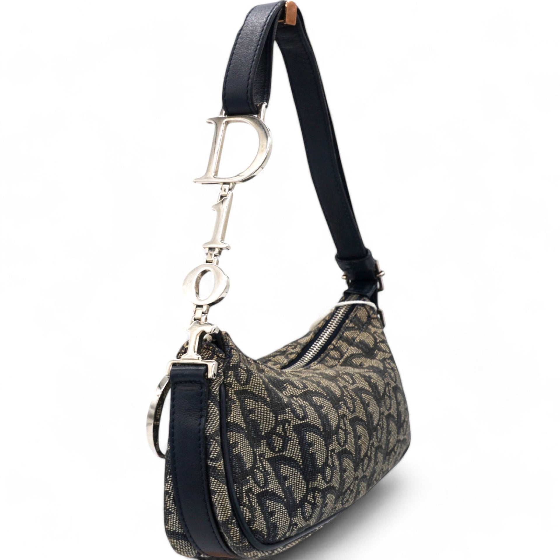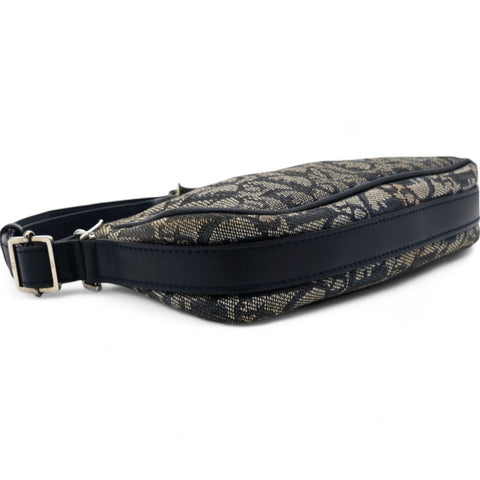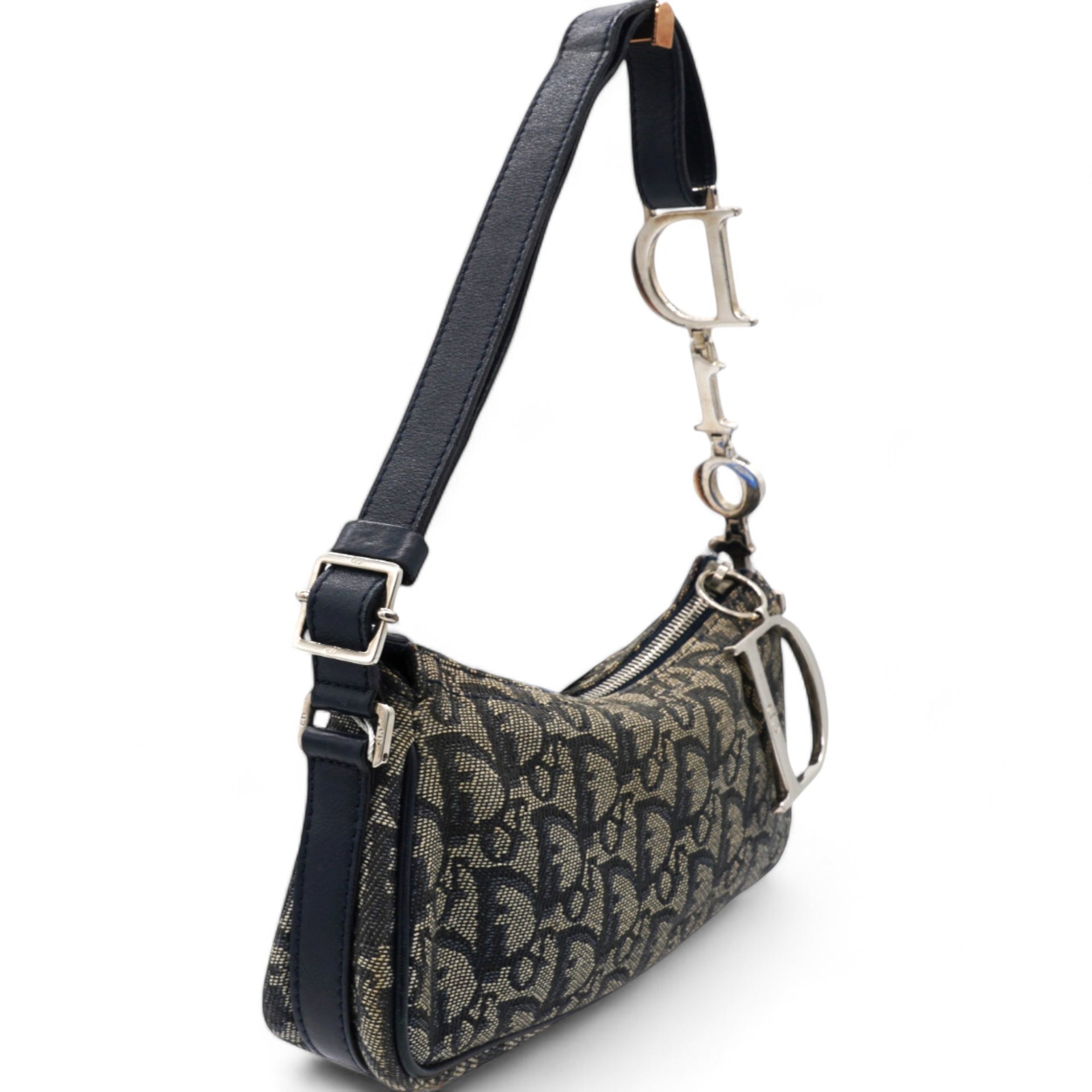 | This throwback saddle bag is made of navy on blue Dior monogram canvas. The bag features blue cowhide leather trim including an adjustable looping handle and silver hardware. The top zipper opens to a steel blue fabric interior with a patched pocket. |