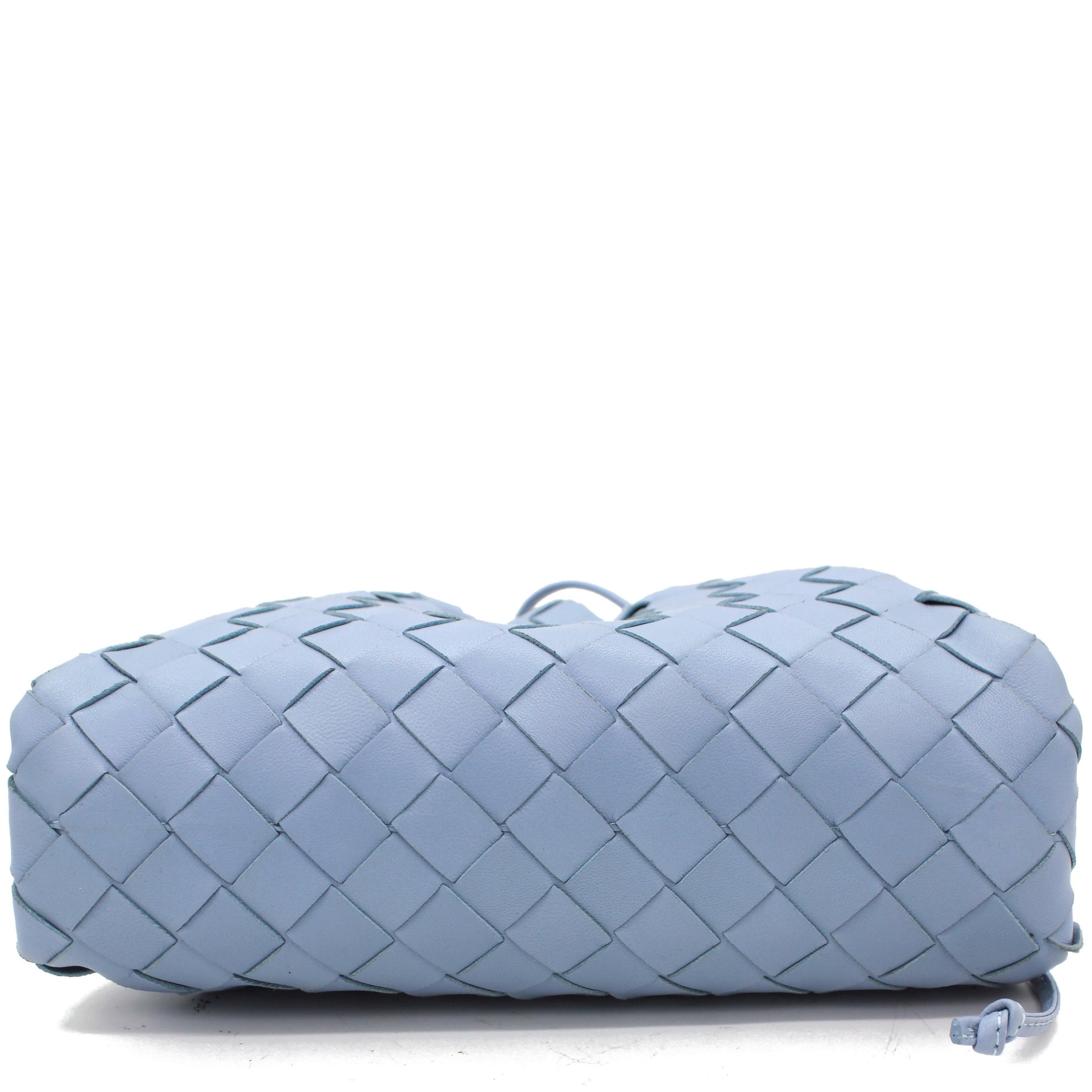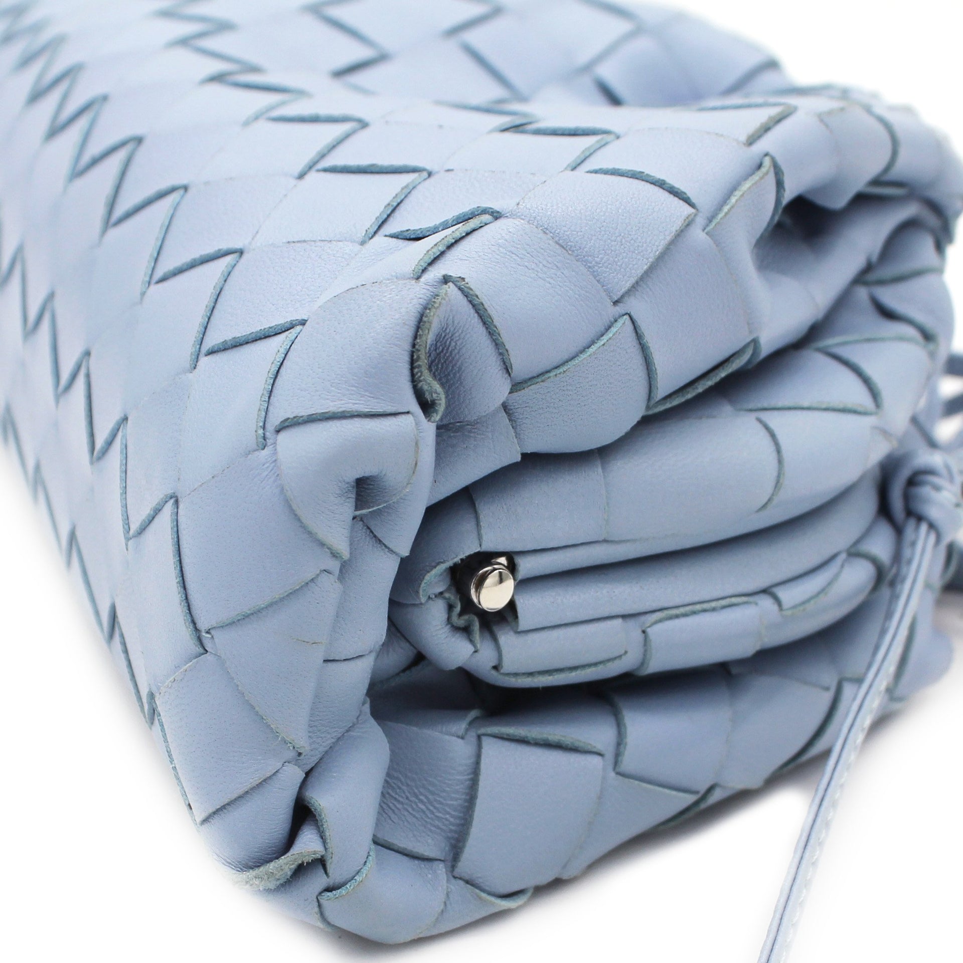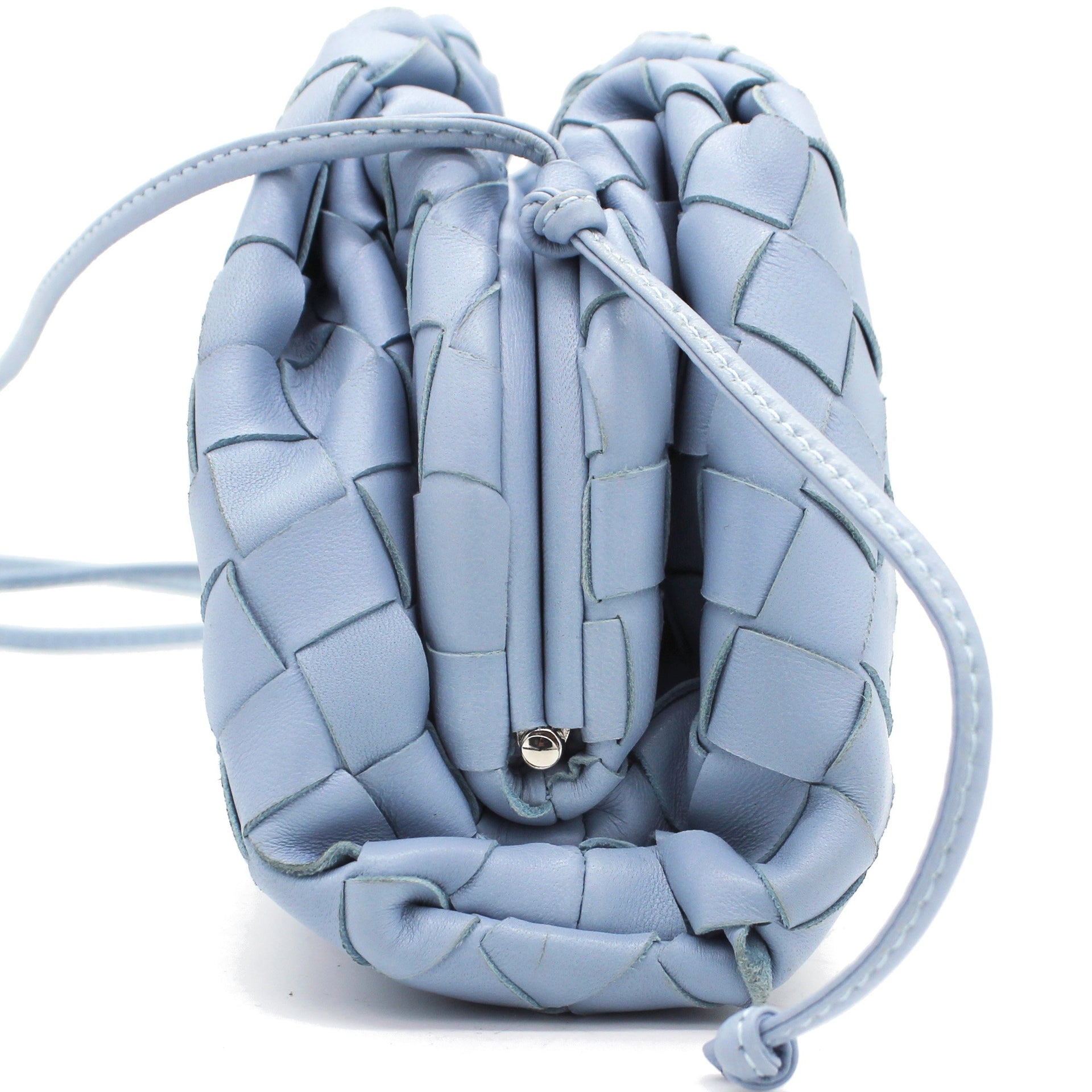 | This petite shoulder bag is crafted of woven lambskin leather in blue. The bag features a long, thin leather shoulder strap, and a magnetic top frame that opens to a smooth white leather interior. Enjoy the chic sophistication of Bottega Veneta with this beautiful shoulder bag |