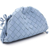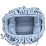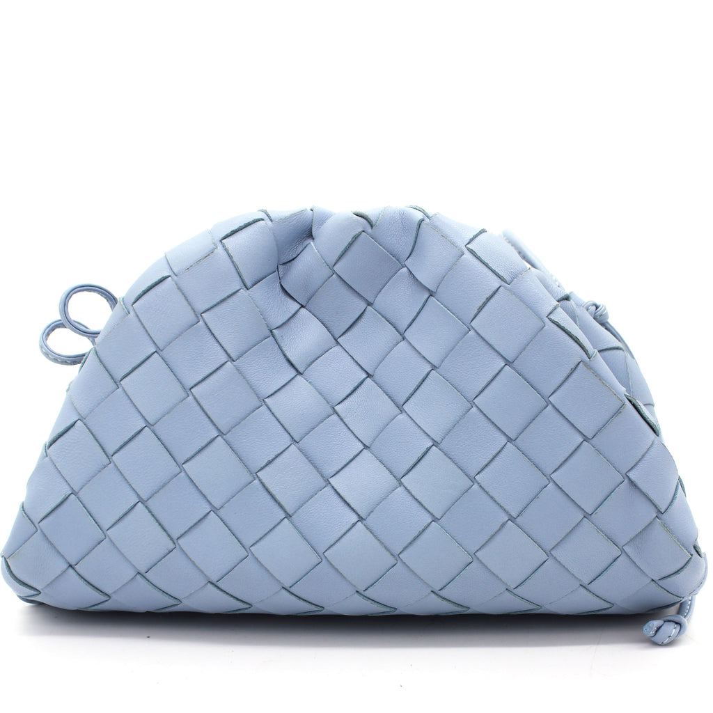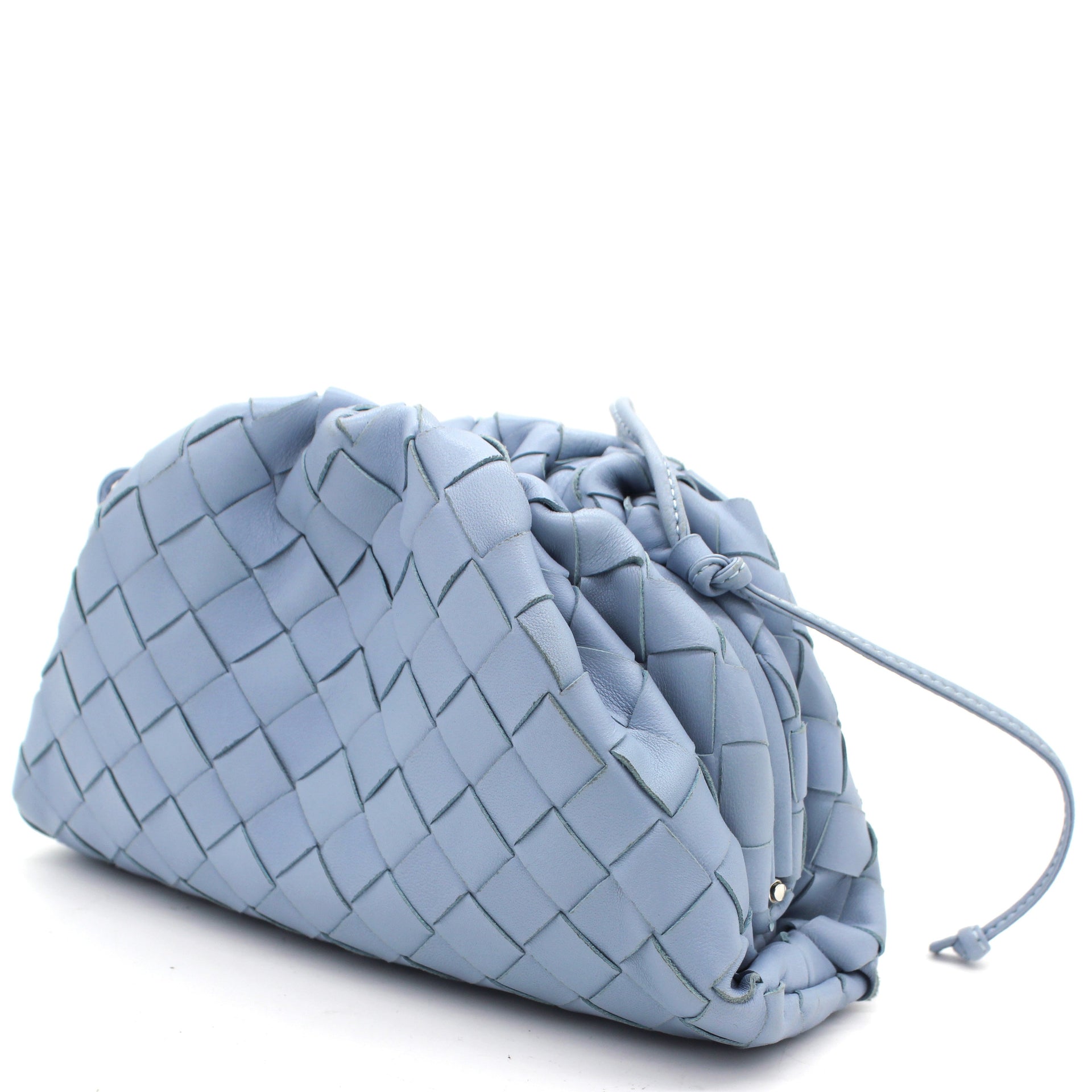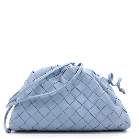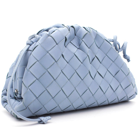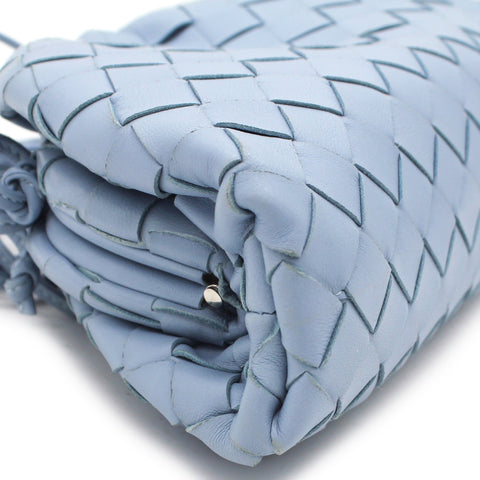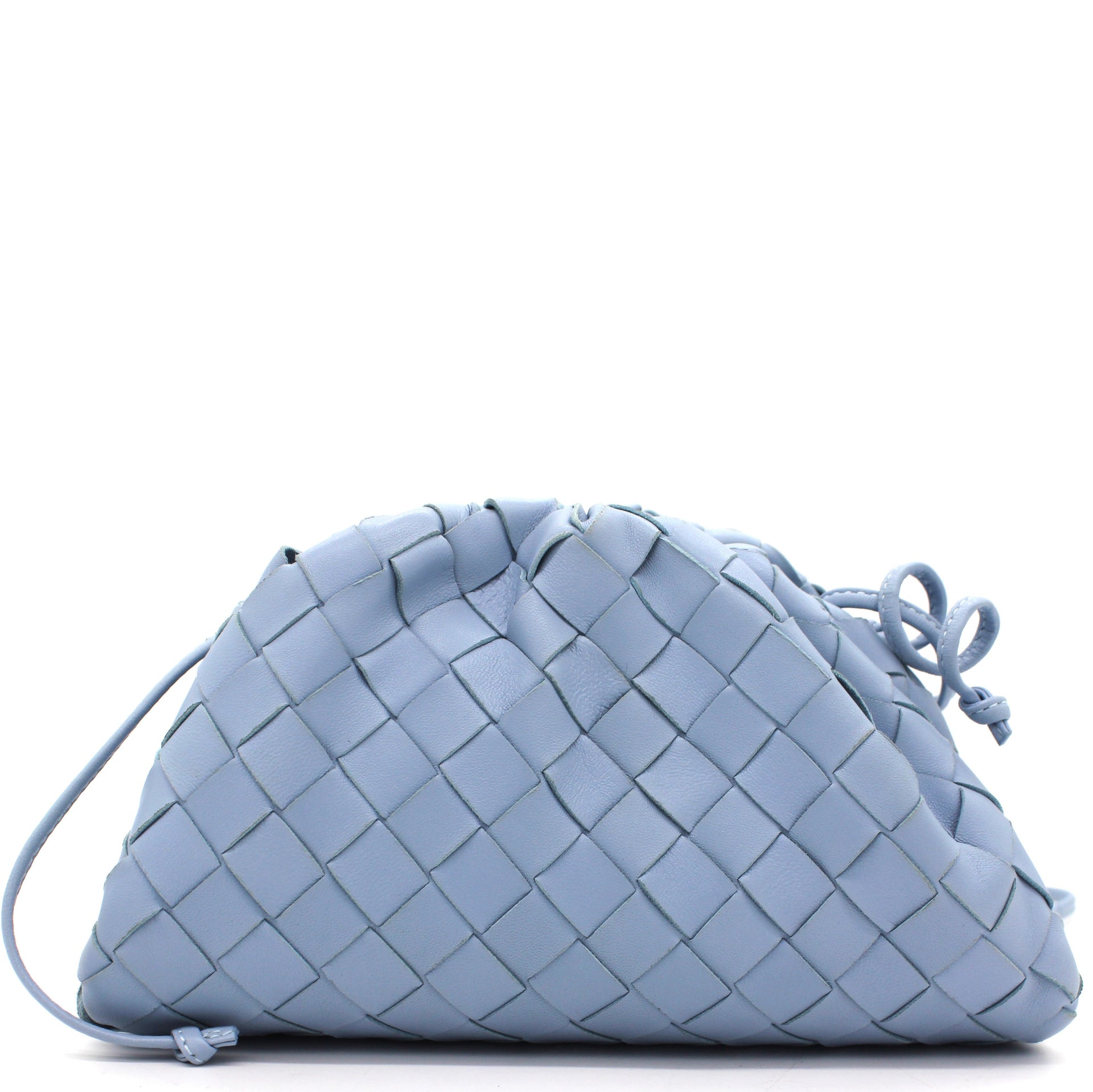 | This petite shoulder bag is crafted of woven lambskin leather in blue. The bag features a long, thin leather shoulder strap, and a magnetic top frame that opens to a smooth white leather interior. Enjoy the chic sophistication of Bottega Veneta with this beautiful shoulder bag |