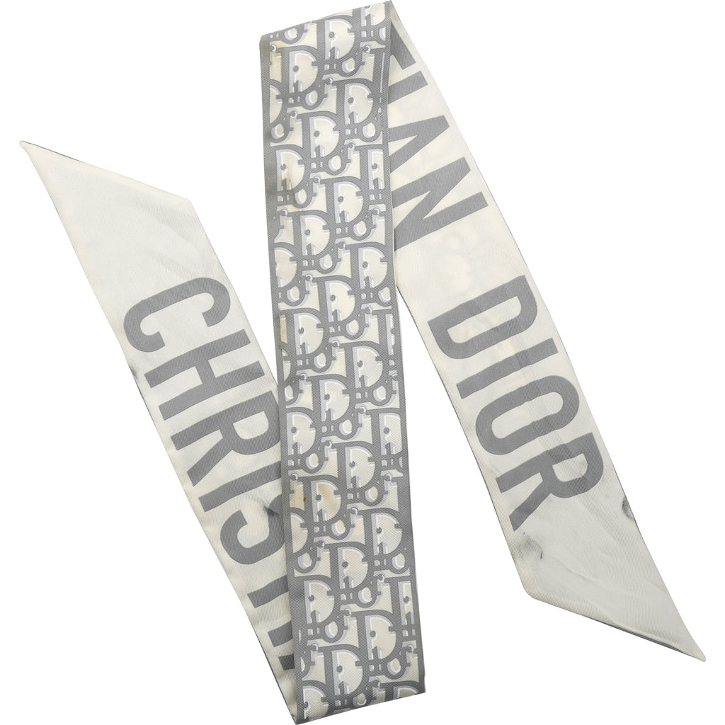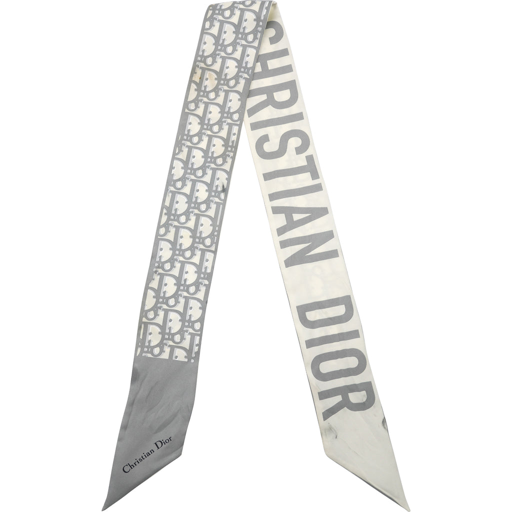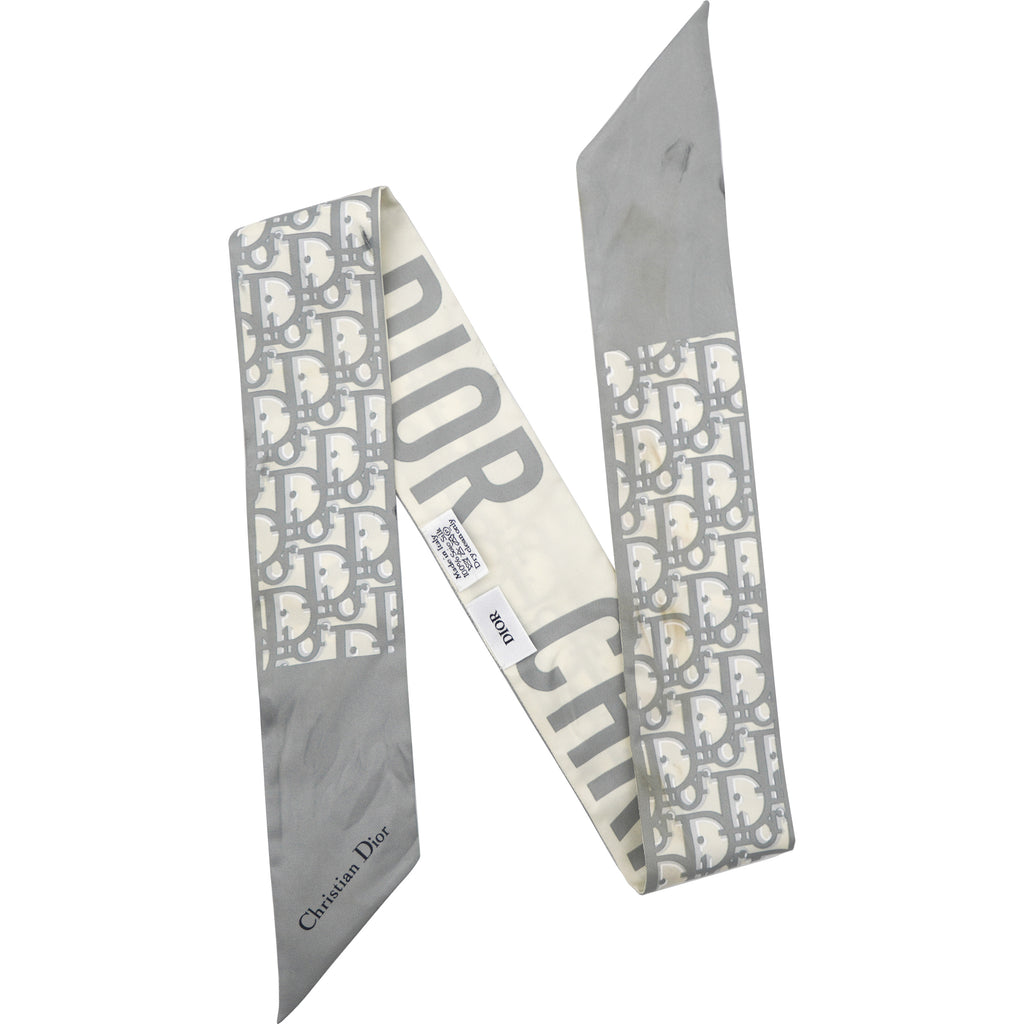 | The Dior Oblique Mitzah scarf highlights the House's iconic motif dating back to 1967. Crafted in gray silk twill, it is distinguished by an elongated shape with pointed ends and is embellished with a 'CHRISTIAN DIOR' signature jacquard band on the back. The Mitzah scarf will lend the finishing touch to any look and may be worn around the neck, tied at the wrist or on a bag. |