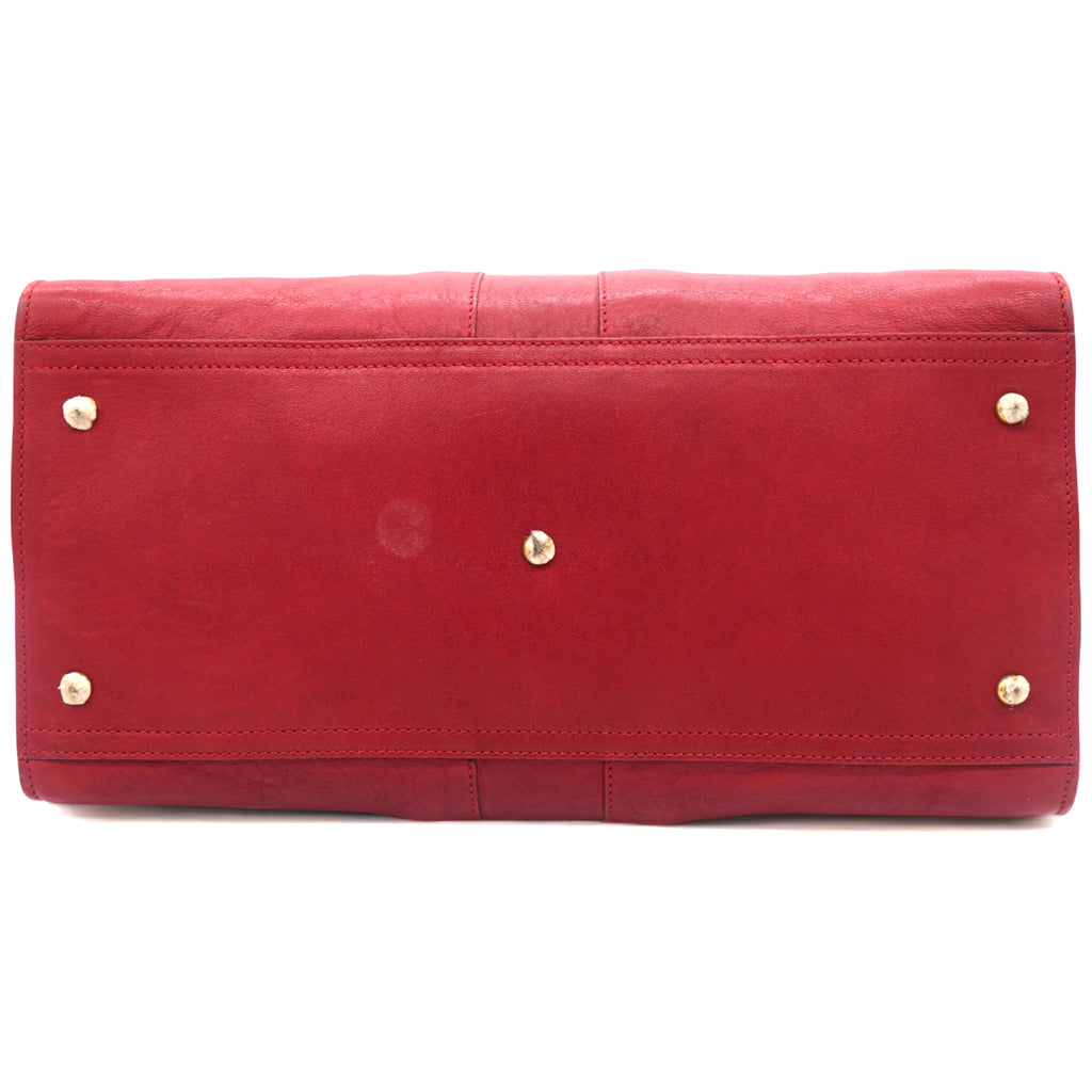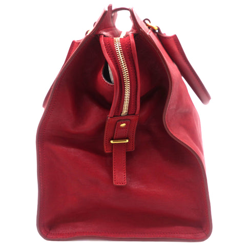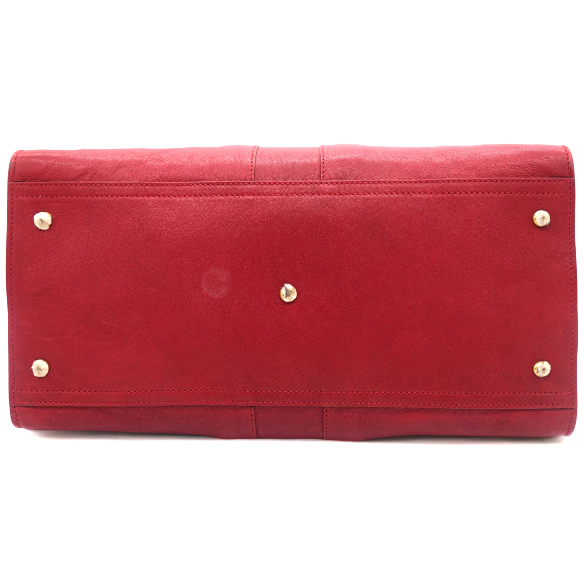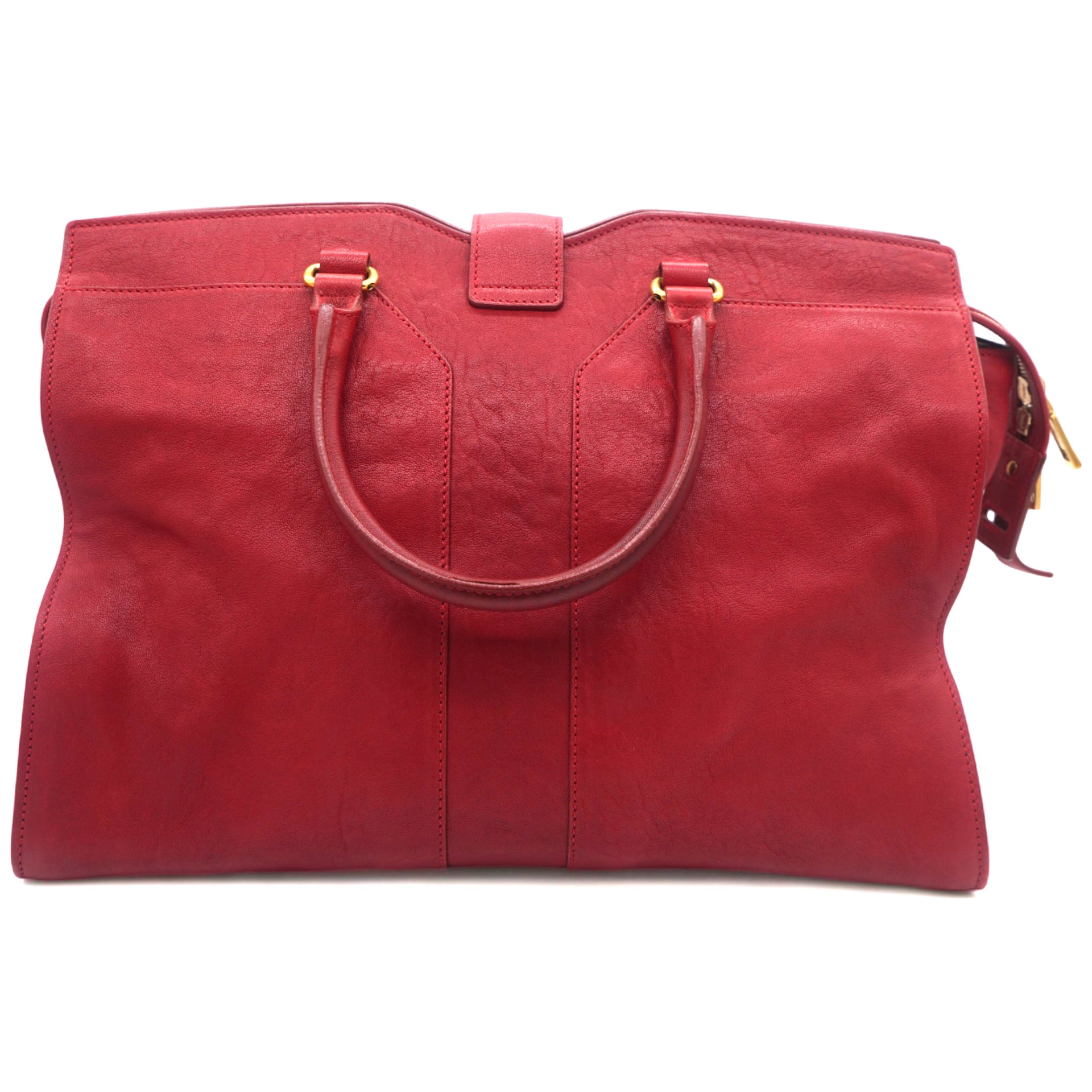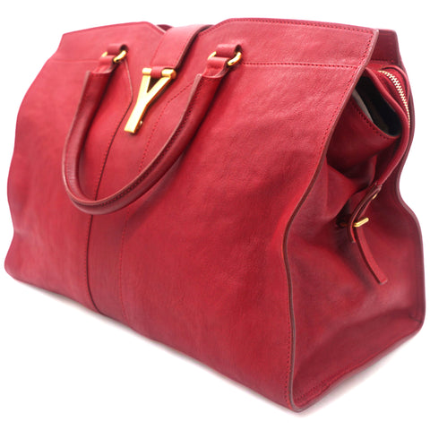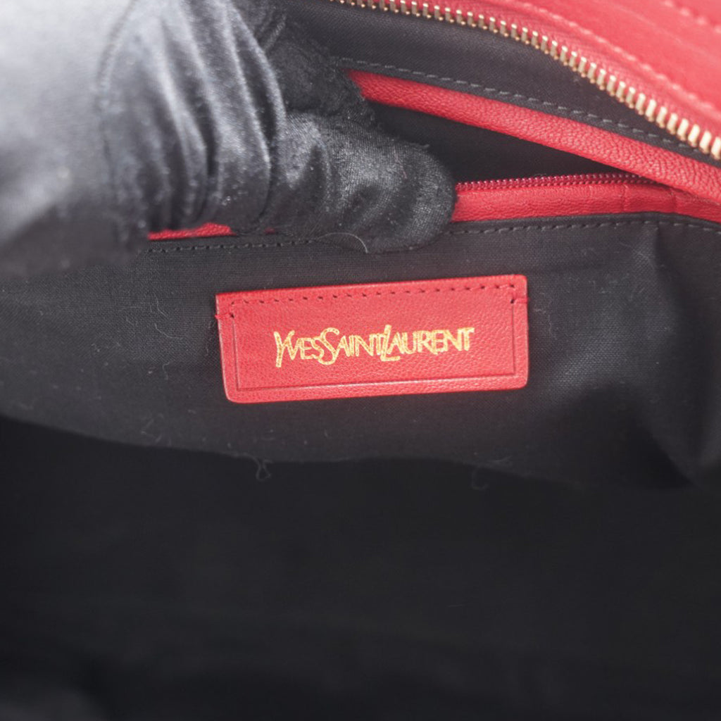 This elegant red Cabas Chyc tote from Saint Laurent is ideal for everyday use. Crafted from leather, the bag is detailed with a gold-tone hardware Y motif snap closure and dual rolled handles. The top zip closure opens to a spacious interior that is perfectly sized to hold all your necessities.