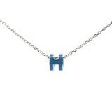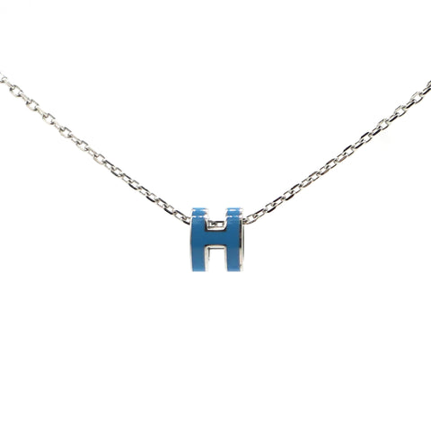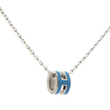 | This is an authentic HERMES Lacquered Gold Pop H Pendant Necklace in Blue. This is a simple and very chic necklace from Hermes. It features a ring shape that is an elongated lacquered White “H", which hangs on a short, thin gold band. |
