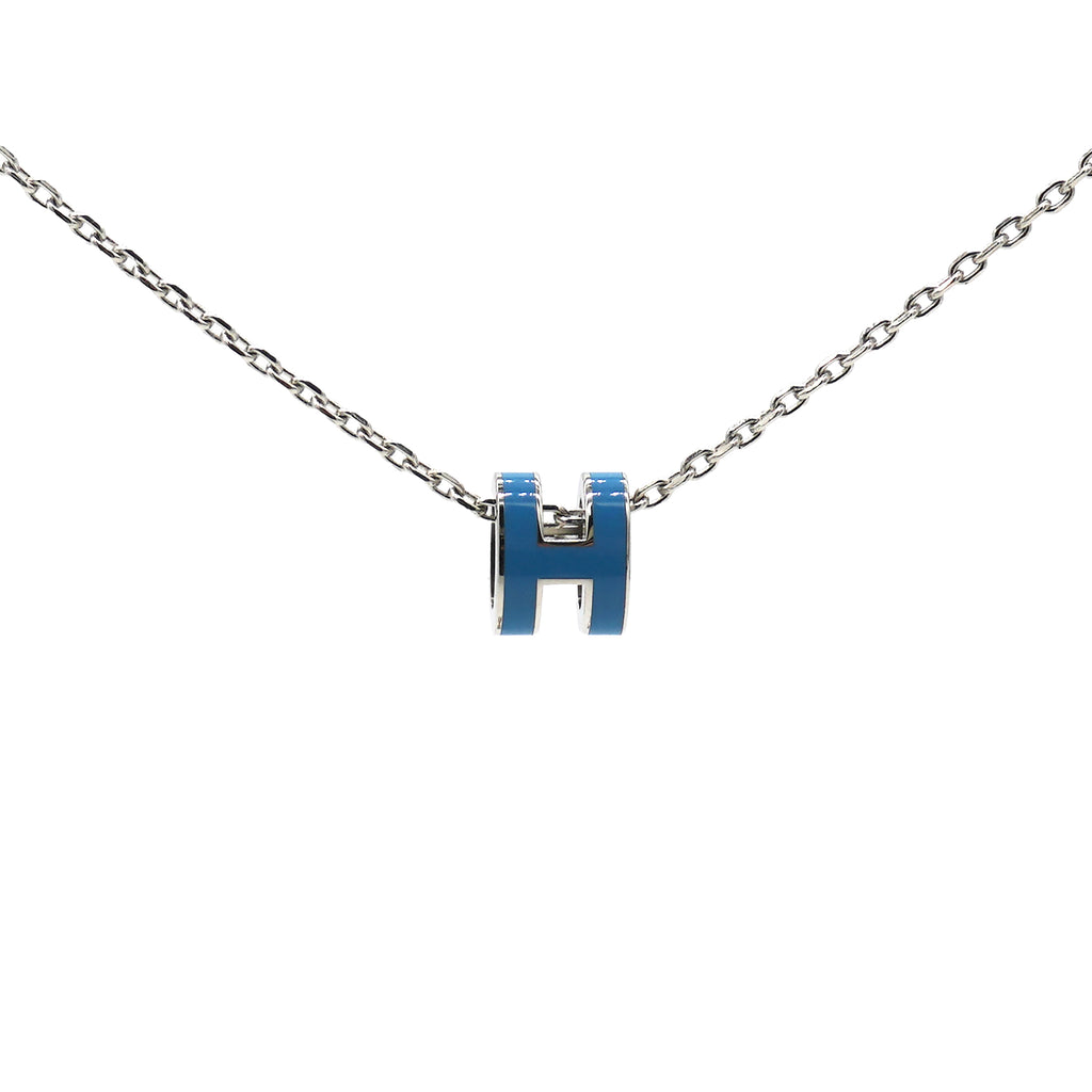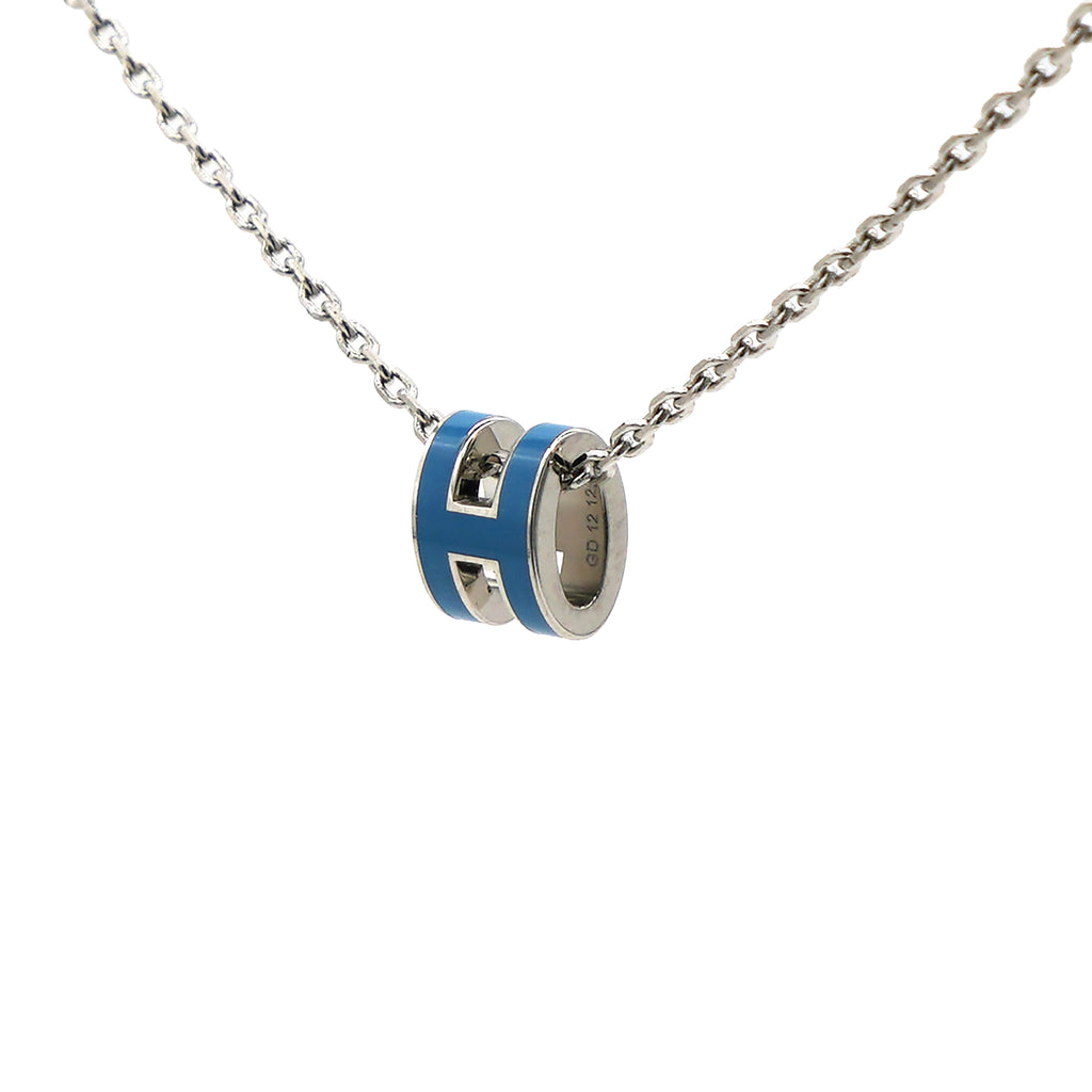 This is an authentic HERMES Lacquered silver Pop H Pendant Necklace in blue. This is a simple and very chic necklace from Hermes. It features a ring shape that is an elongated lacquered blue “H", which hangs on a short, thin silver band.