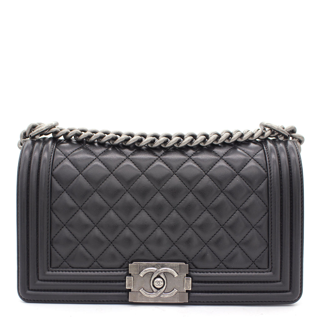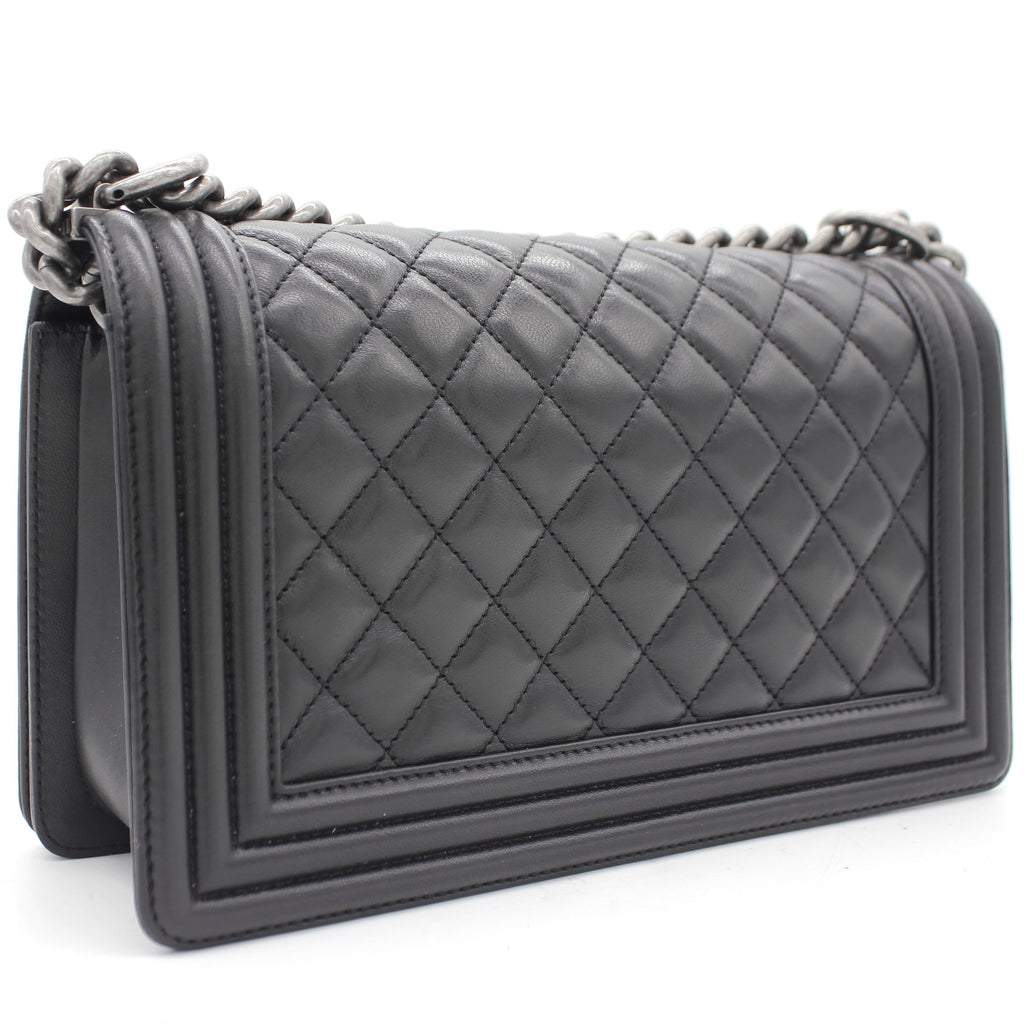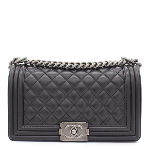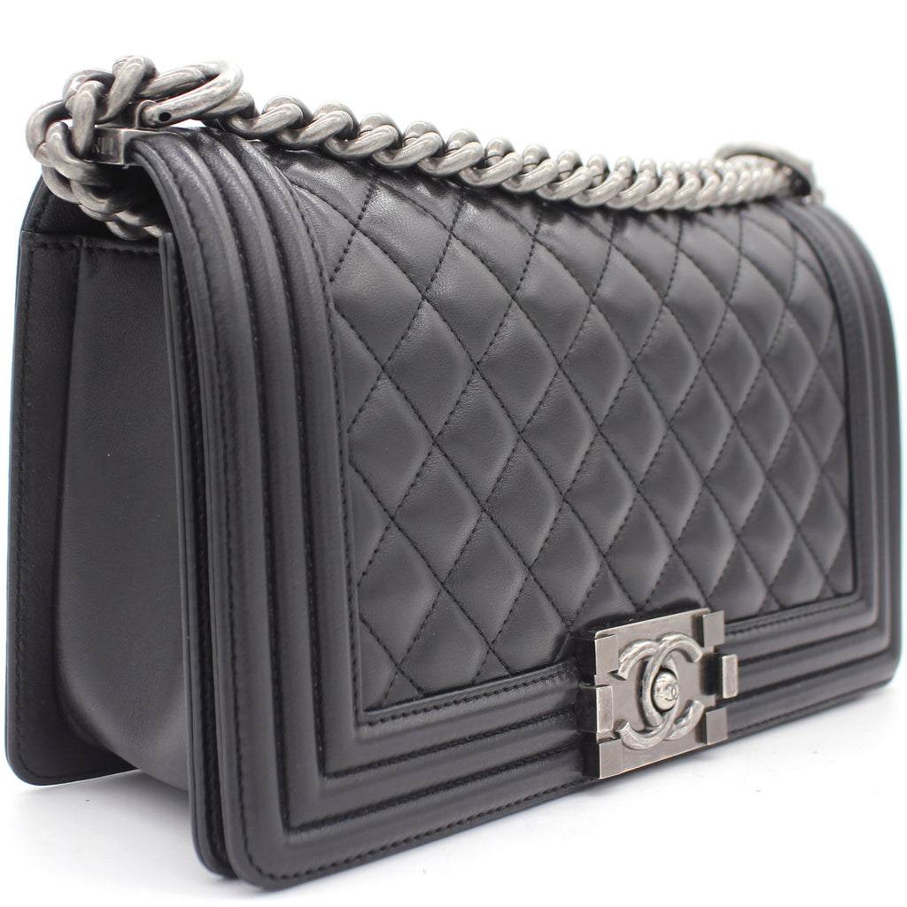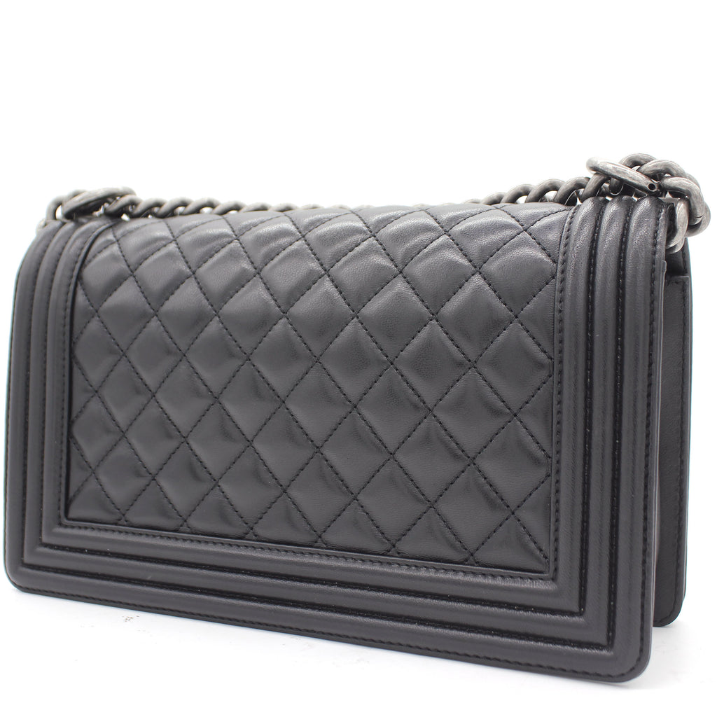 Black double-stitched quilted leather Chanel Medium Boy Bag with silver-tone hardware, convertible chain-link shoulder strap with leather shoulder guard, tonal grosgrain interior lining, single slip pocket at interior wall and CC push-lock closure at front flap.