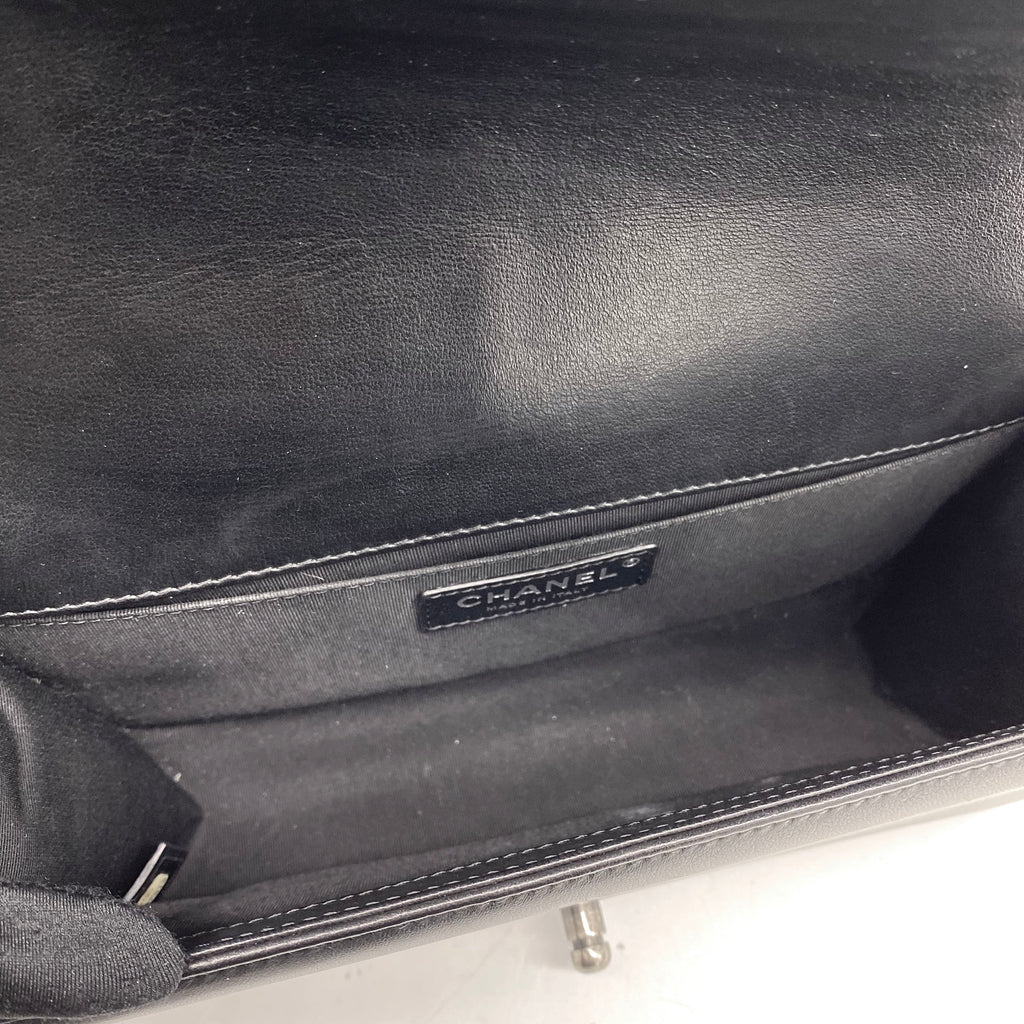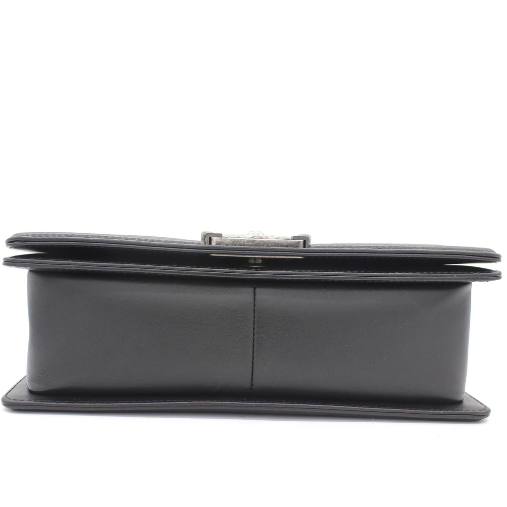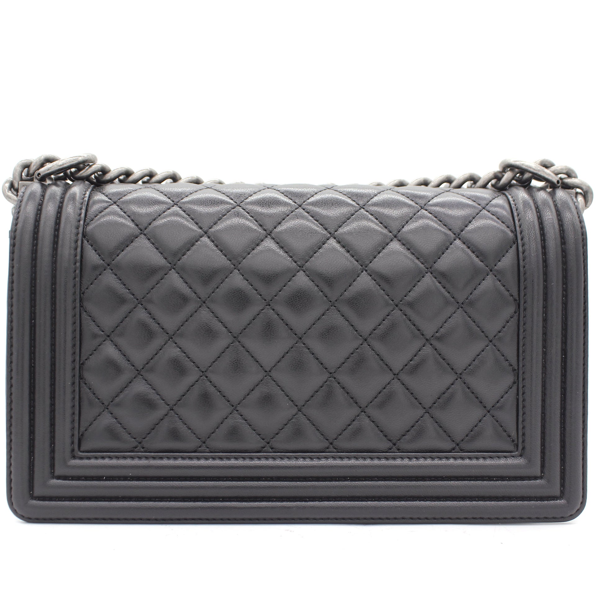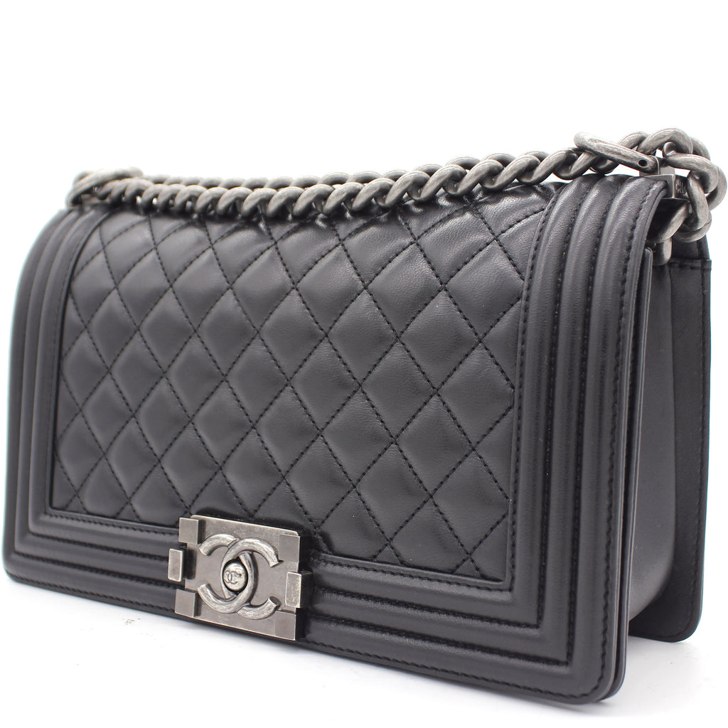 Black double-stitched quilted leather Chanel Medium Boy Bag with silver-tone hardware, convertible chain-link shoulder strap with leather shoulder guard, tonal grosgrain interior lining, single slip pocket at interior wall and CC push-lock closure at front flap.