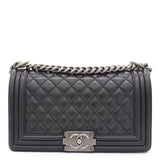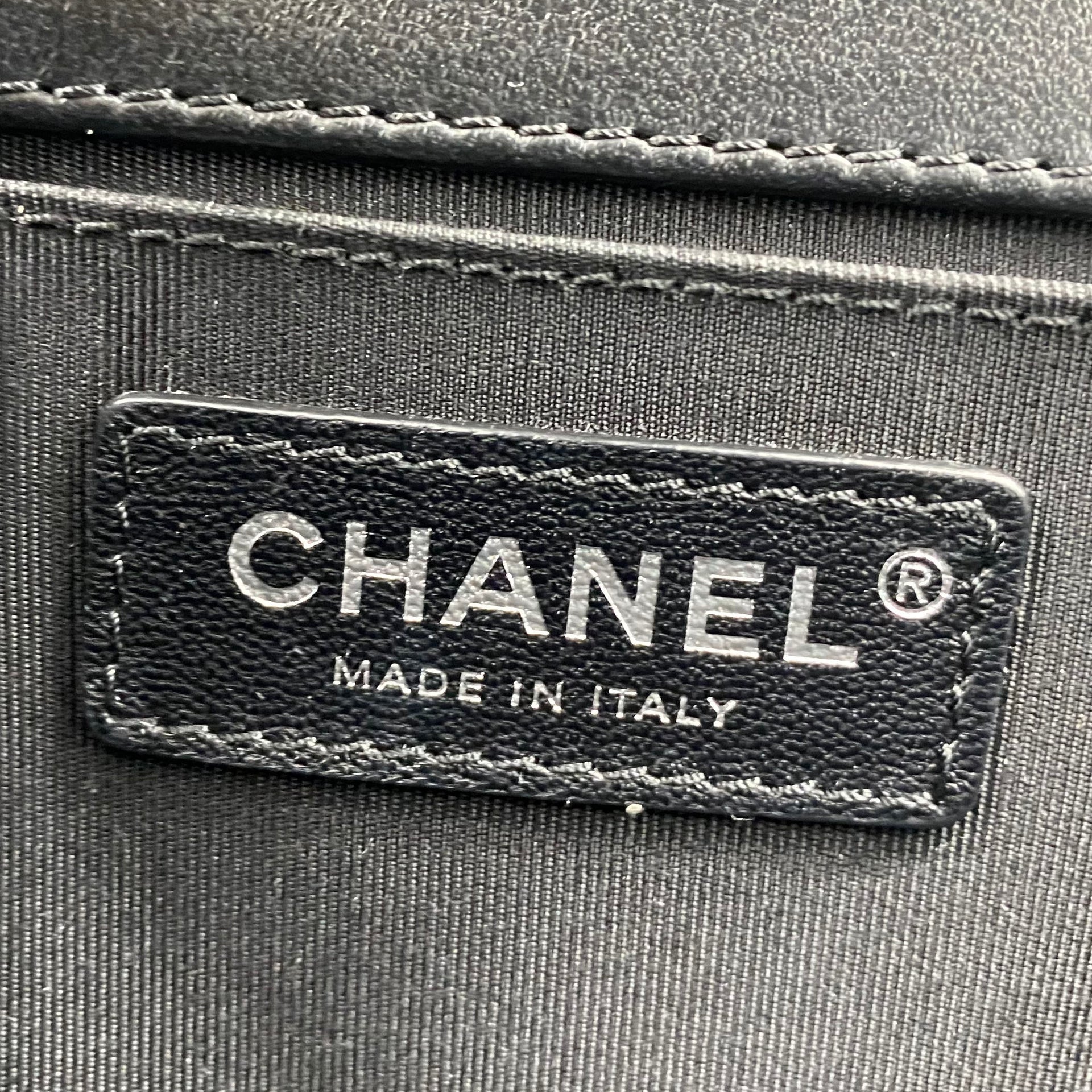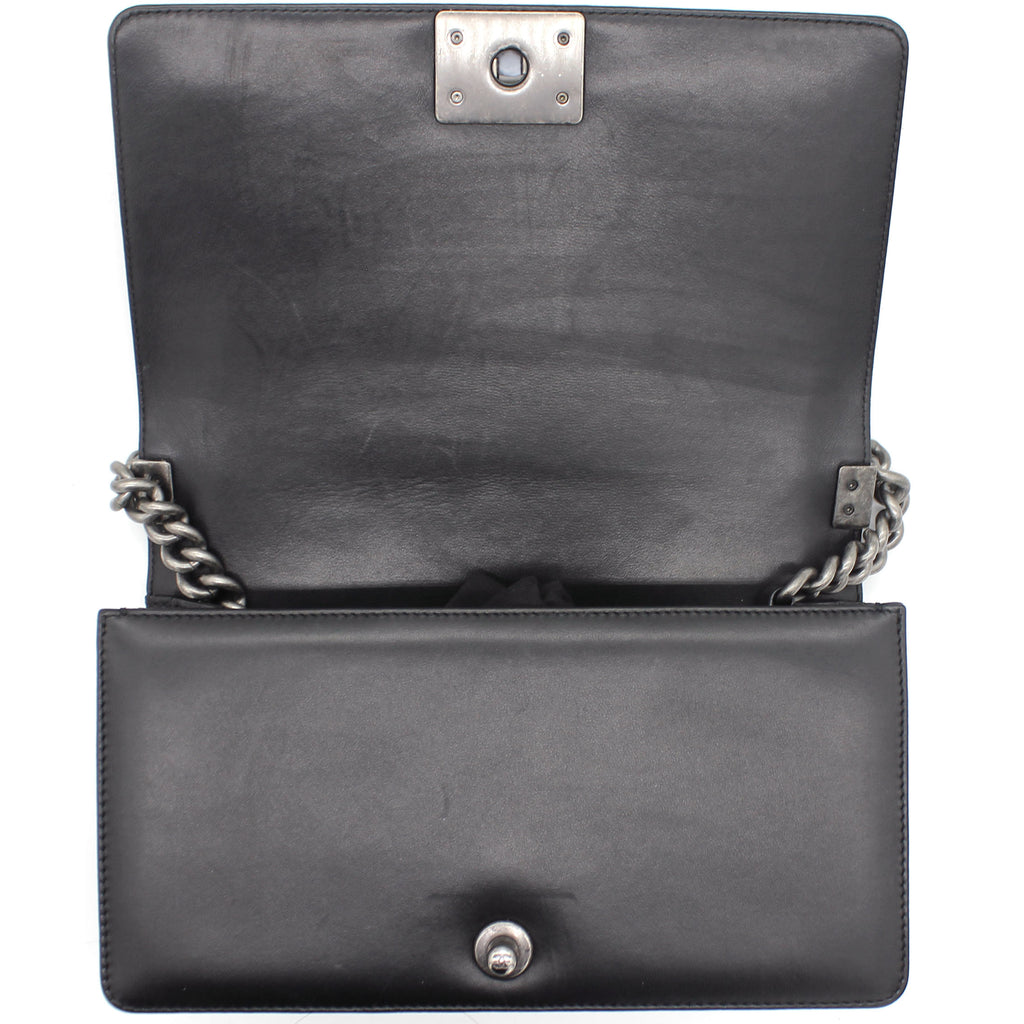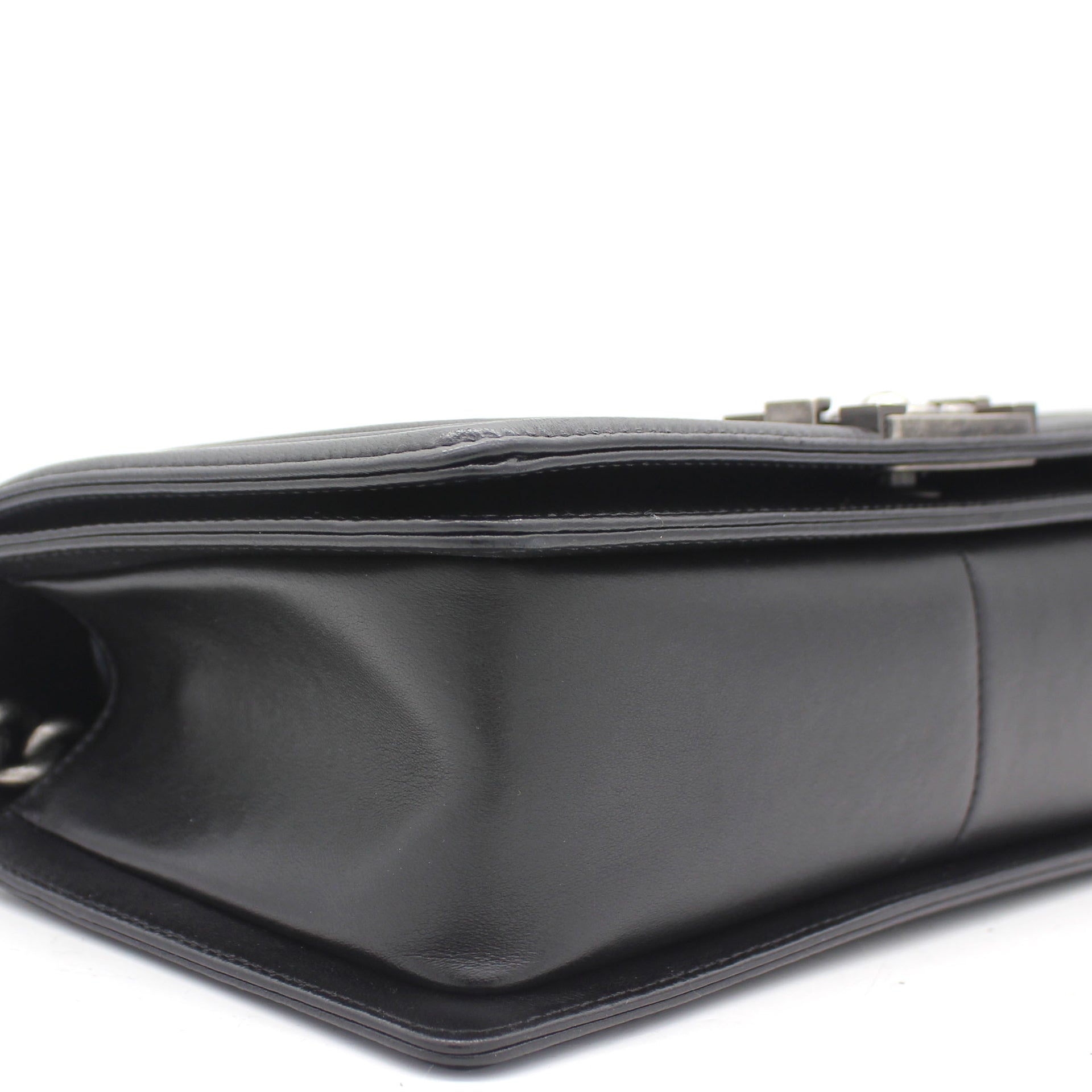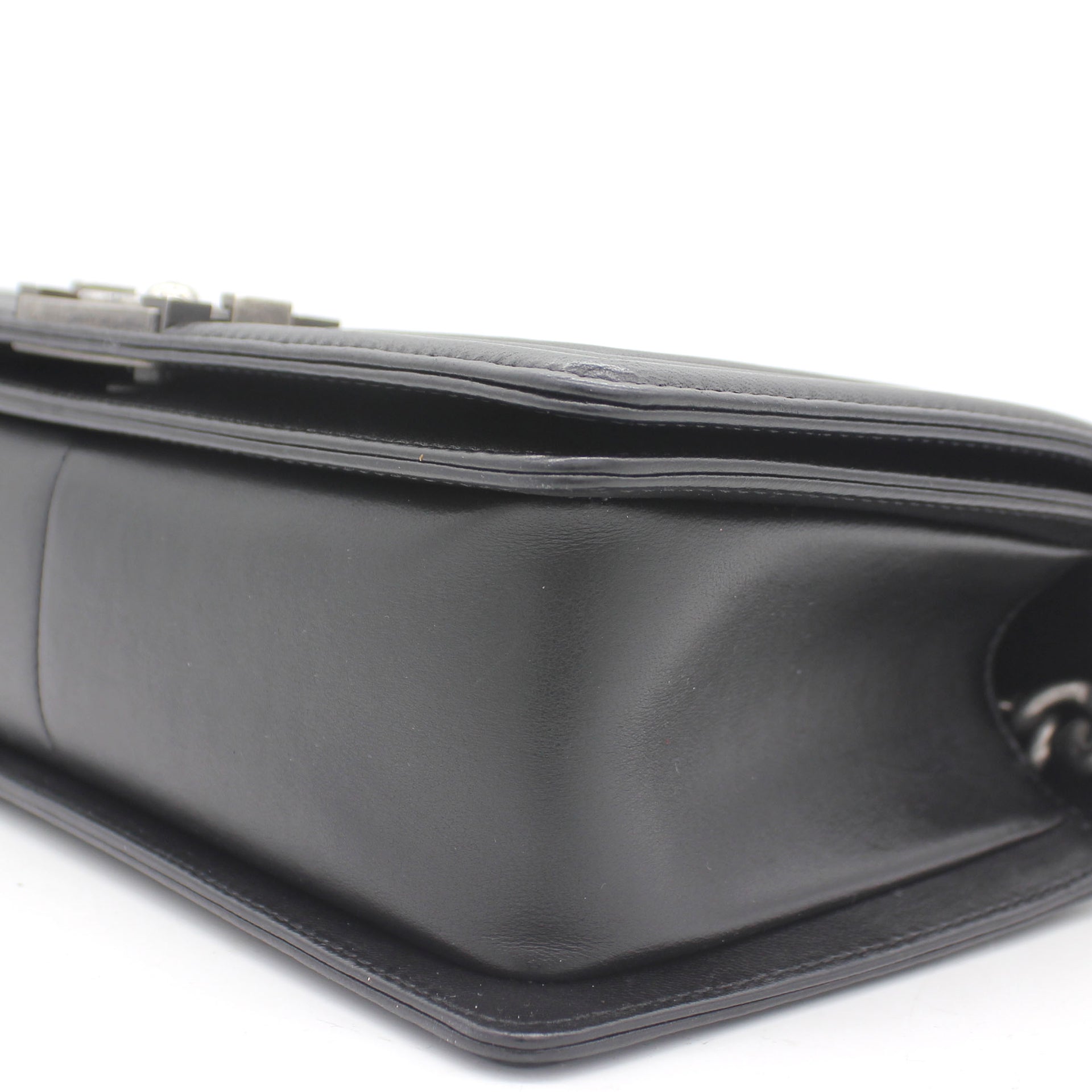 Black double-stitched quilted leather Chanel Medium Boy Bag with silver-tone hardware, convertible chain-link shoulder strap with leather shoulder guard, tonal grosgrain interior lining, single slip pocket at interior wall and CC push-lock closure at front flap.
