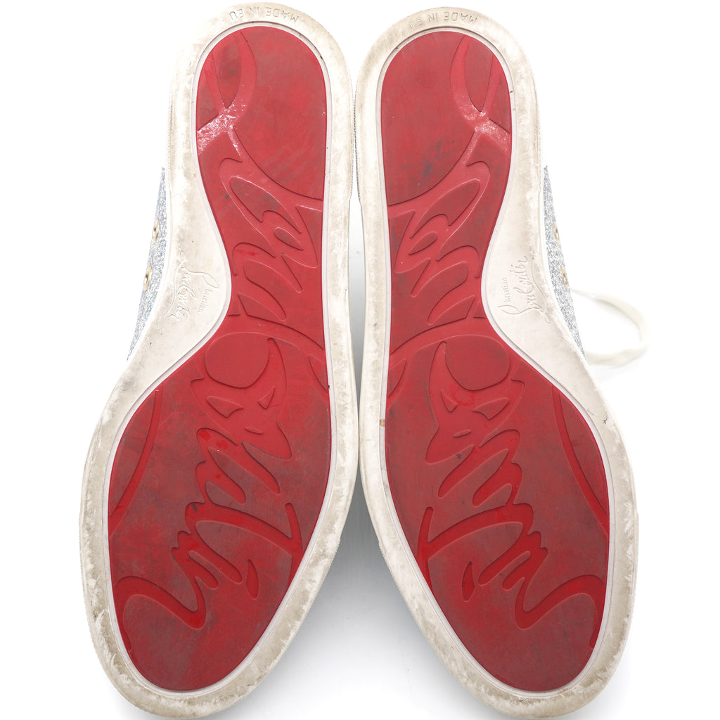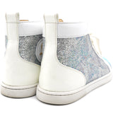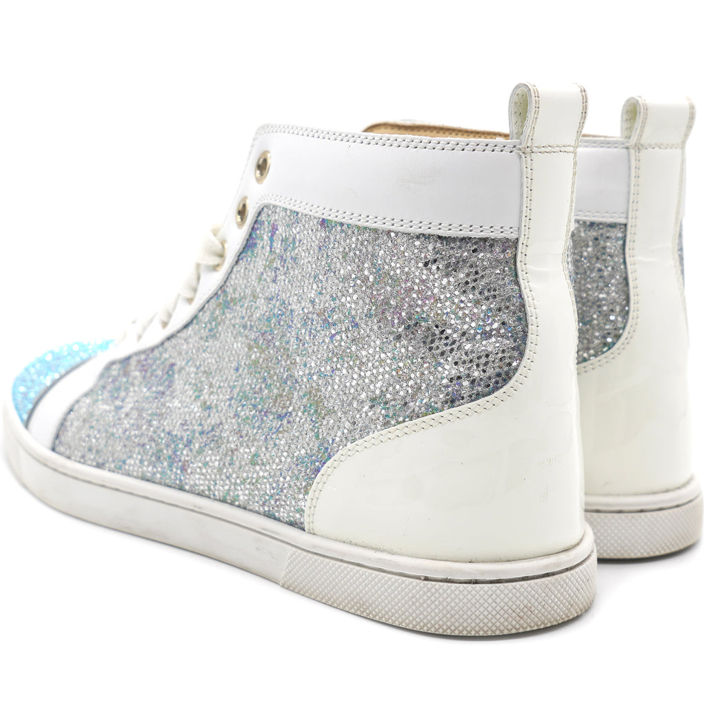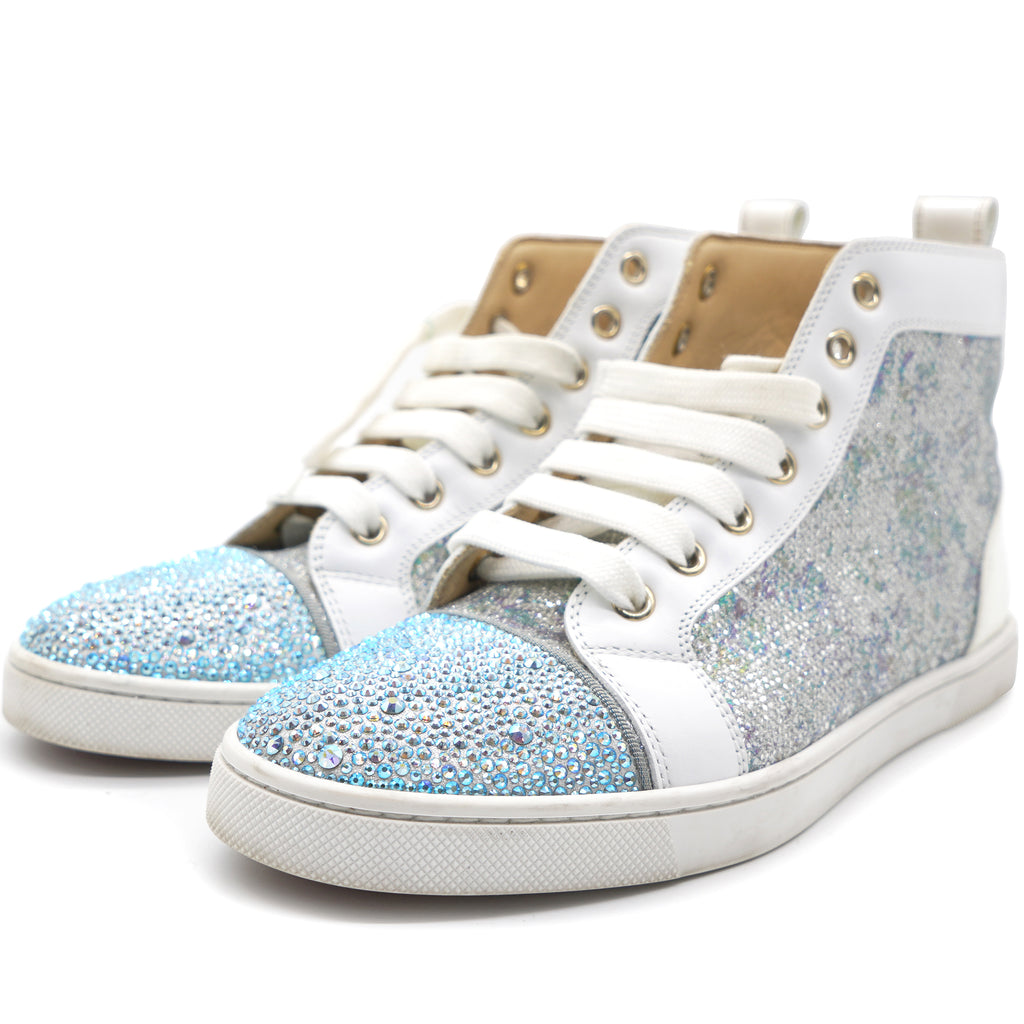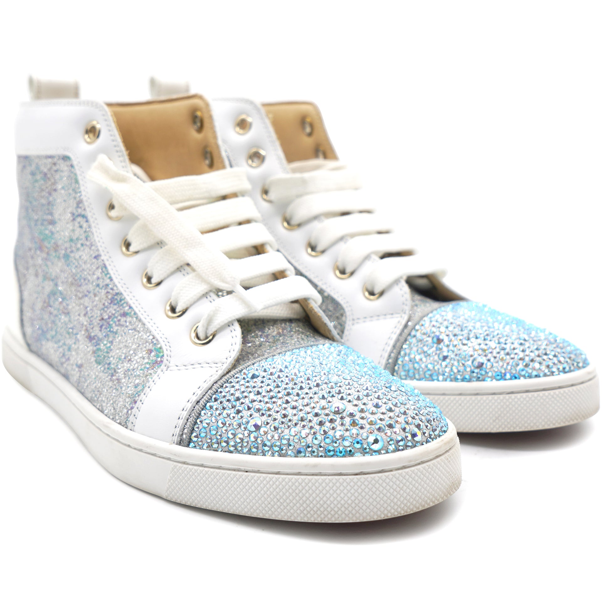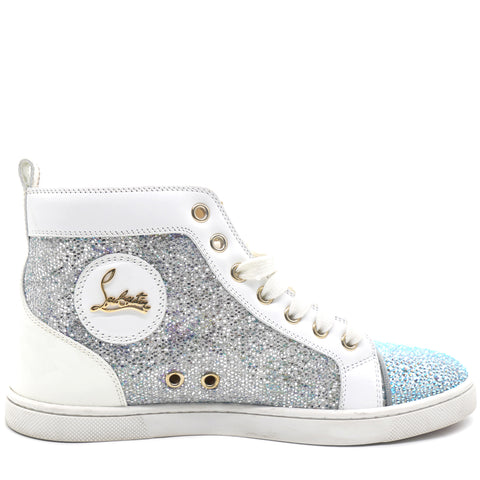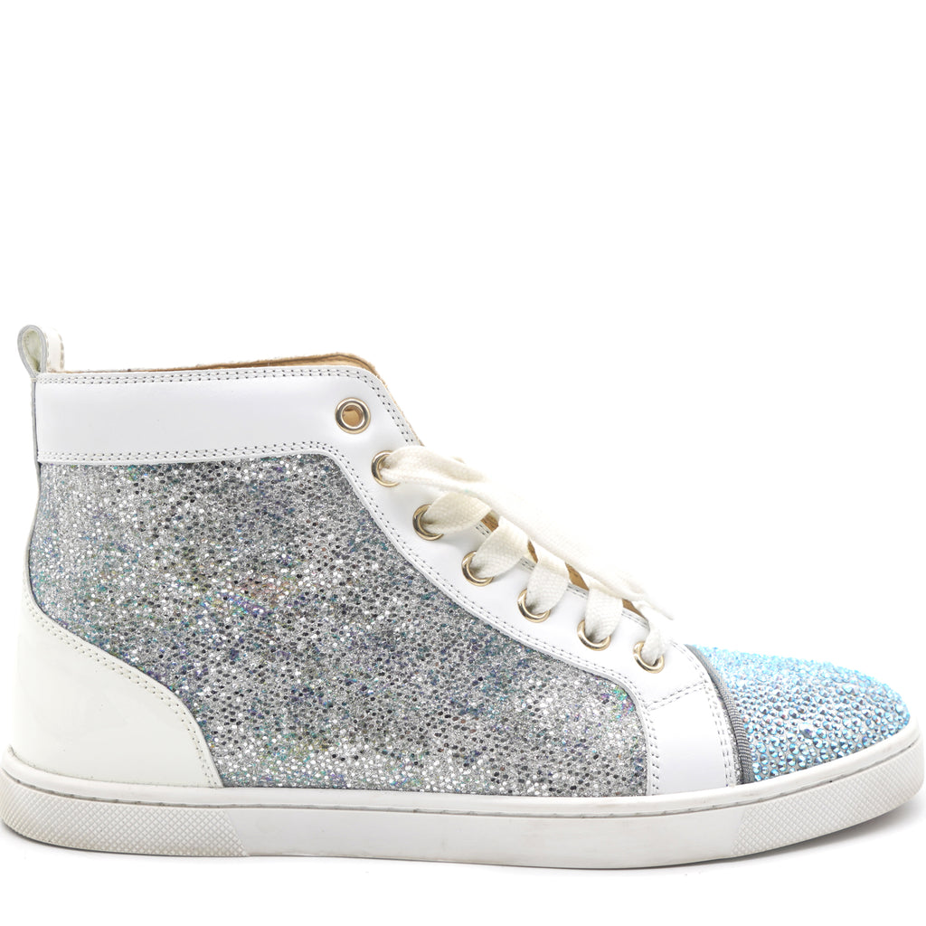 | Round-toe Louis sneakers are a statement style that’ll effortlessly upgrade your on and off-duty looks. Grosgrain piping detail brings a refined touch to this beloved high-top crafted in white calfskin leathers and embellished with tonal strass. A stitched scar at the back completes the minimalist pair with signature aplomb. |