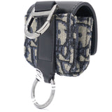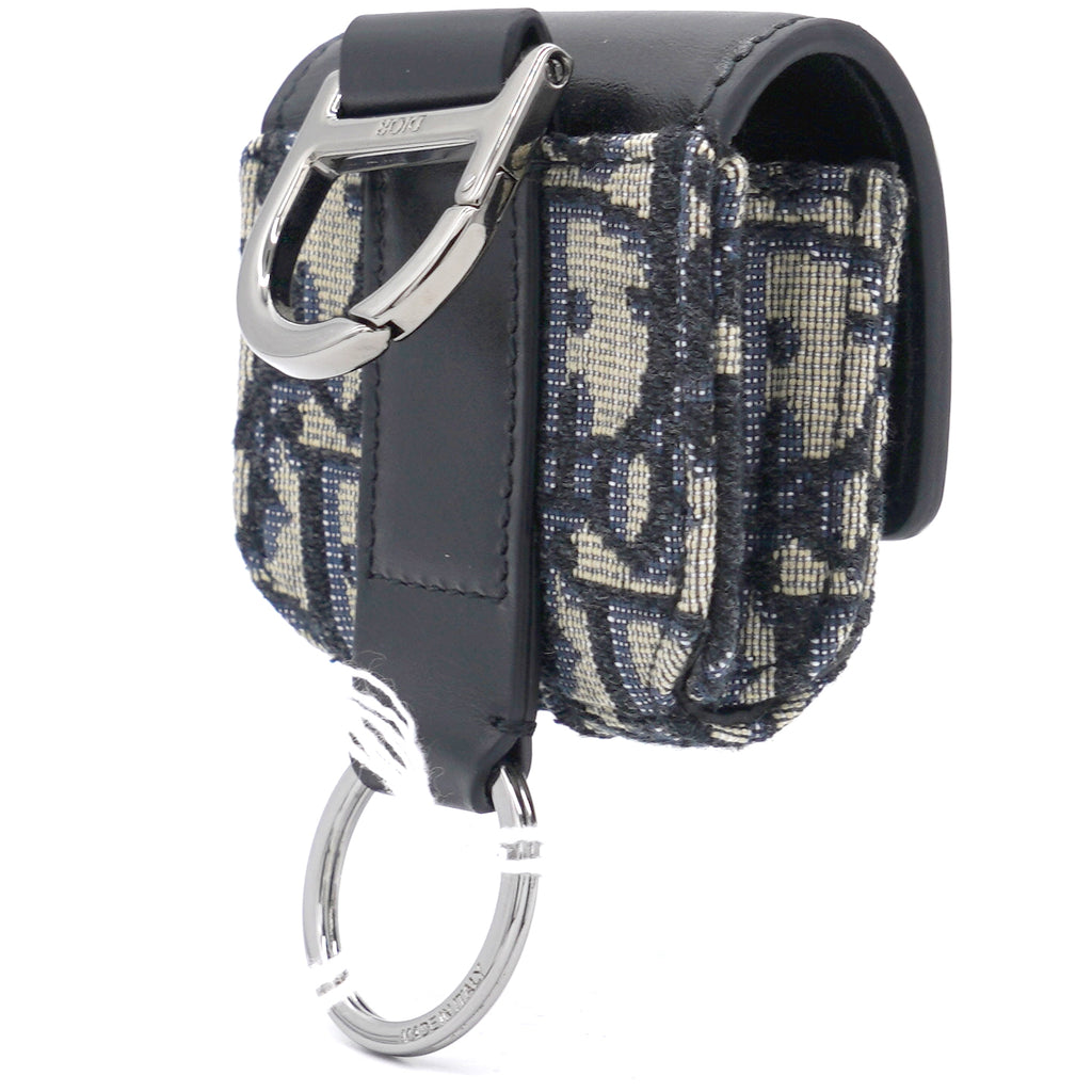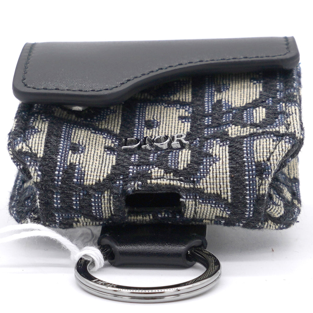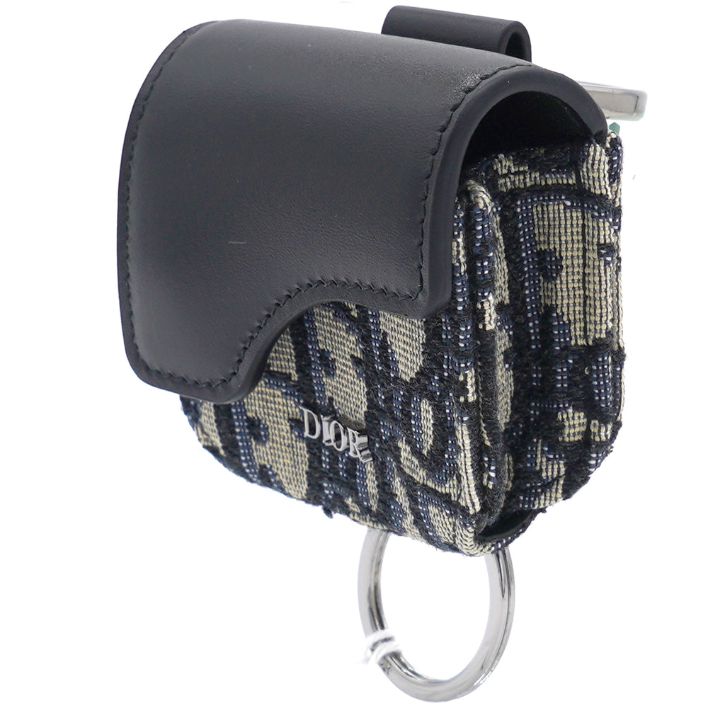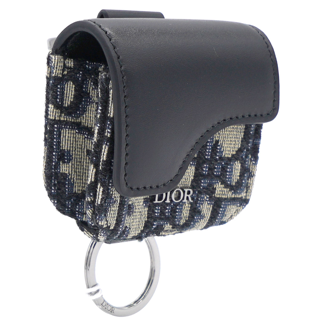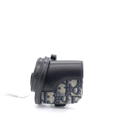 | The saddle case for Air Pods Pro is a refined storage case to transport your headphones. The style is crafted in blue Dior Oblique jacquard showcasing the hallmark Saddle line codes, with its asymmetric flap and adorned with a front 'D' stirrup. Featuring an upper metal ring, the accessory can hook onto a belt loop or an embroidered micro shoulder strap, and may be paired with other Saddle creations. |