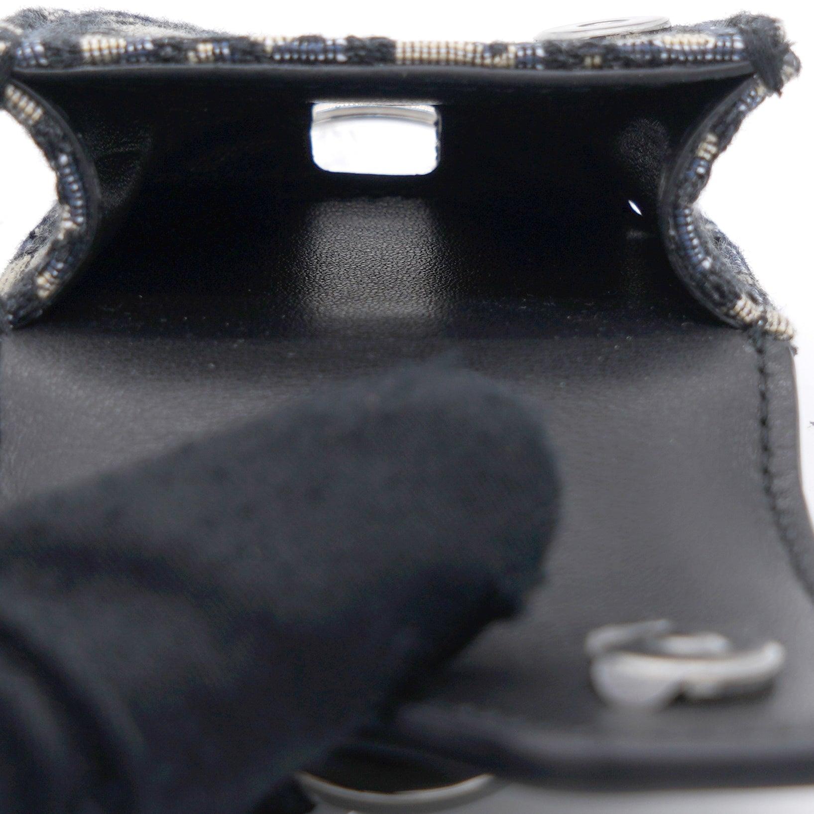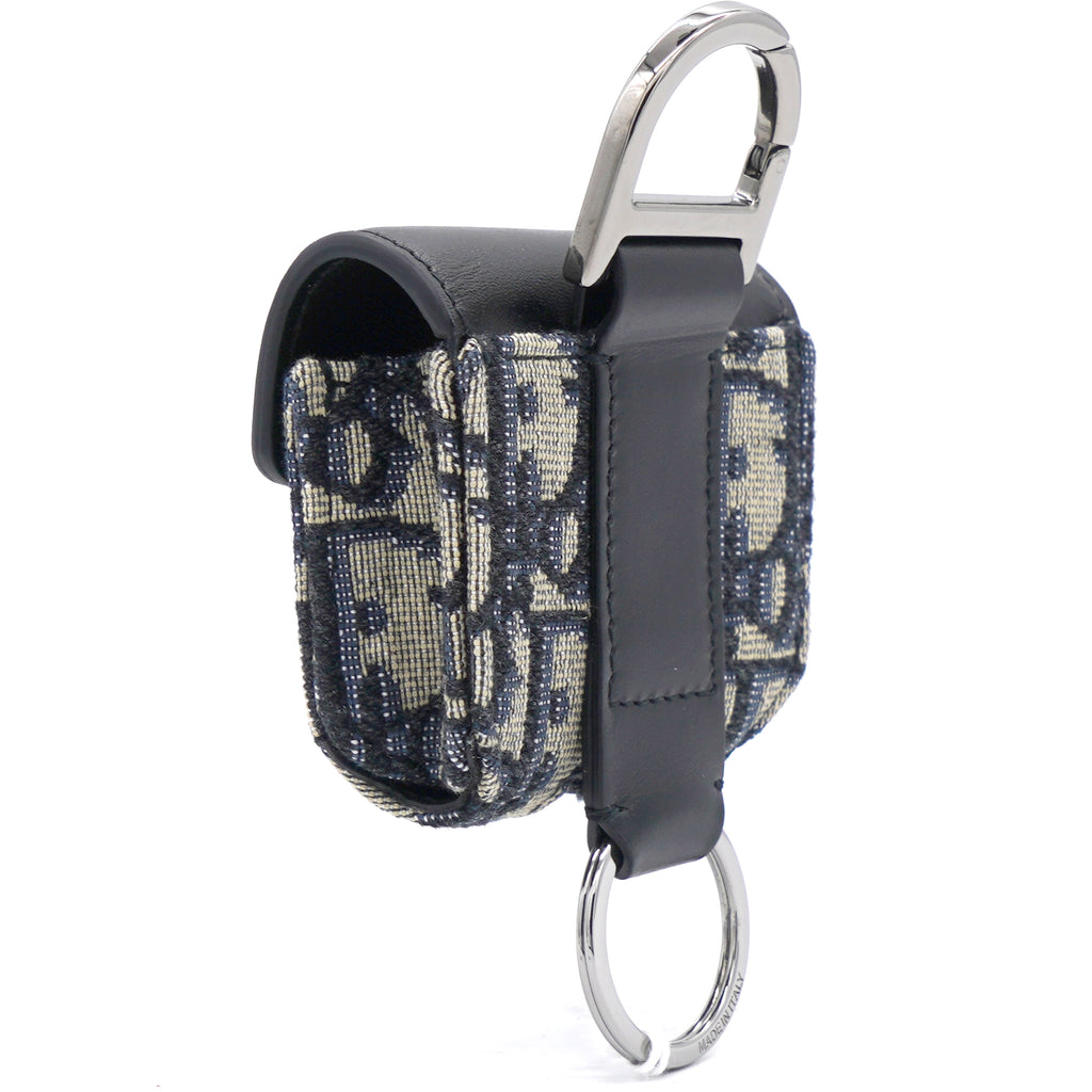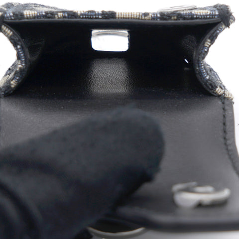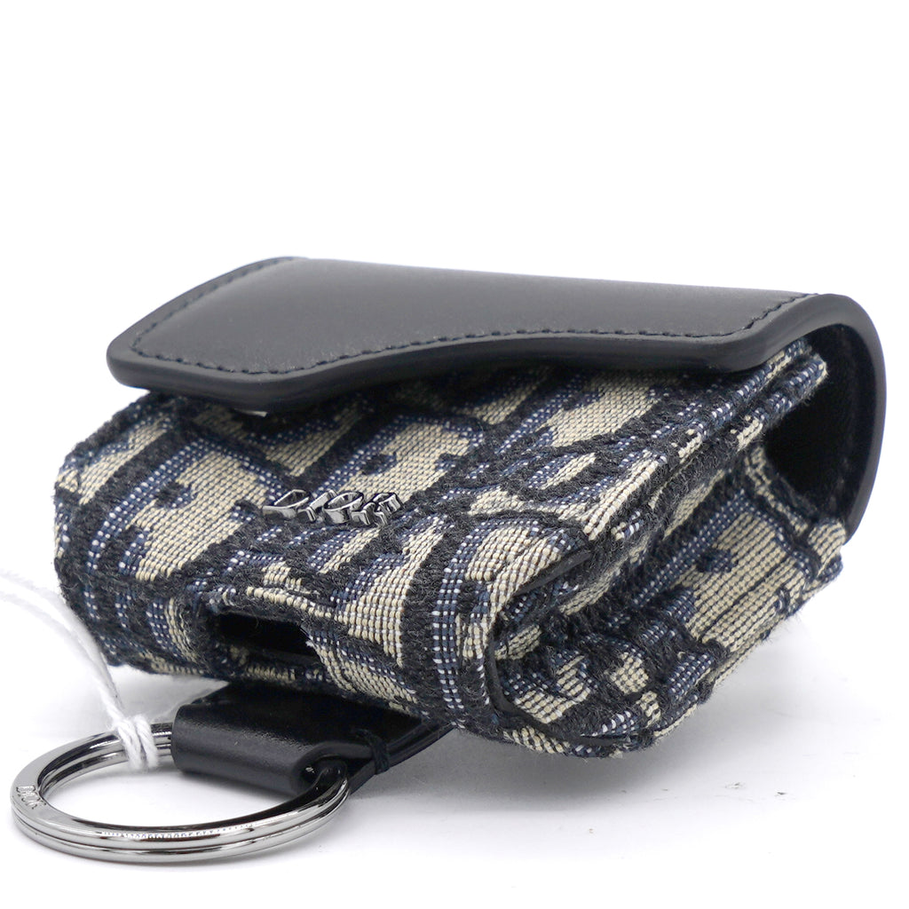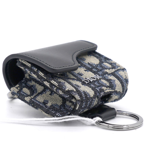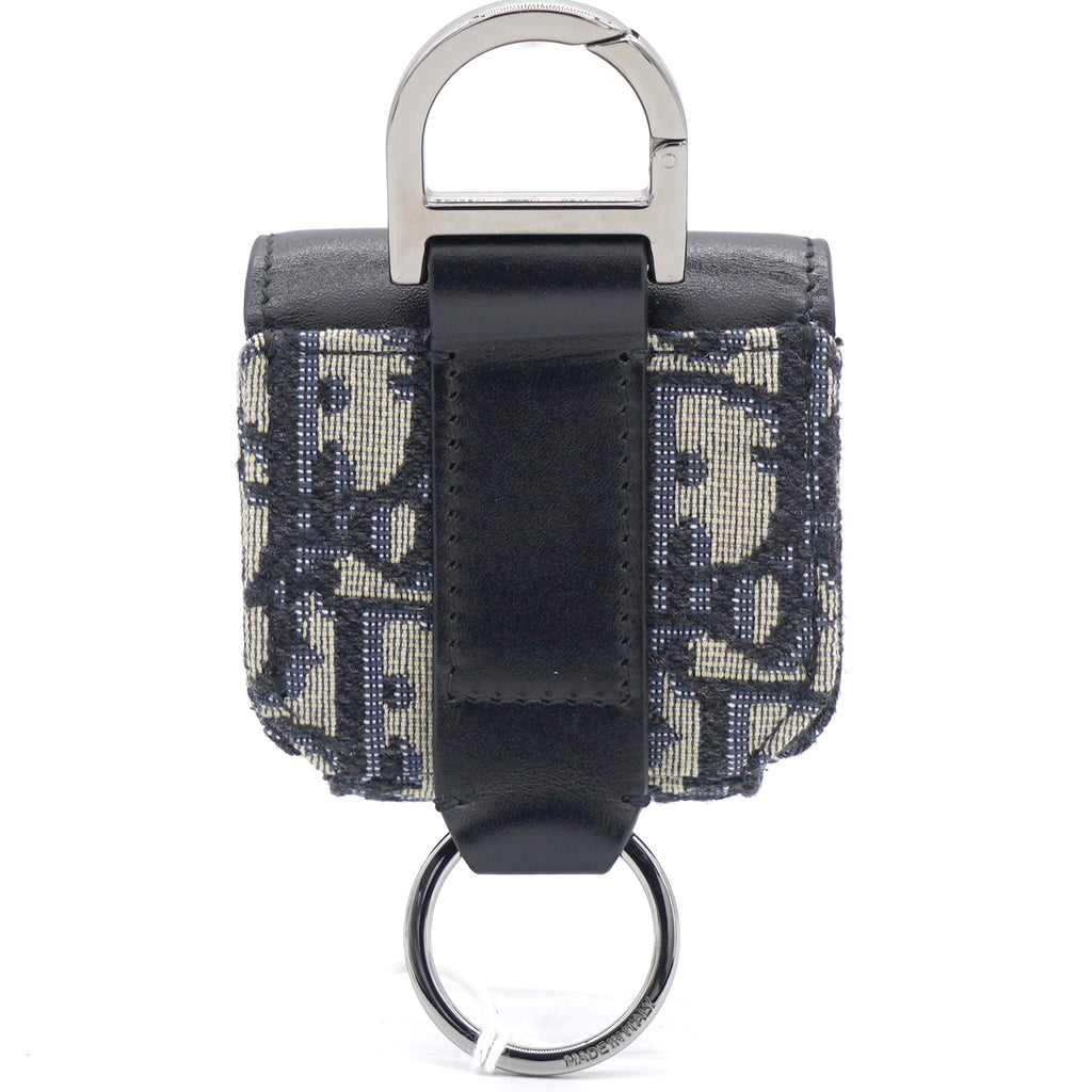 | The saddle case for Air Pods Pro is a refined storage case to transport your headphones. The style is crafted in blue Dior Oblique jacquard showcasing the hallmark Saddle line codes, with its asymmetric flap and adorned with a front 'D' stirrup. Featuring an upper metal ring, the accessory can hook onto a belt loop or an embroidered micro shoulder strap, and may be paired with other Saddle creations. |