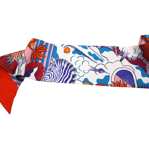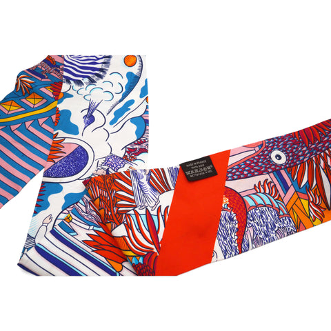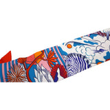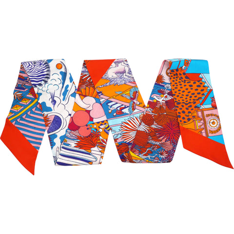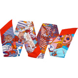 | This 100% silk is a charming narrow silk twill scarf that features multicolored shapes on a red background.. |