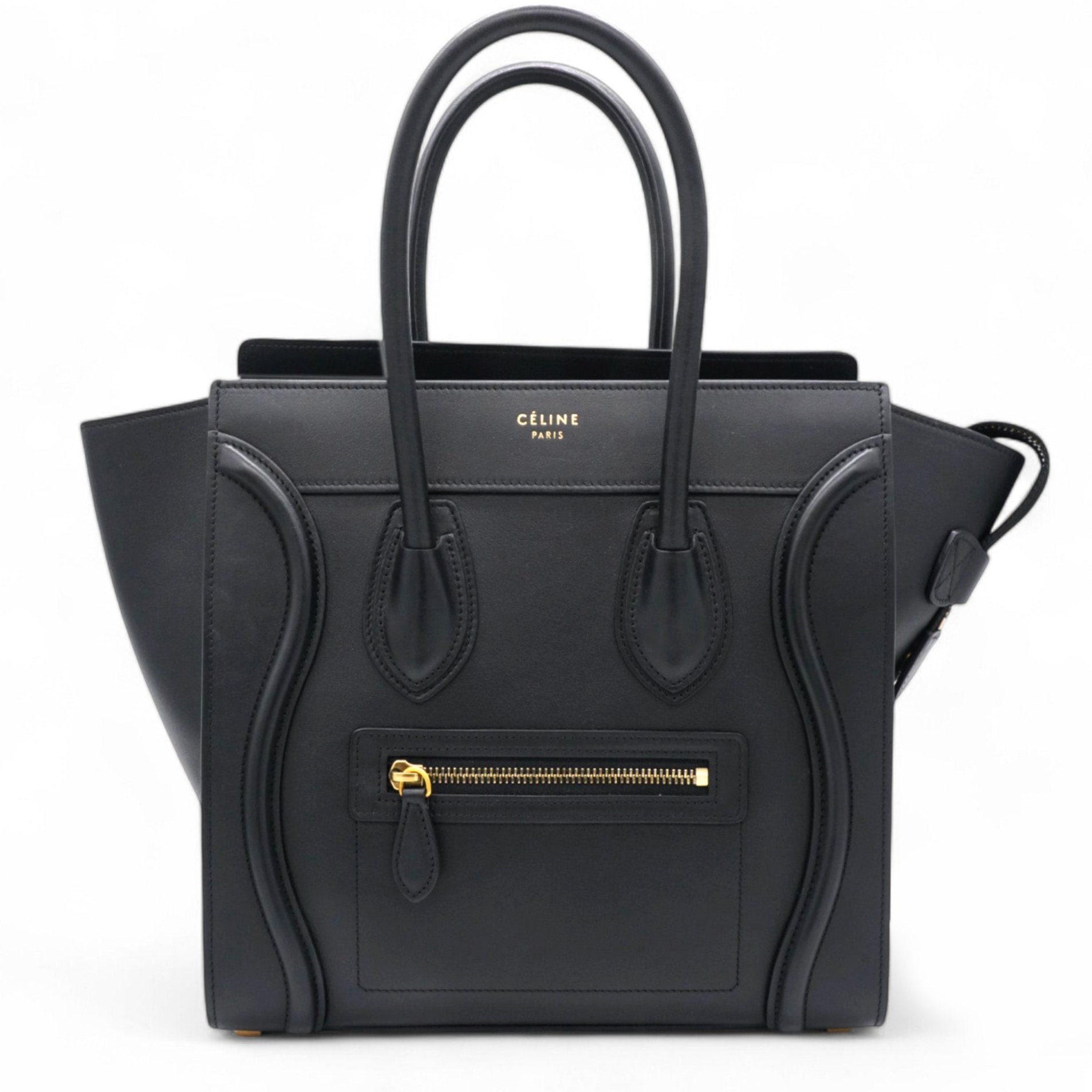 This stylish tote is crafted of luxuriously smooth calfskin leather in black. It features rolled leather top handles with a signature Celine scroll trim and expansive sides. The overextended zipper opens to a spacious leather interior with zipper and patch pockets.