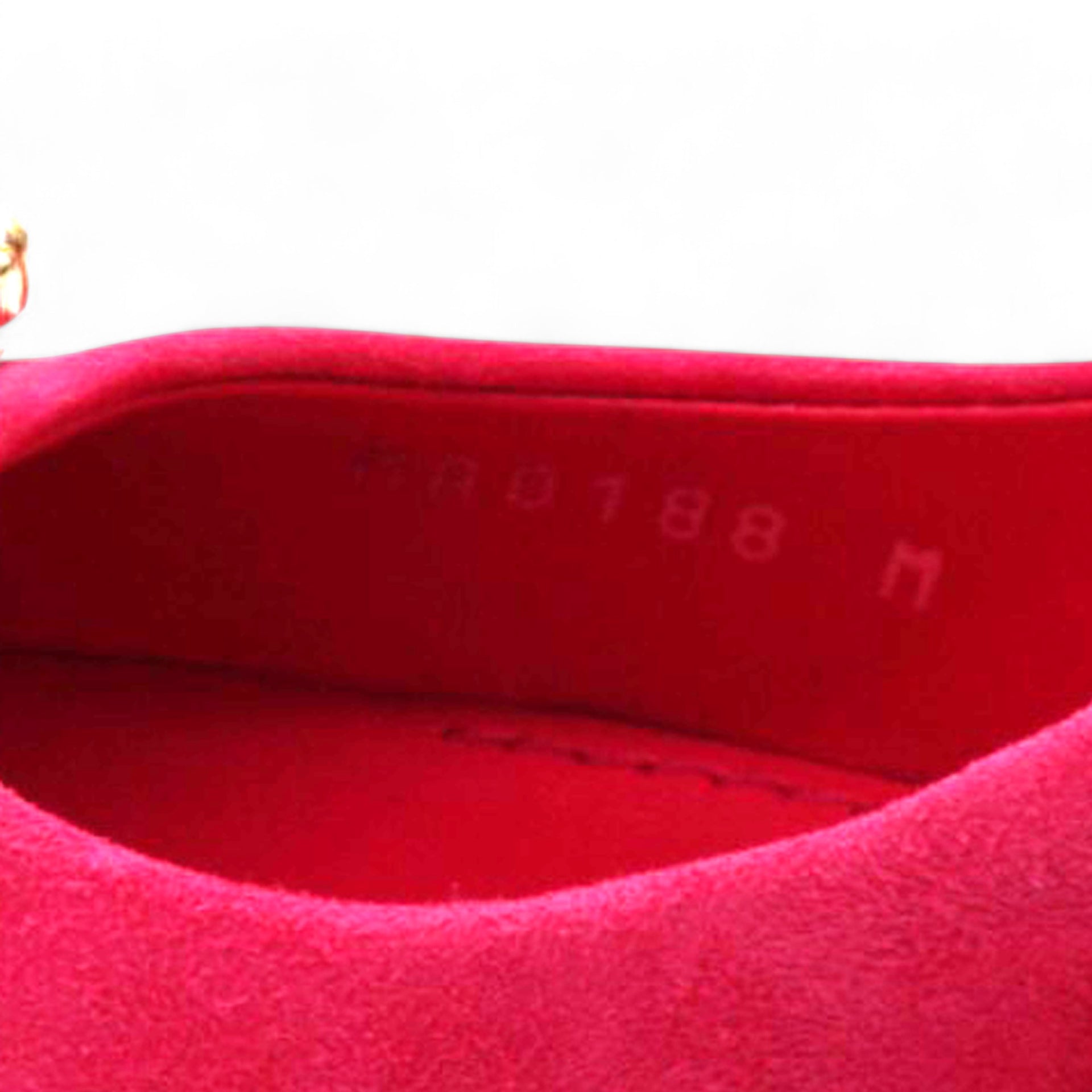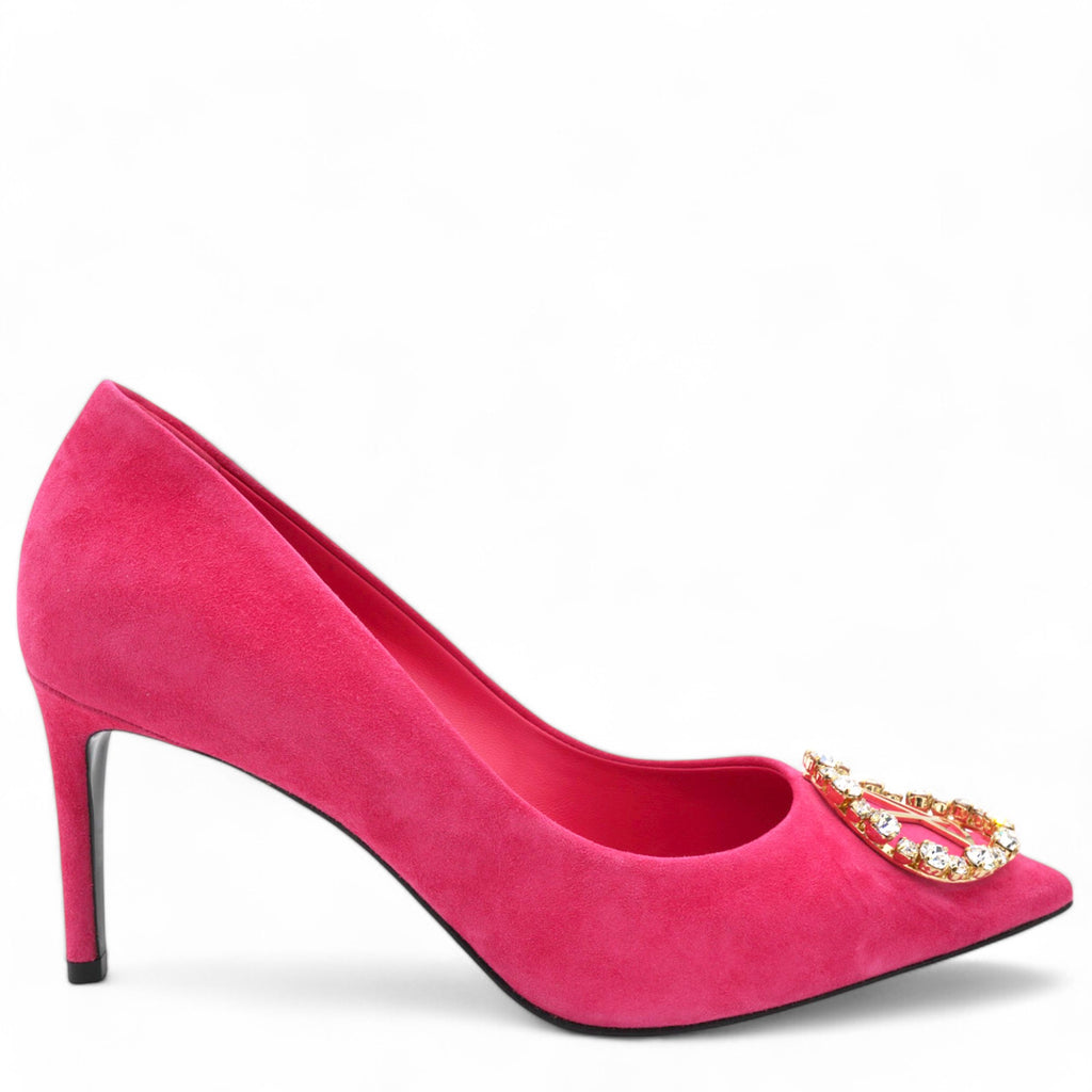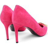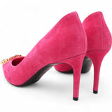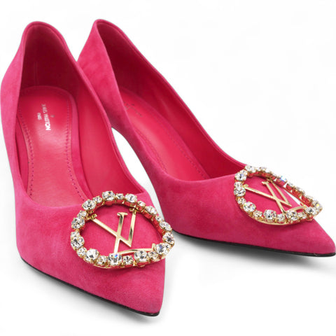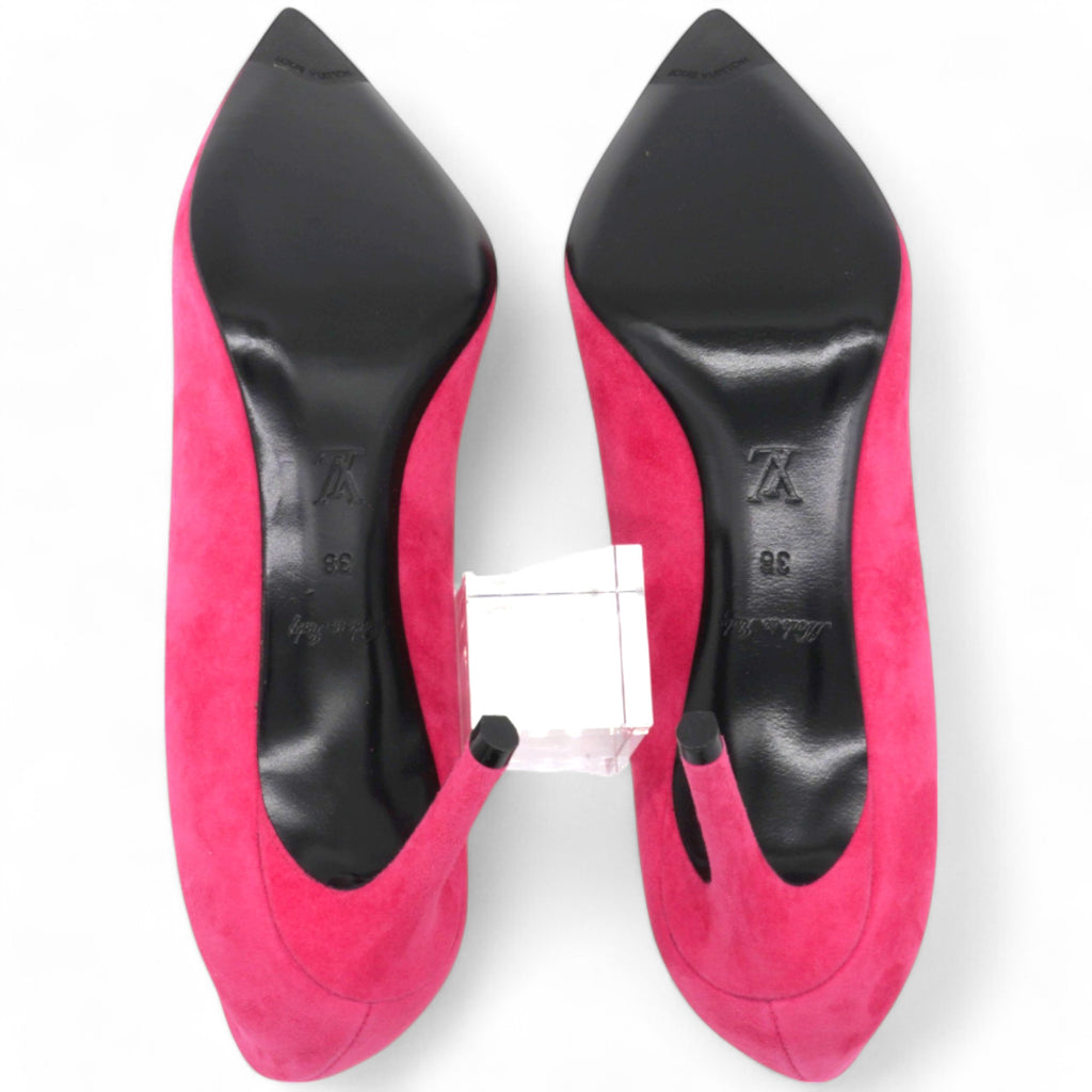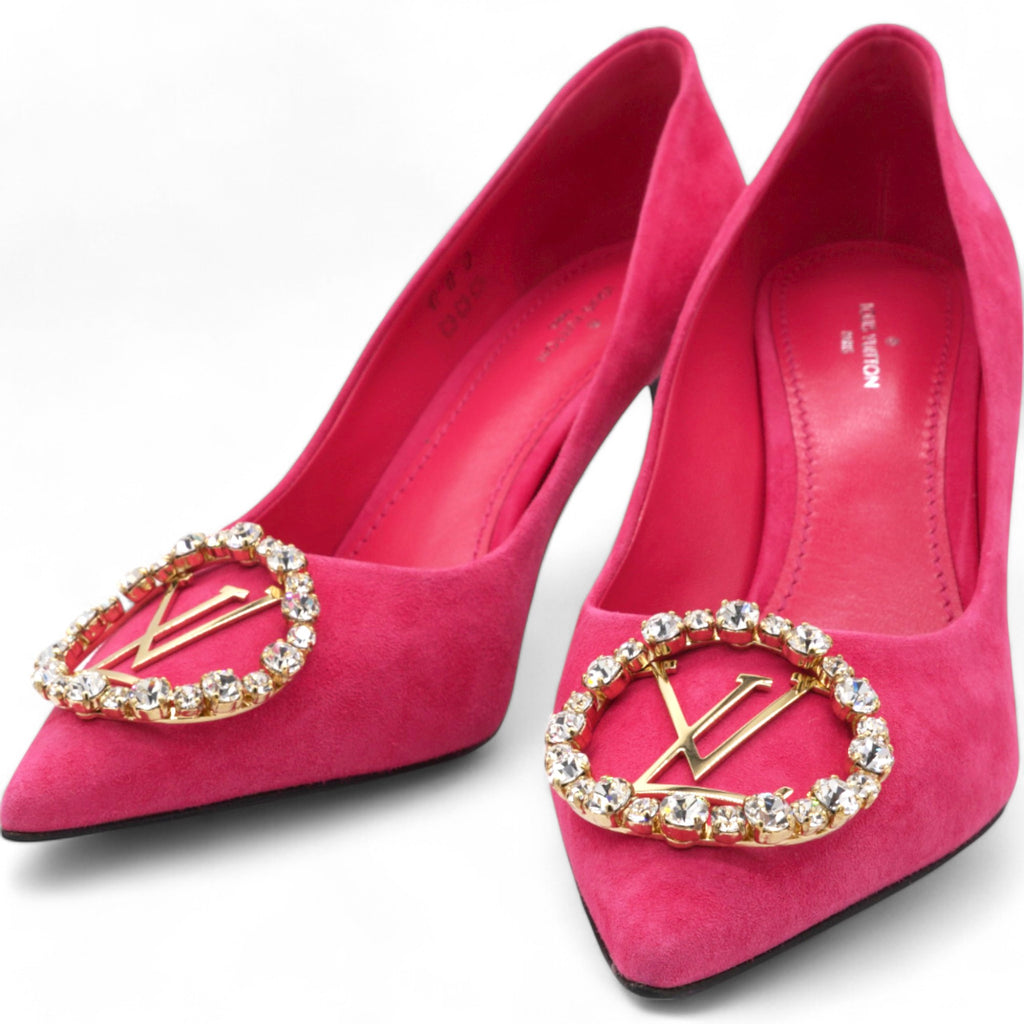 | These stunning heels are crafted of hot pink suede leather. The pumps feature a prominent gold LV logo, a 3.25 inch heel and a pointed toe. |