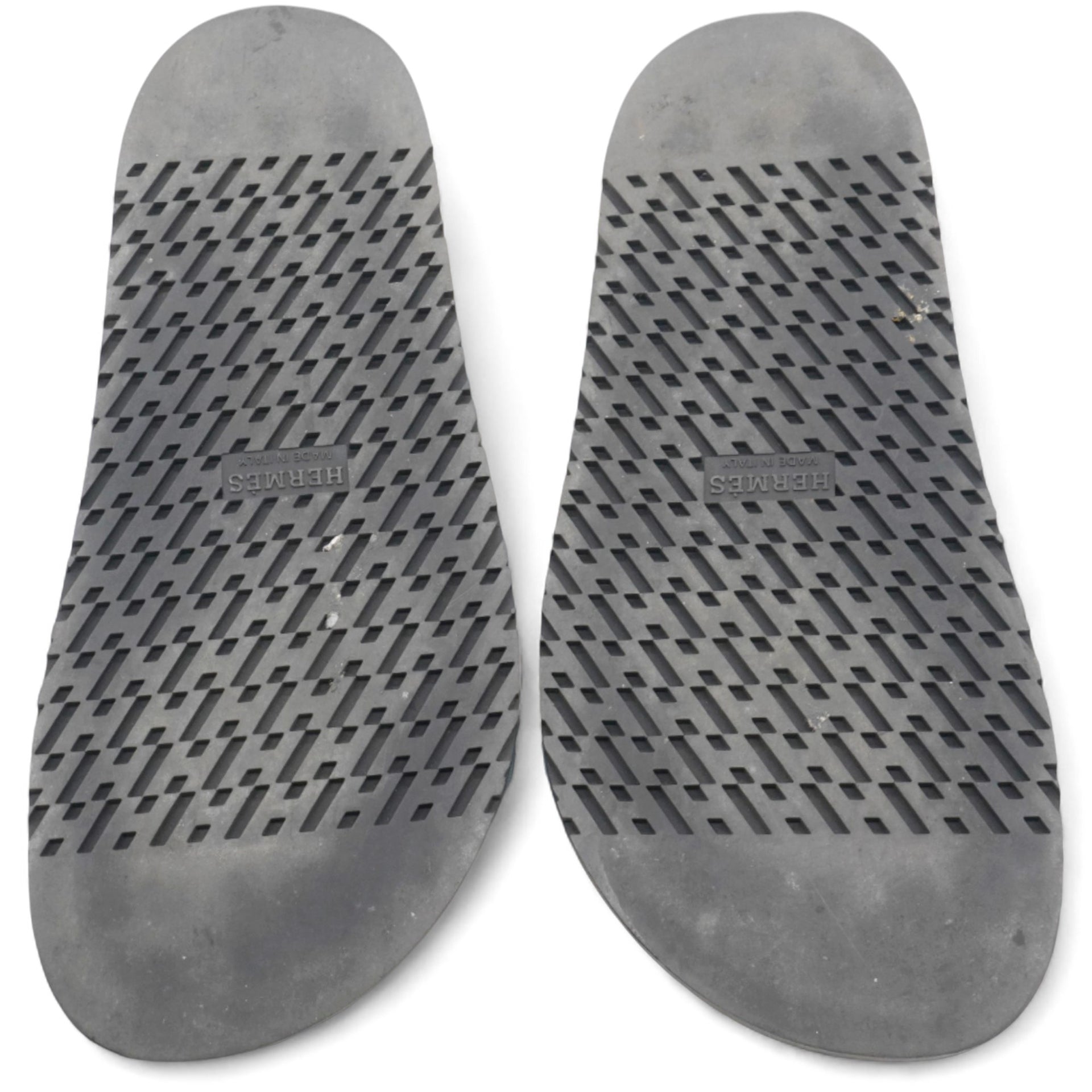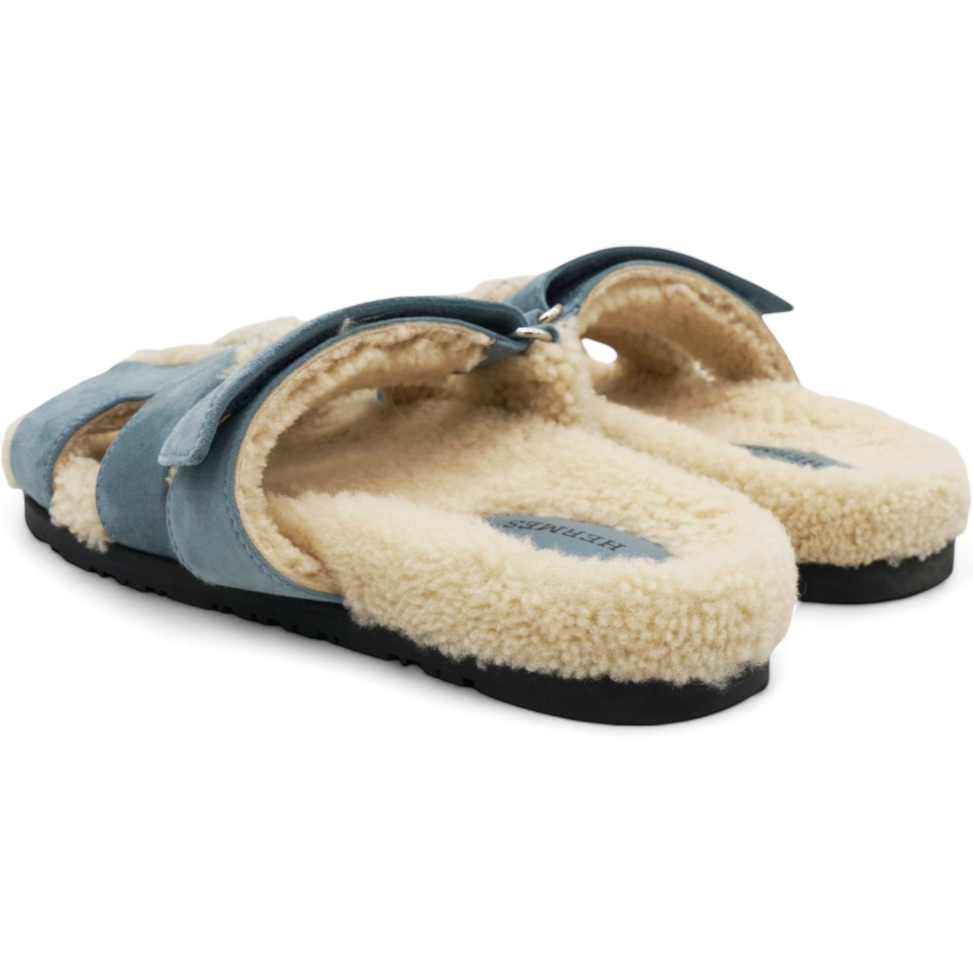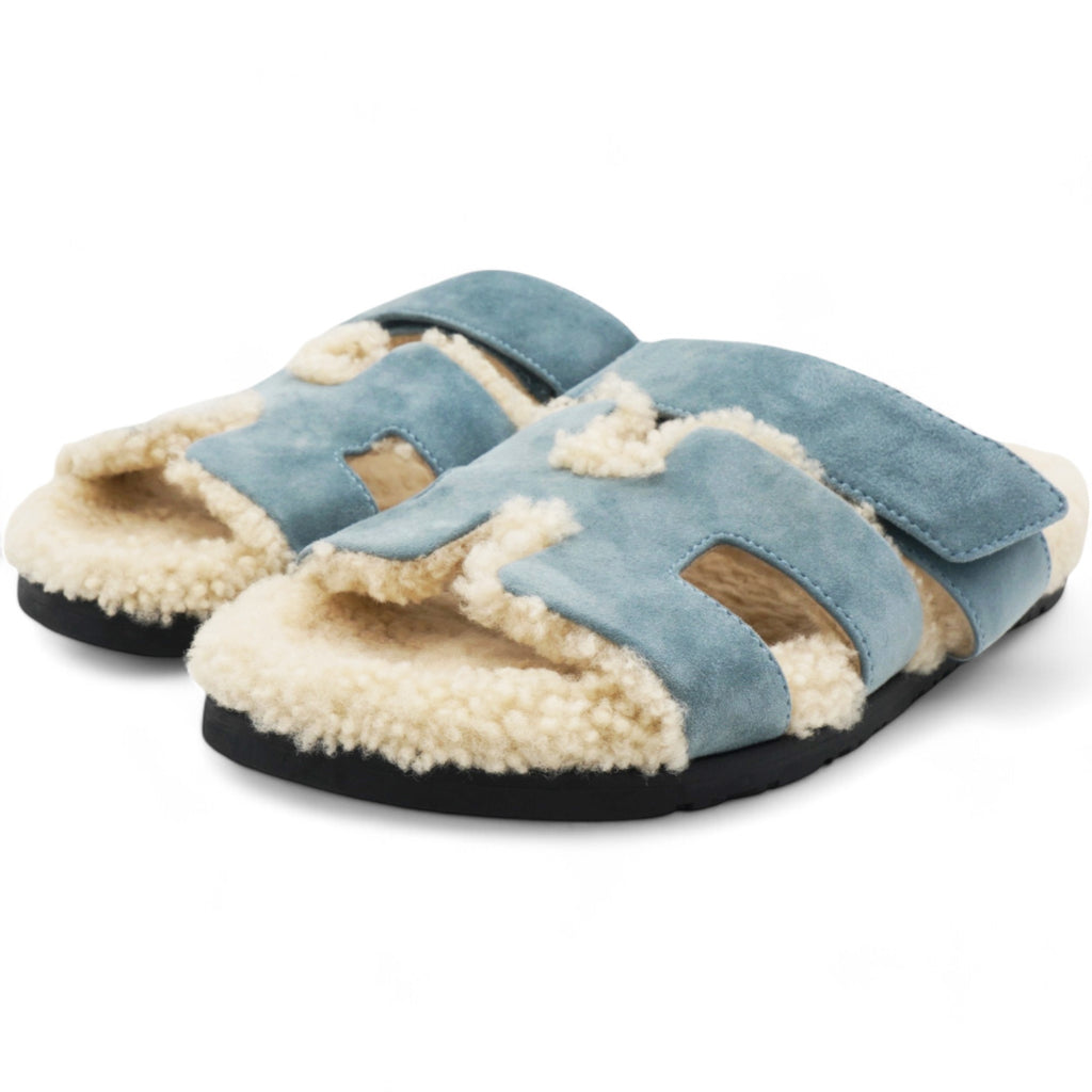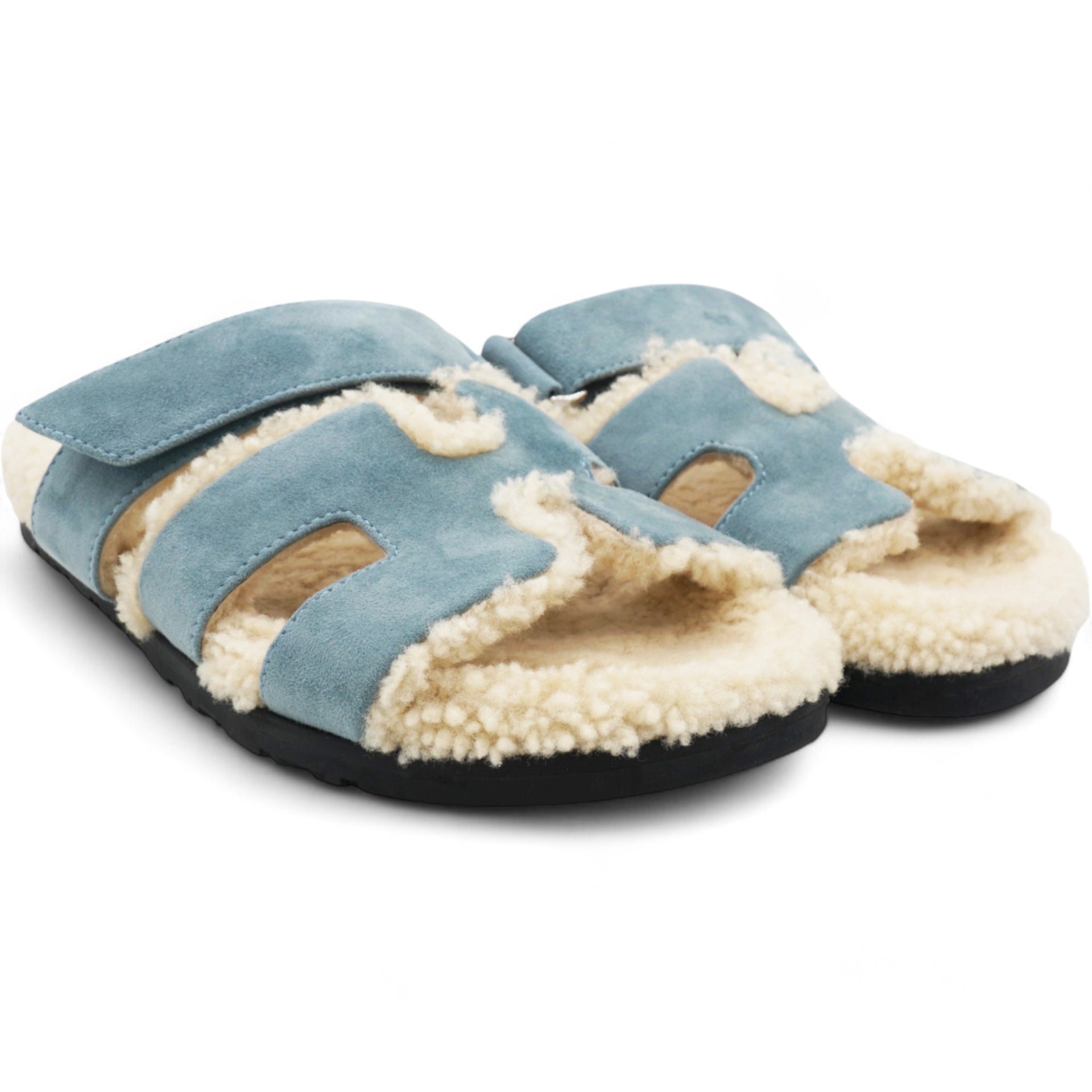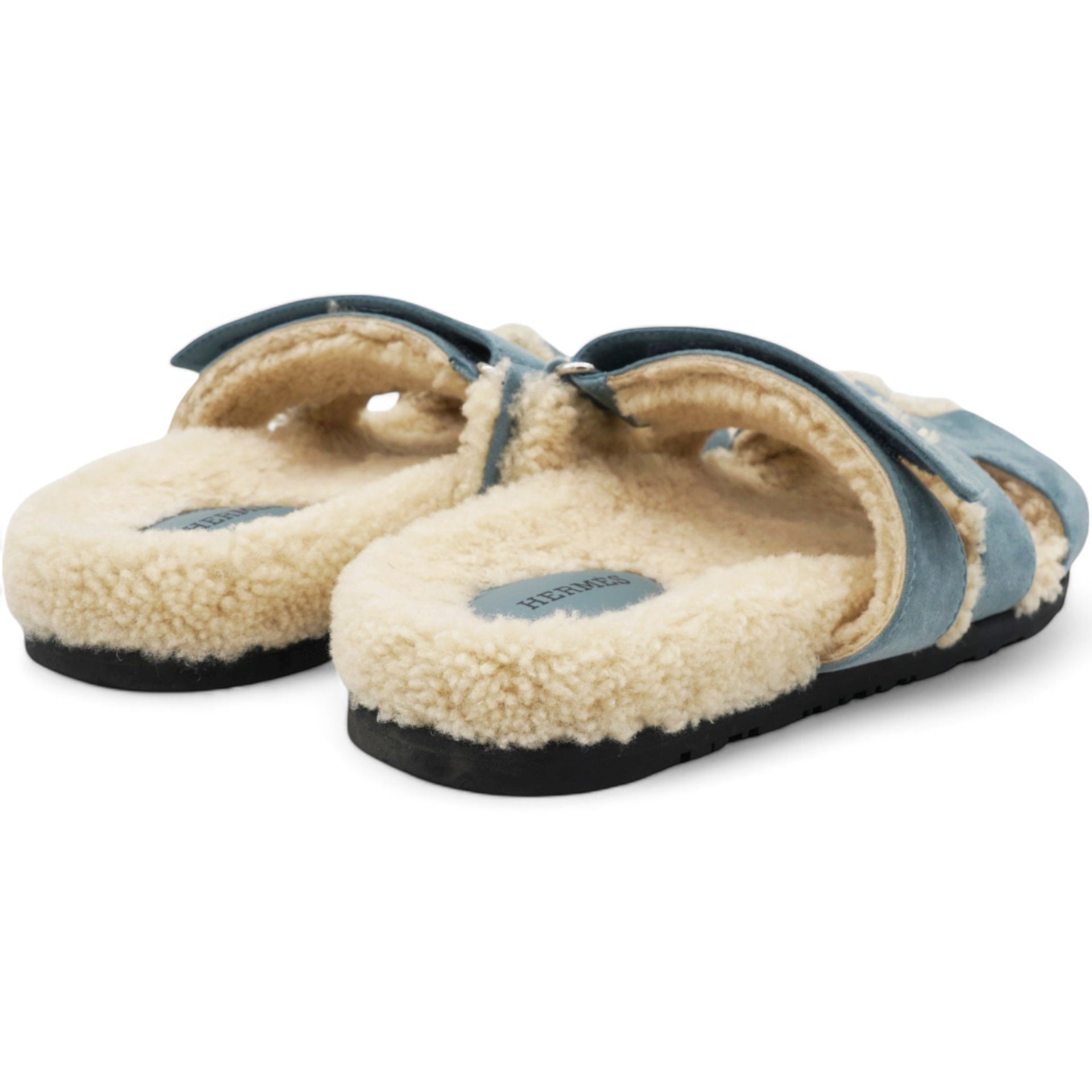 These stylish sandals are crafted of soft goatskin and suede leather in blue. They feature an Hermes H crossover band and a shearling wool-lined insole.