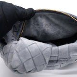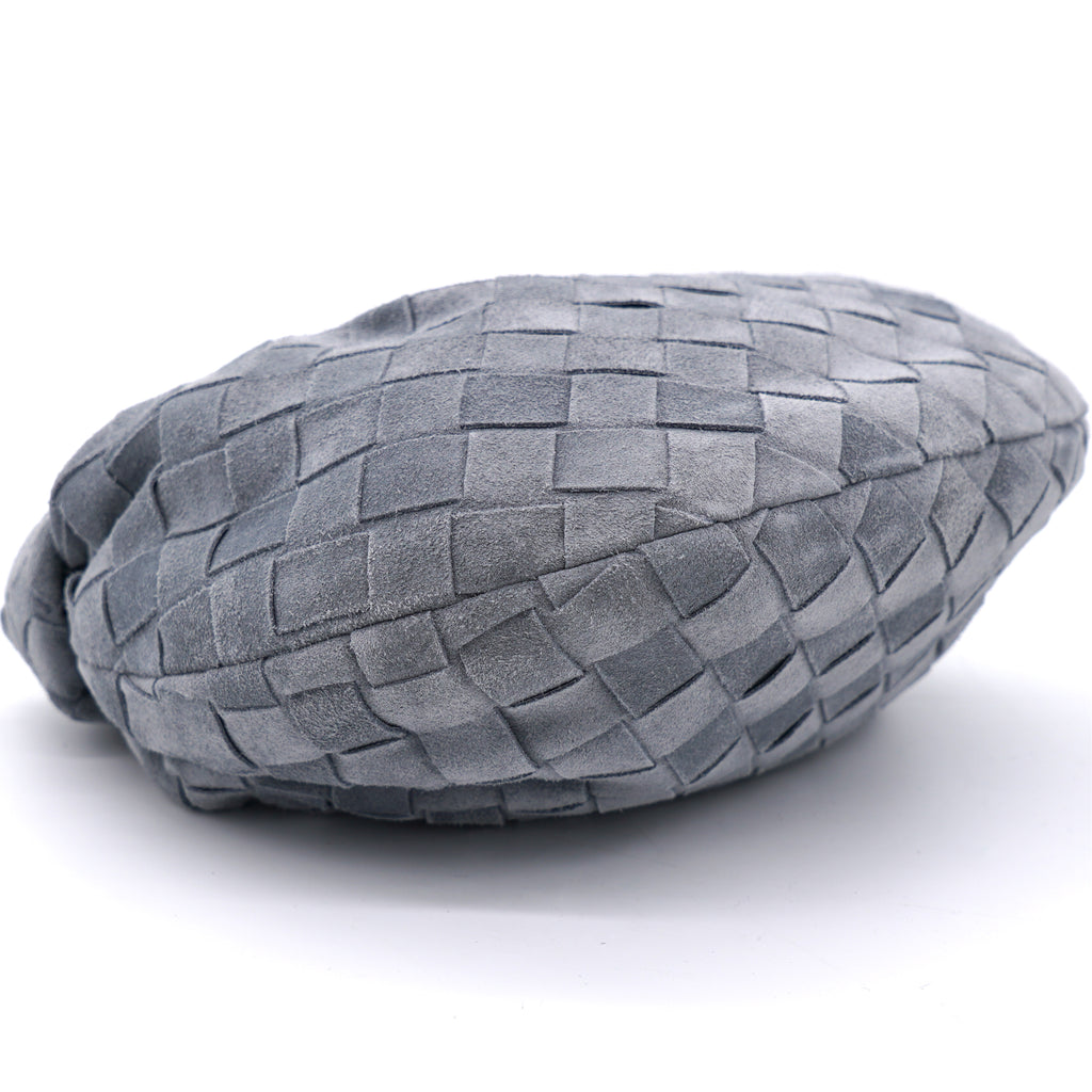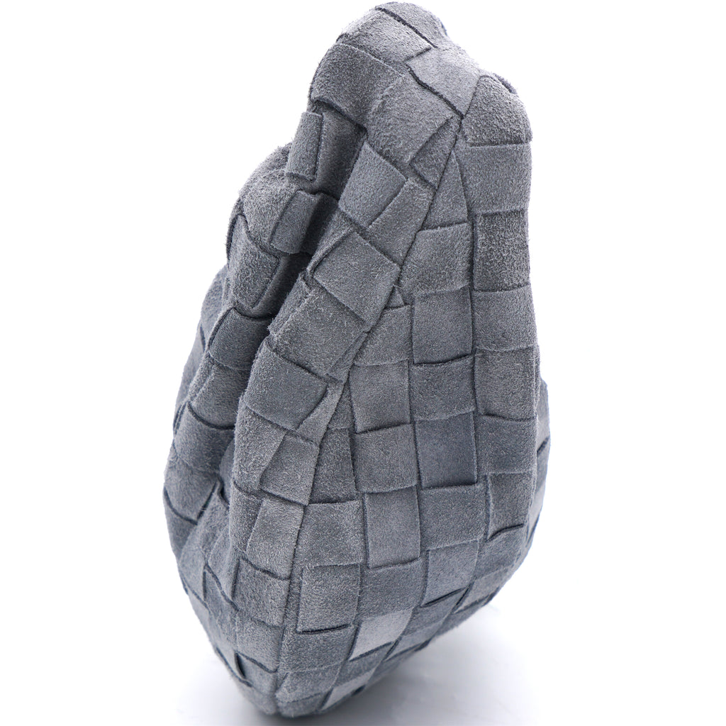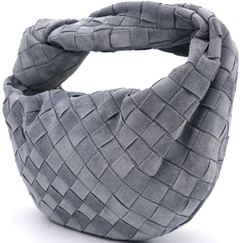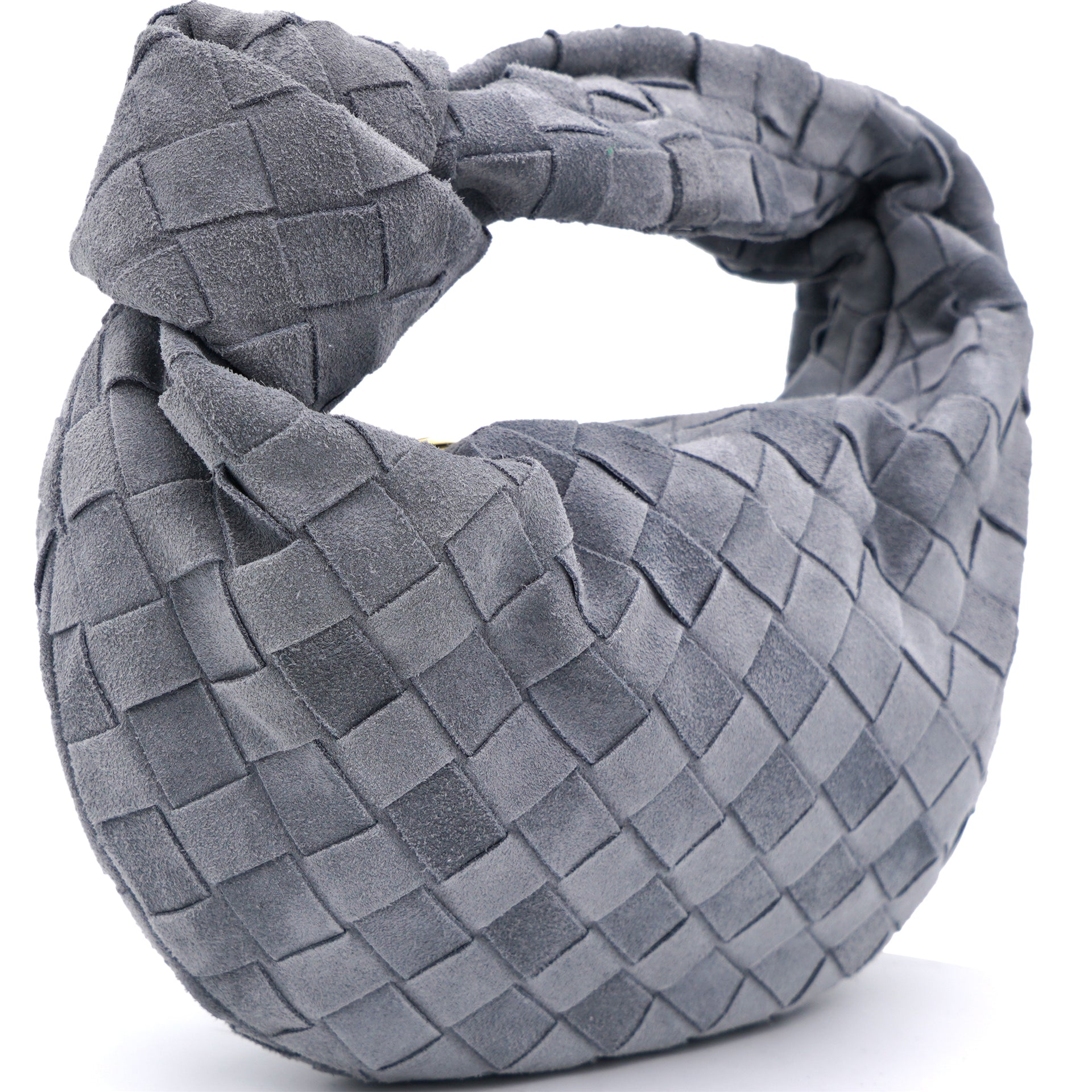 | This stylish shoulder bag is beautifully crafted of soft woven suede leather in light grey. The shoulder bag features a matching handle and a gold top zipper that opens to a compact leather interior. |