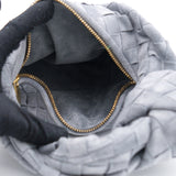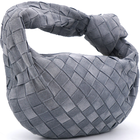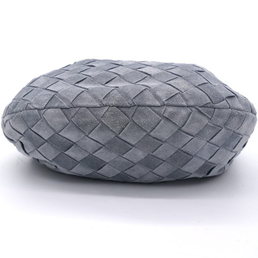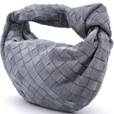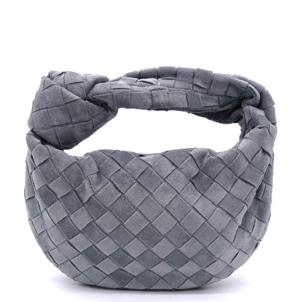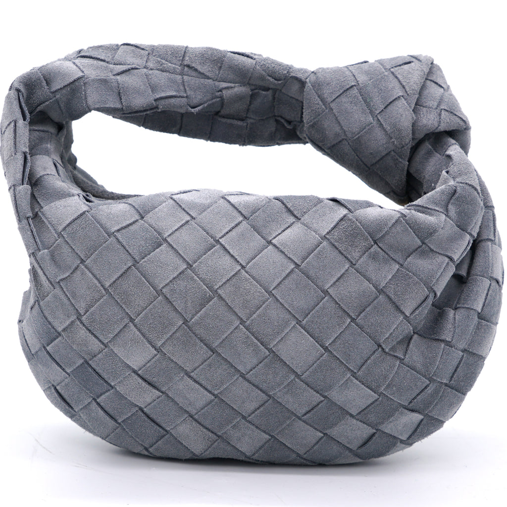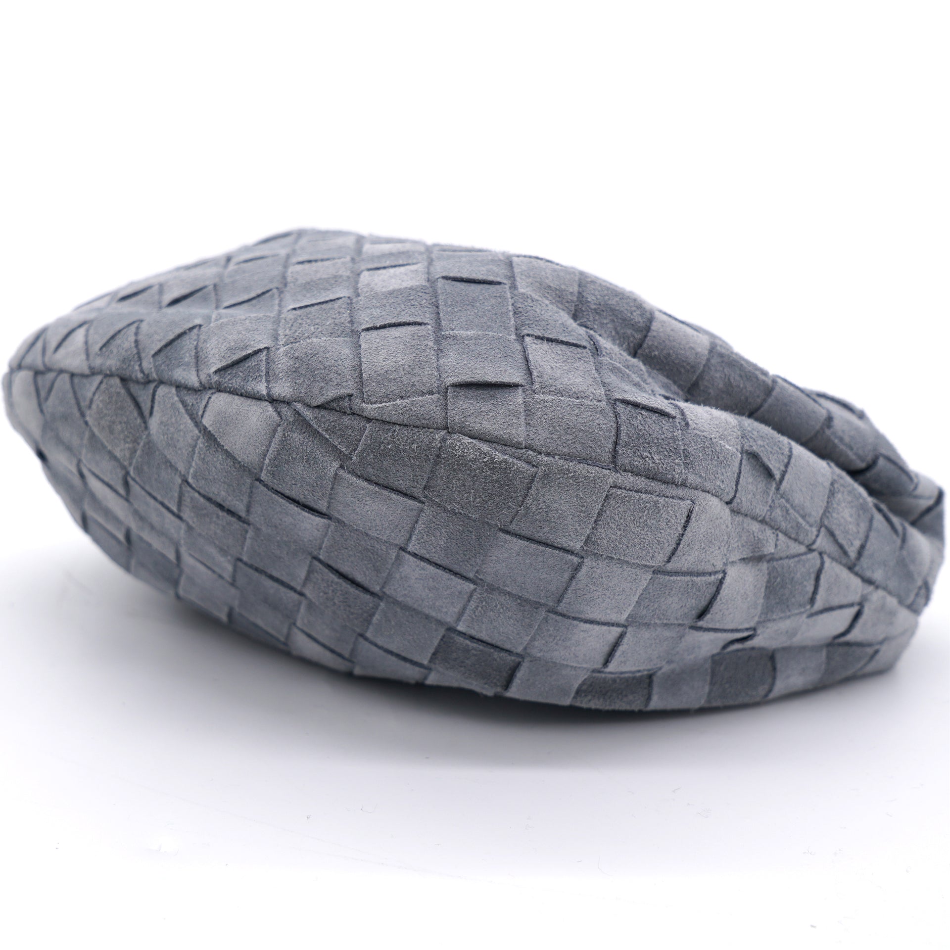 | This stylish shoulder bag is beautifully crafted of soft woven suede leather in light grey. The shoulder bag features a matching handle and a gold top zipper that opens to a compact leather interior. |