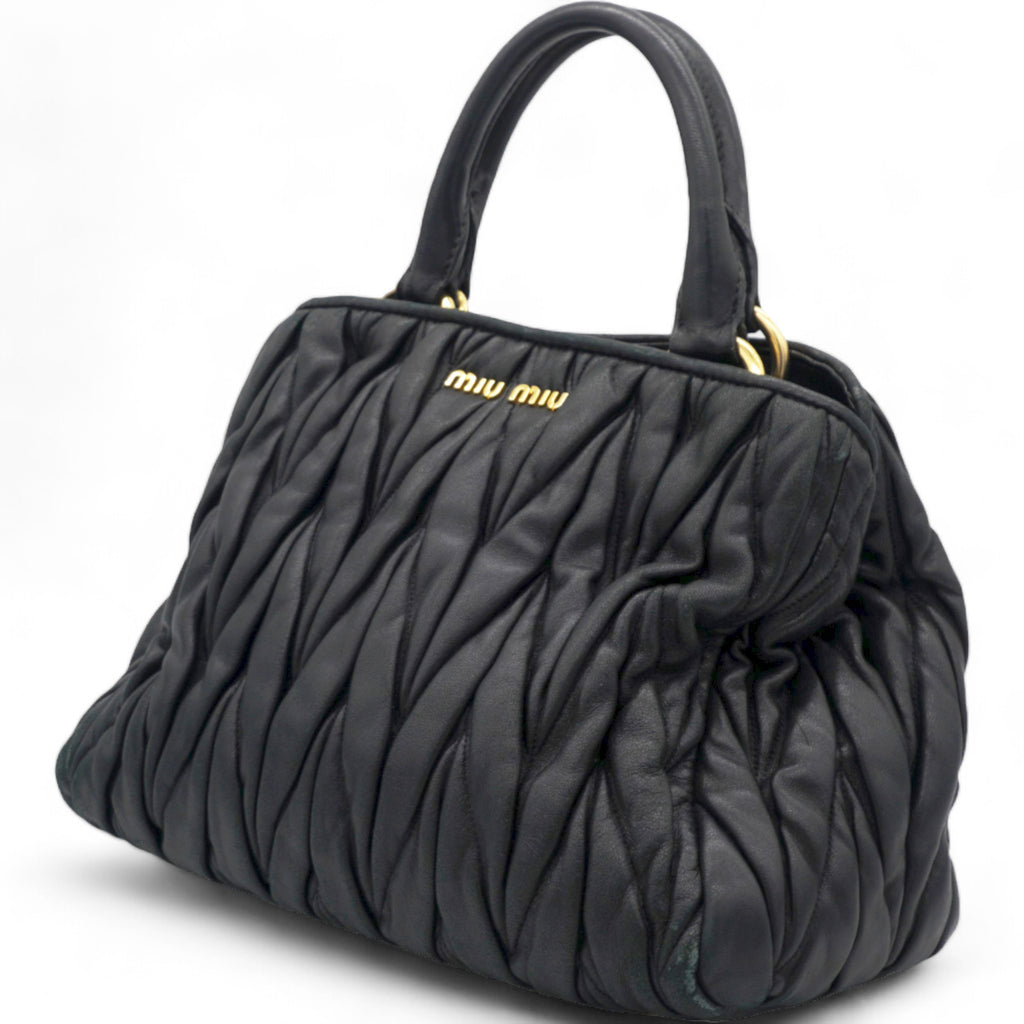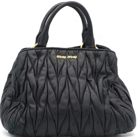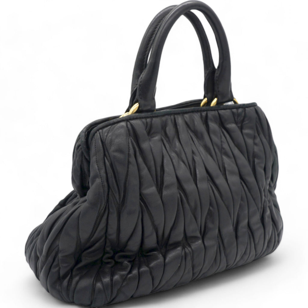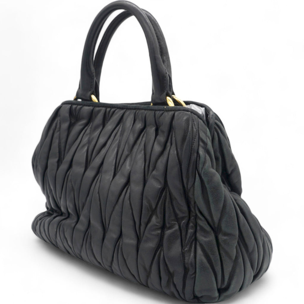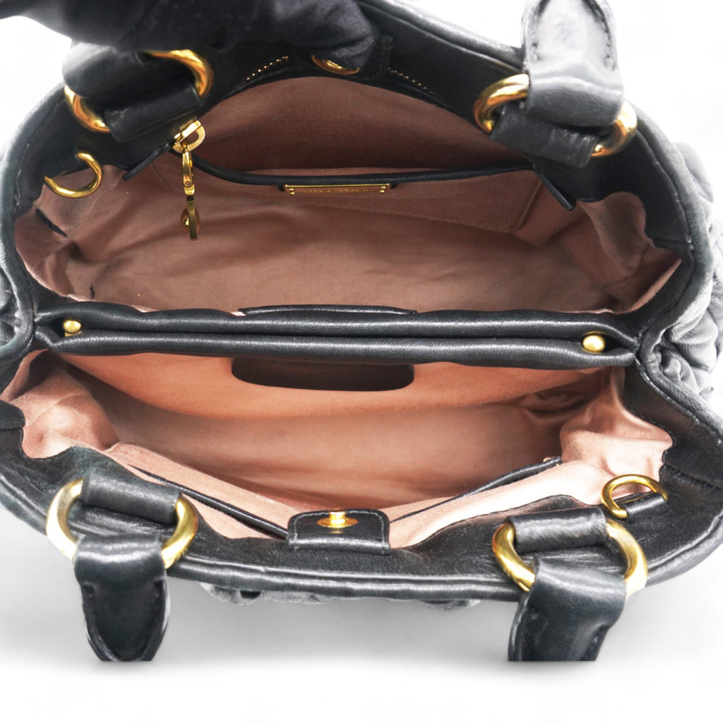 | This stylish hand bag is crafted of decoratively tightly pleated black nappa leather. The shoulder bag features rolled leather top handles and a cross body shoulder strap with polished gold hardware. The open top reveals a mauve pink satin interior with zipper and patch pockets as well as a central pocket. This is an excellent bag for day or evening wear and just the essentials with the forward fashion of Miu Miu! |