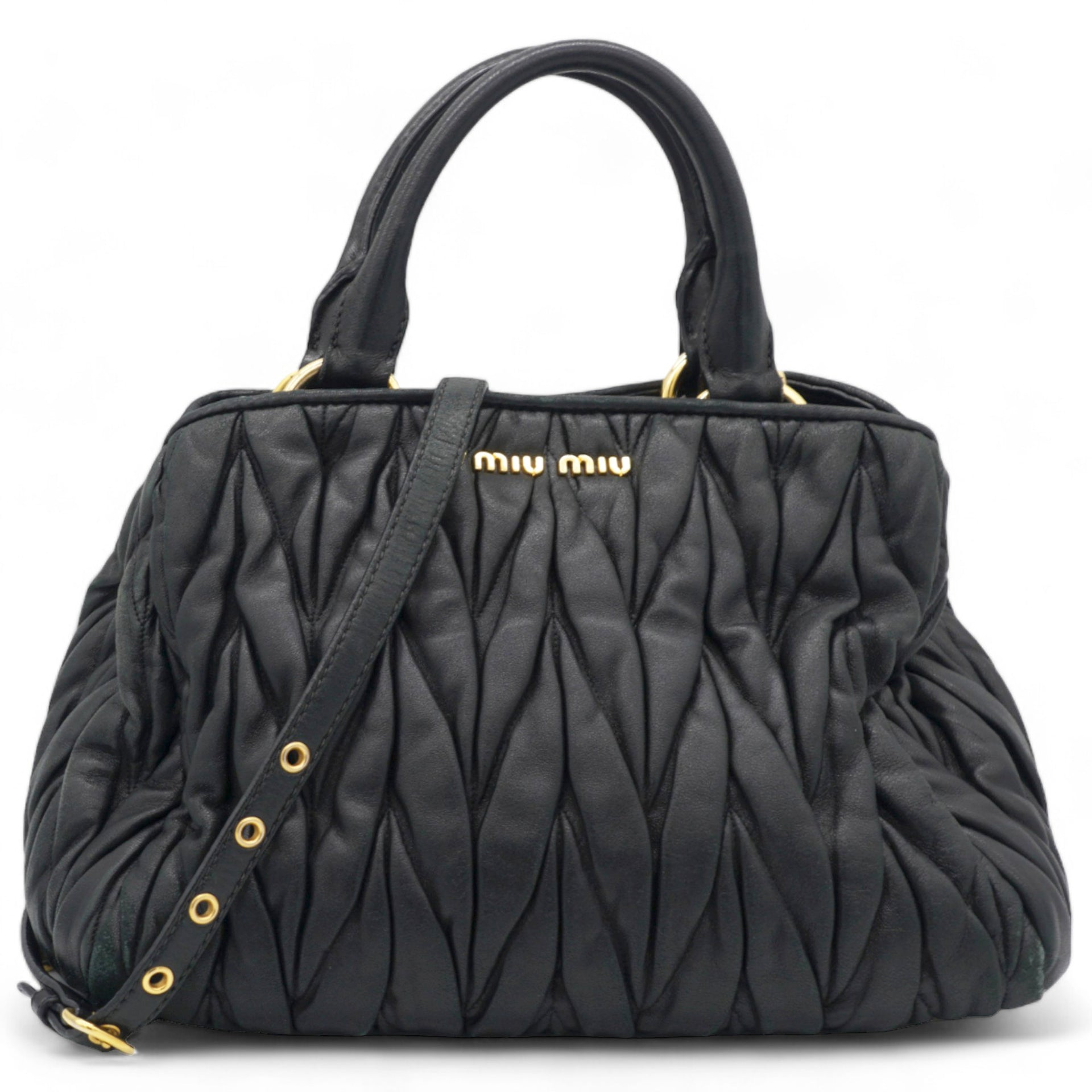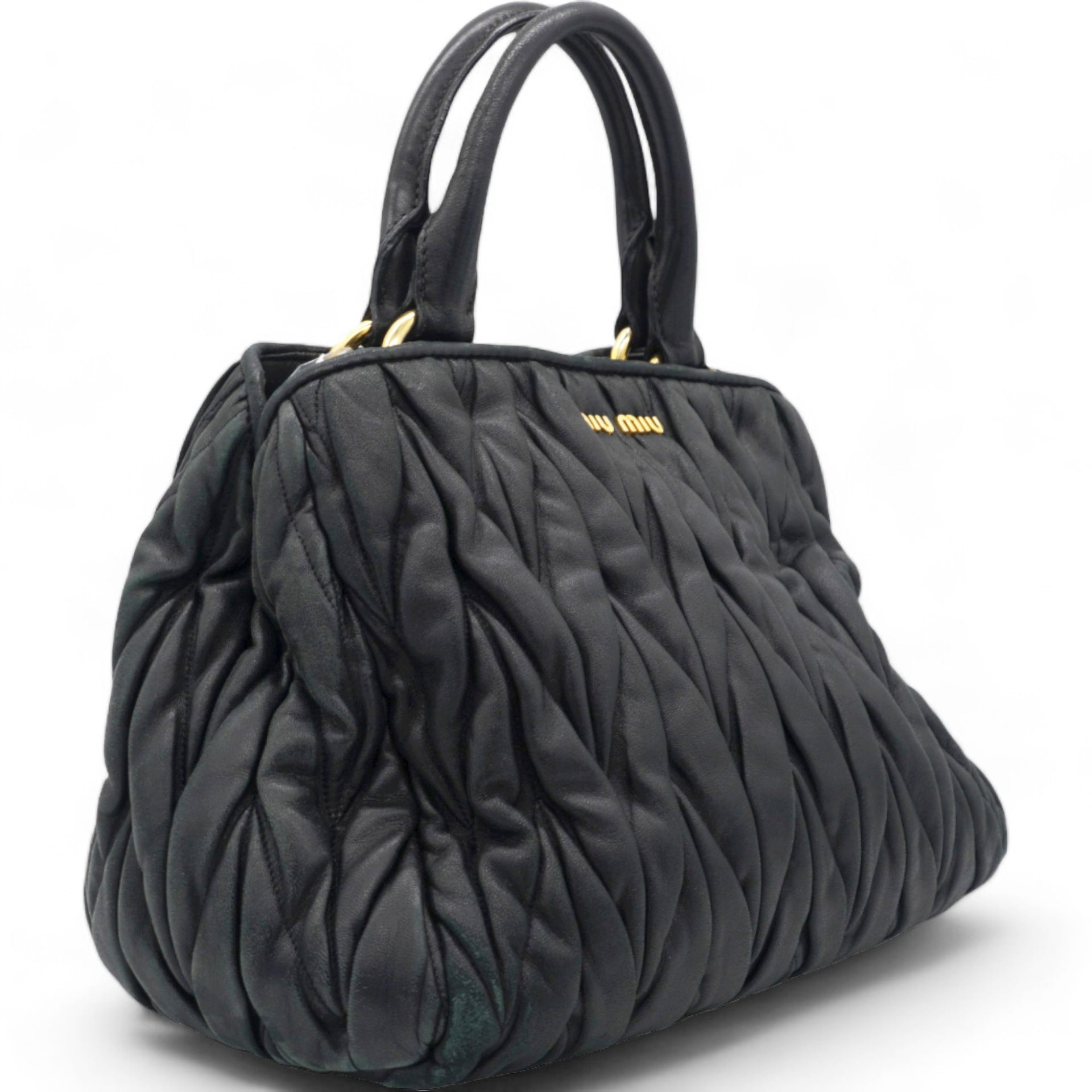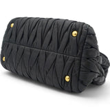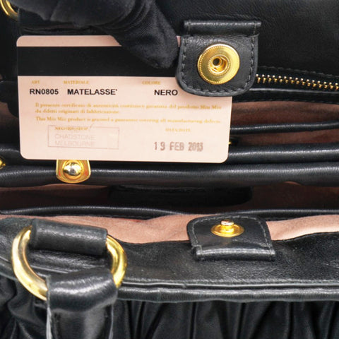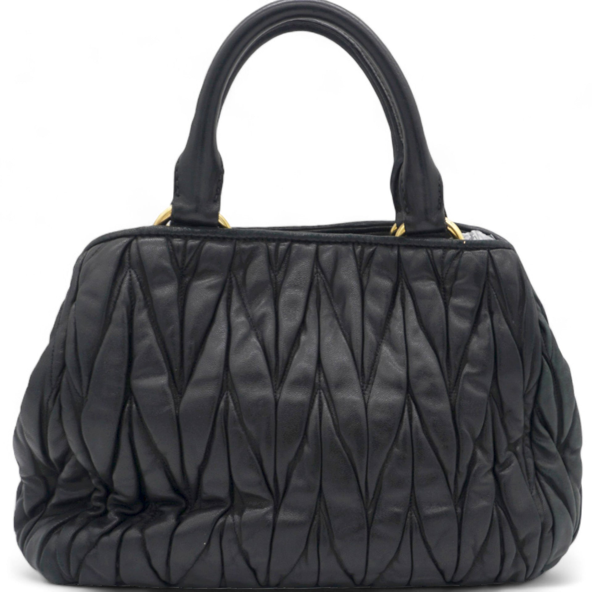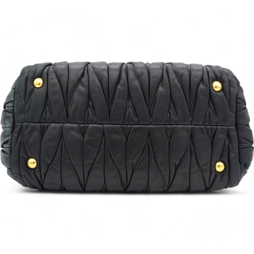 | This stylish hand bag is crafted of decoratively tightly pleated black nappa leather. The shoulder bag features rolled leather top handles and a cross body shoulder strap with polished gold hardware. The open top reveals a mauve pink satin interior with zipper and patch pockets as well as a central pocket. This is an excellent bag for day or evening wear and just the essentials with the forward fashion of Miu Miu! |