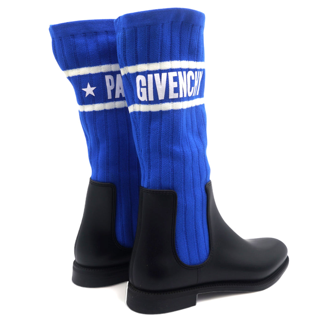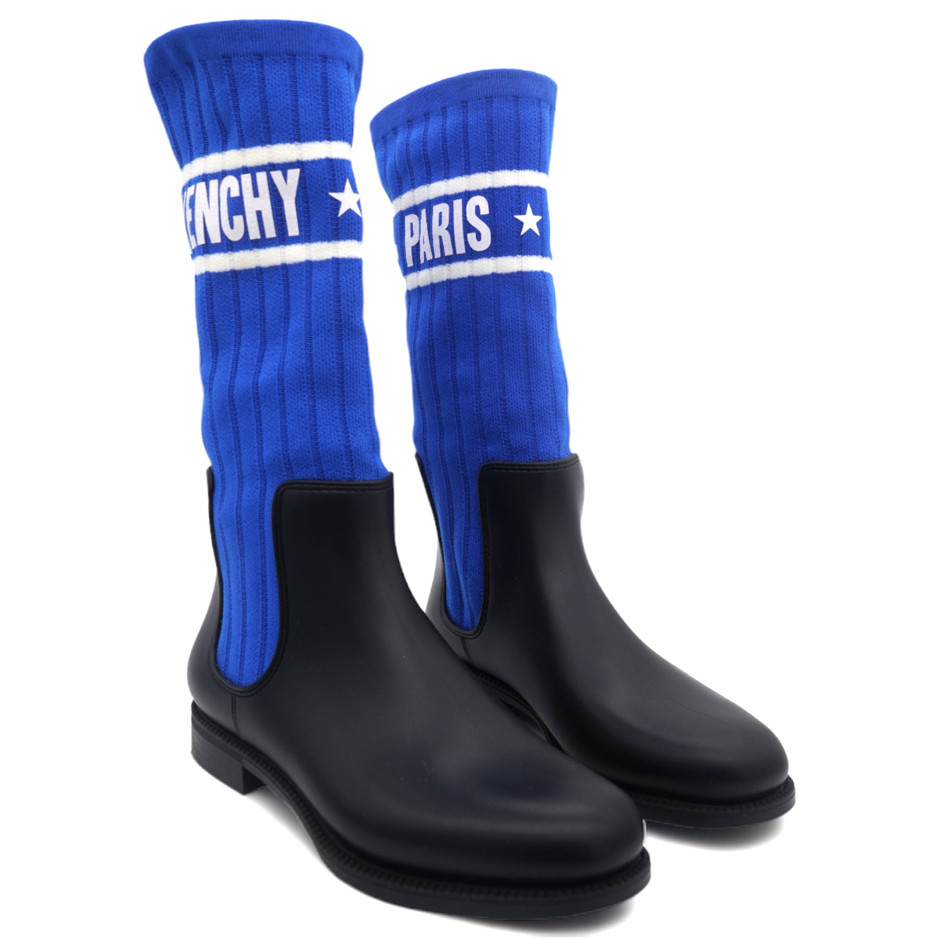 | These rubber socks boots feature printed logo in ivory on blue background an finished with rubber sole and upper. |