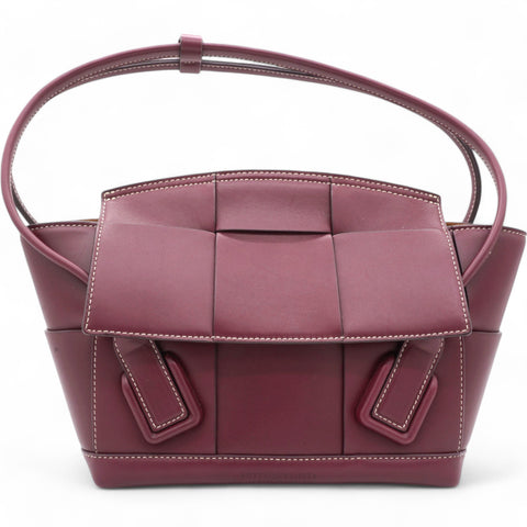 | This stylish shoulder bag is crafted of woven lambskin leather in burgundy. The bag features a basket shape, with smooth looping leather shoulder straps. The front flap opens to a brown suede leather interior with hanging zipper and patch pockets. |