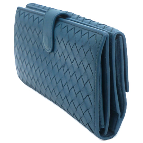 | This Bottega Veneta wallet is crafted in Woven Intrecciato Nappa Leather in Blue with gunmetal-tone hardware and a leather matching interior. This Bottega Veneta wallet features a snap button that open to two bill compartment, nine credit card slots and coin compartment on the other side. |