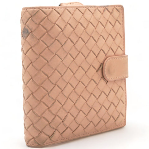 | This Bottega Veneta wallet is crafted in Woven Intrecciato Nappa Leather with gunmetal-tone hardware and a beige leather interior. This Bottega Veneta wallet features a snap buttons that open to one bill pocket, eight credit card slots and separate coin compartment. |