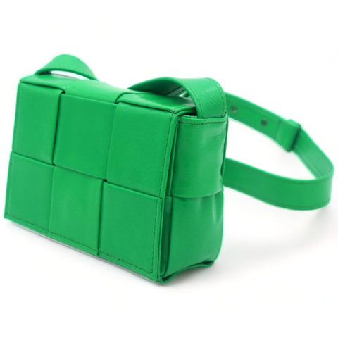 | This stylish messenger bag is crafted of woven lambskin leather in green. The bag features a matching adjustable crossbody strap with gold hardware and a front flap that opens to a matching interior. |