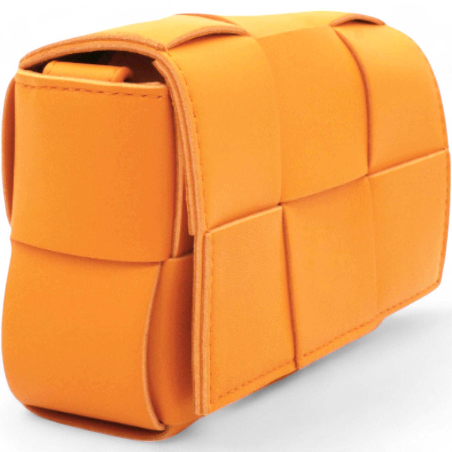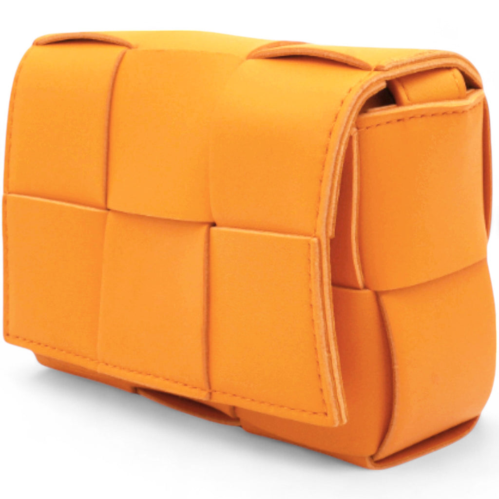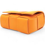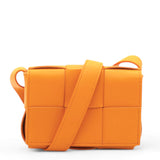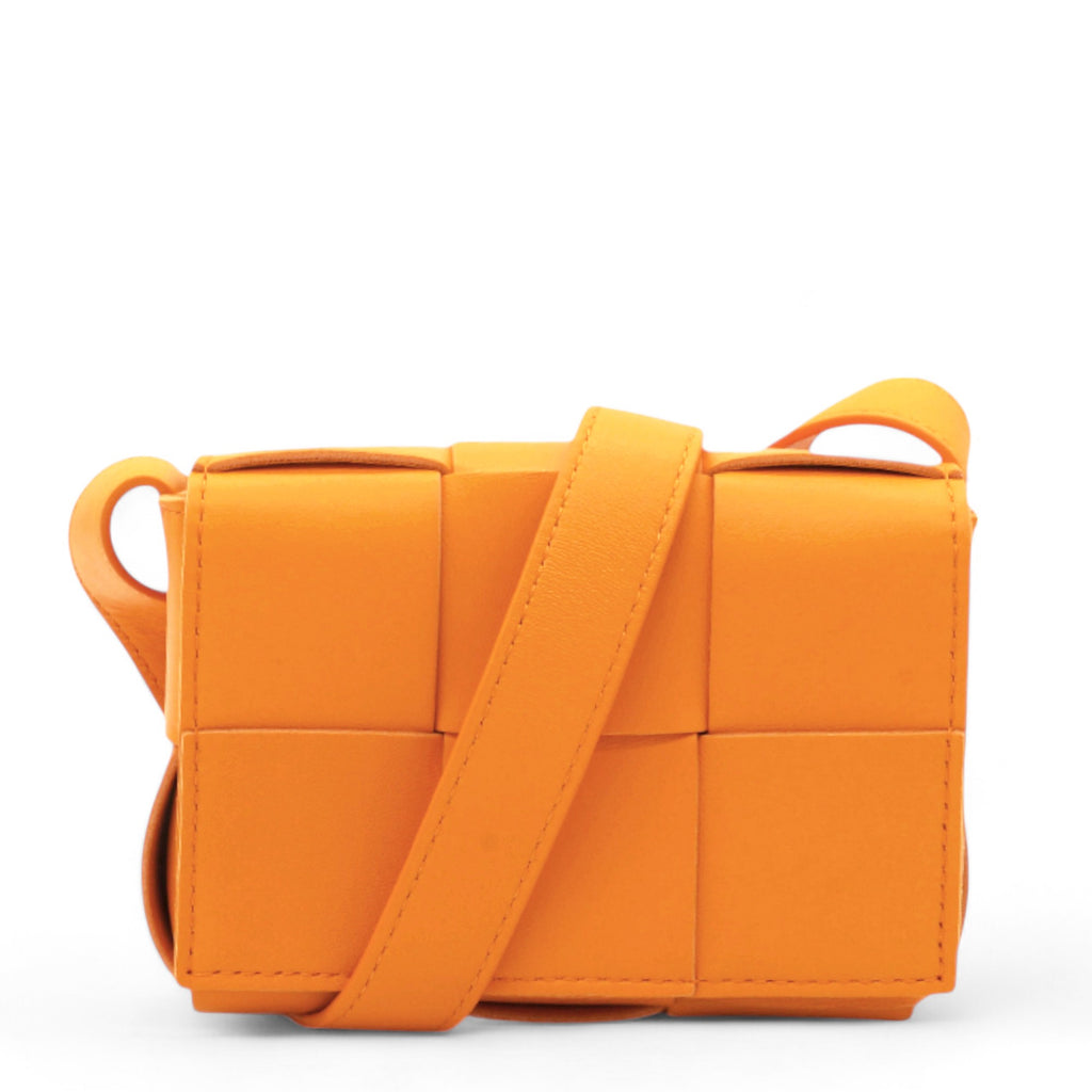 | This stylish messenger bag is crafted of leather in orange. The bag features a matching adjustable crossbody strap and a front flap that opens to a matching interior with a card slot. |