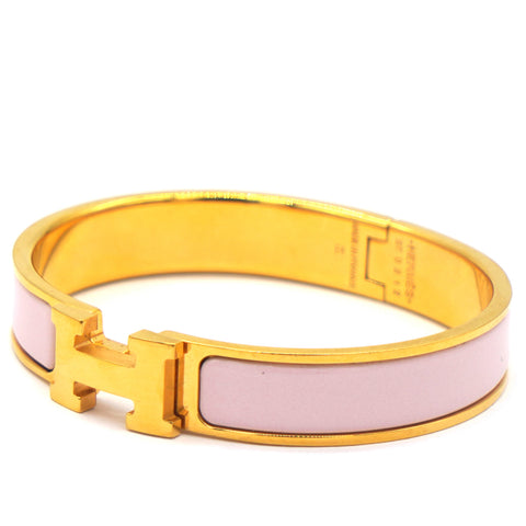 This elegant 'Clic H' bracelet from the house of Hermes is designed in a narrow silhouette. It features a gold-plated body with pink enamel on it and the iconic 'H' logo swivel at the centre. Wear it with your favourite watch or as a solo piece.