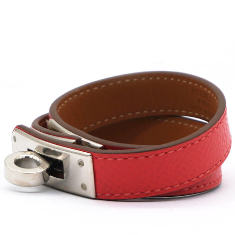 | This exceptional bracelet is crafted of smooth calfskin leather in a red orange color with a palladium silver end that wraps around the wrist twice, a "Double Tour" and seals with a palladium silver signature Kelly turn lock closure at the other end. The bracelet is sophisticated and charming and will add character and dimension to your wardrobe, only from Hermes! |