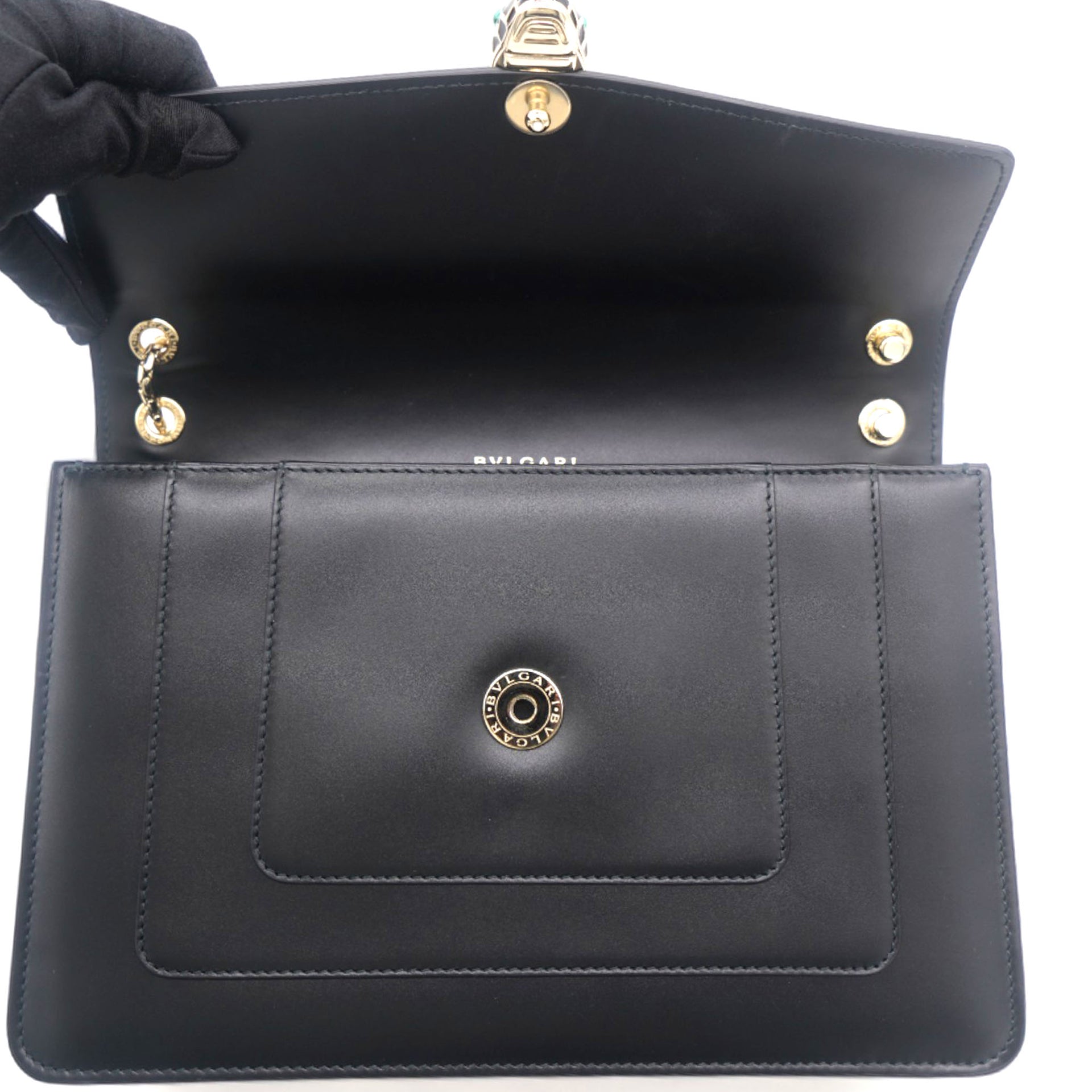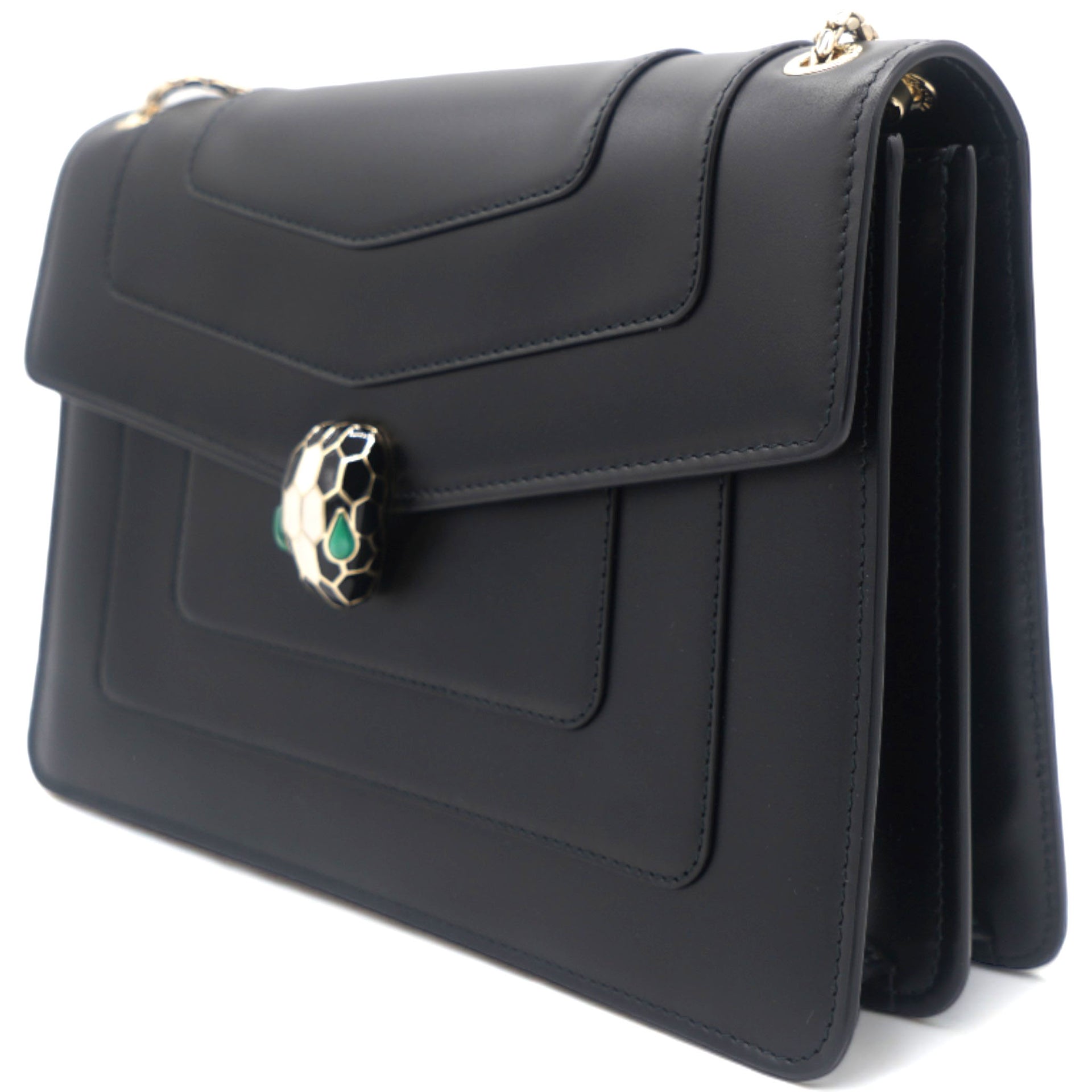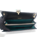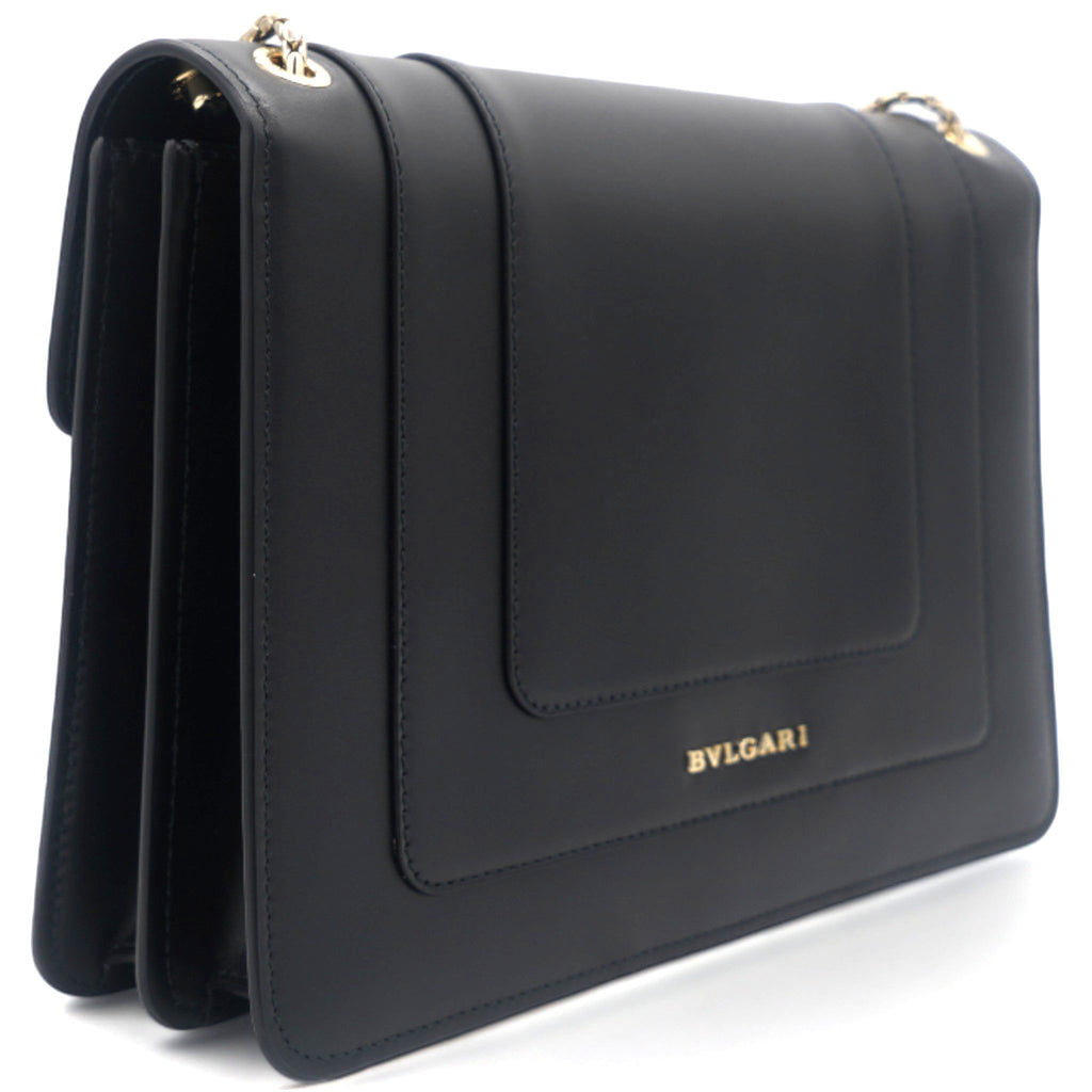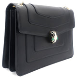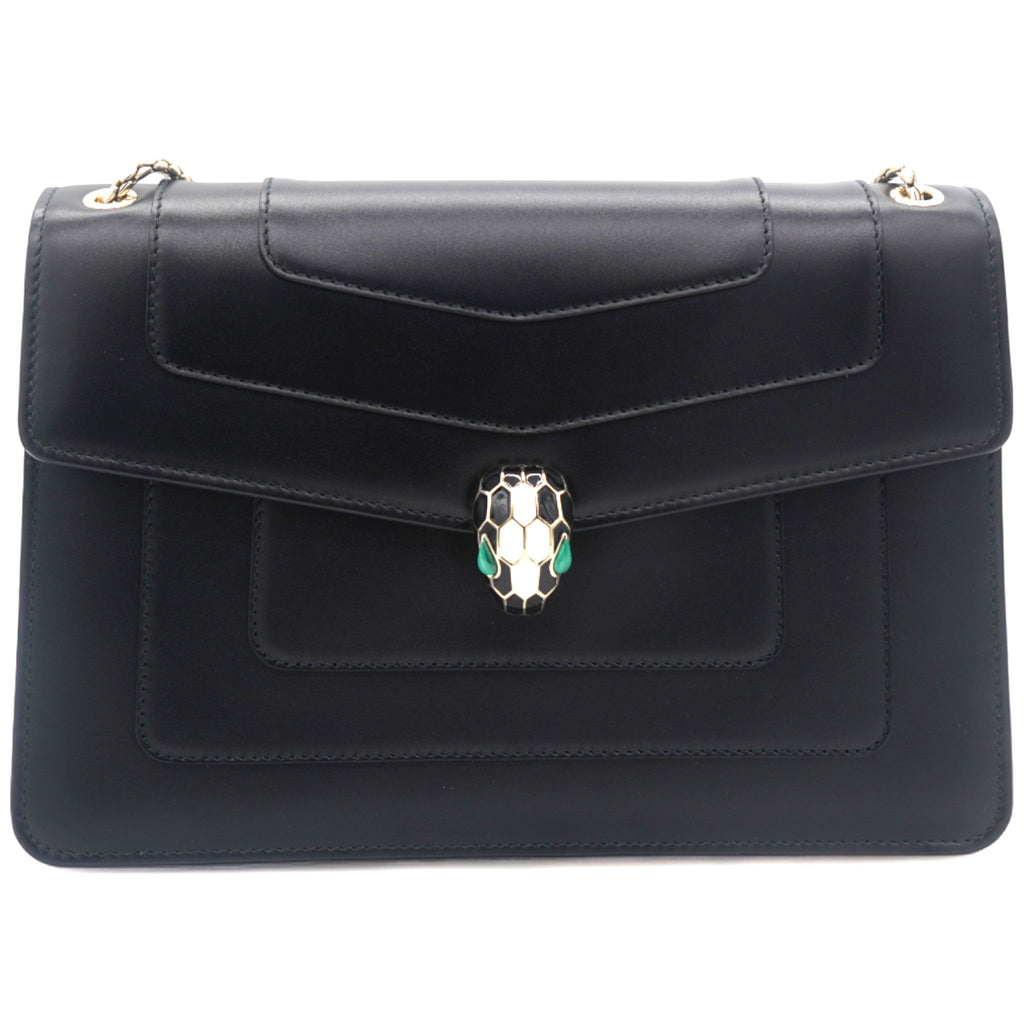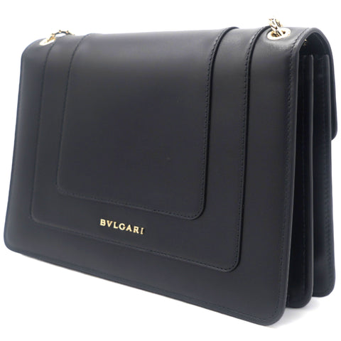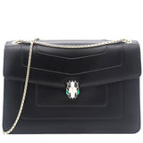 | Dazzle the eyes that fall on you when you swing this stunning Bvlgari creation. Crafted from leather in a breathtaking black hue, the shoulder bag is styled with a flap that has the iconic Serpenti head closure. The bag has a spacious canvas interior and a gorgeous gold-tone chain link for an easy carrying experience. |