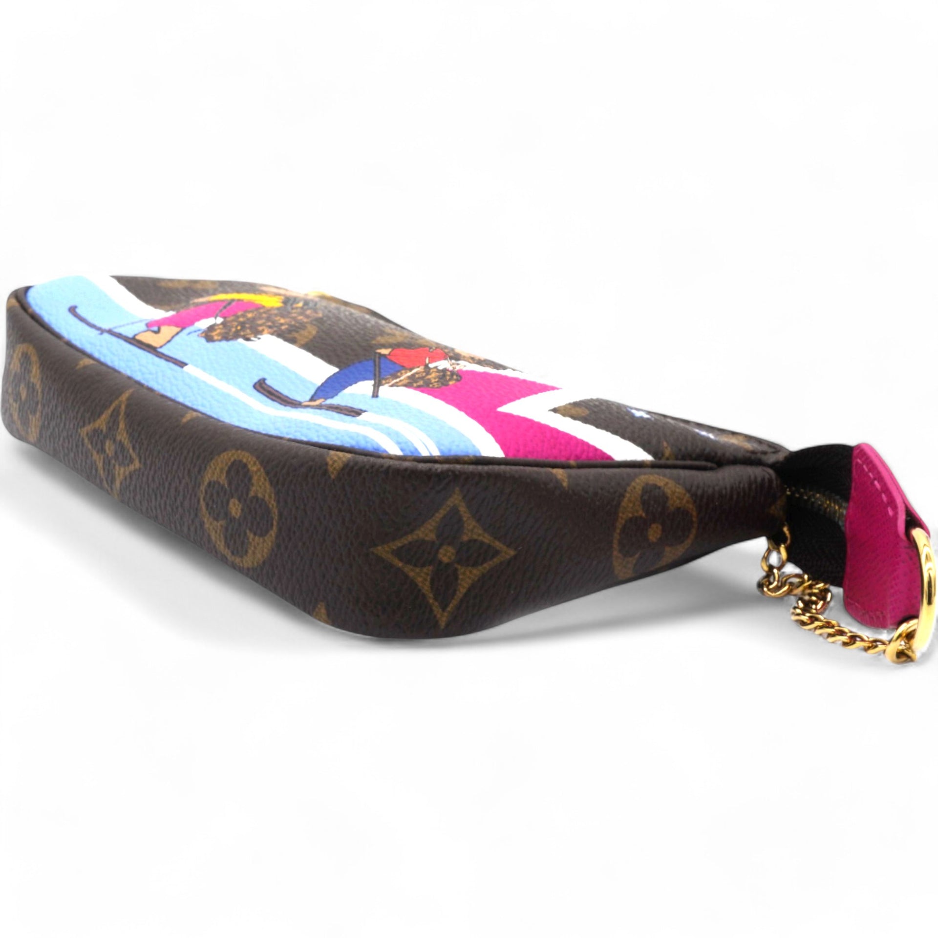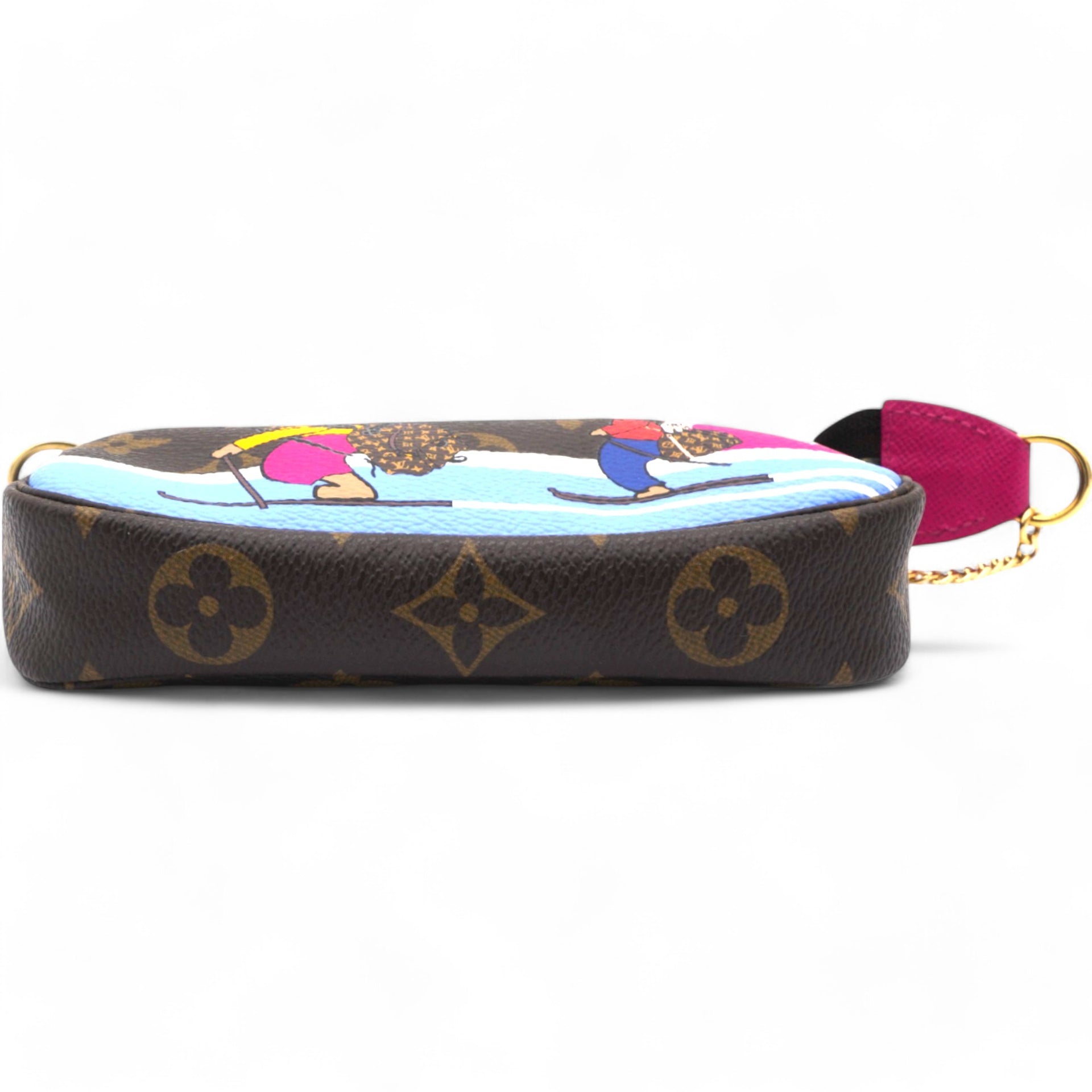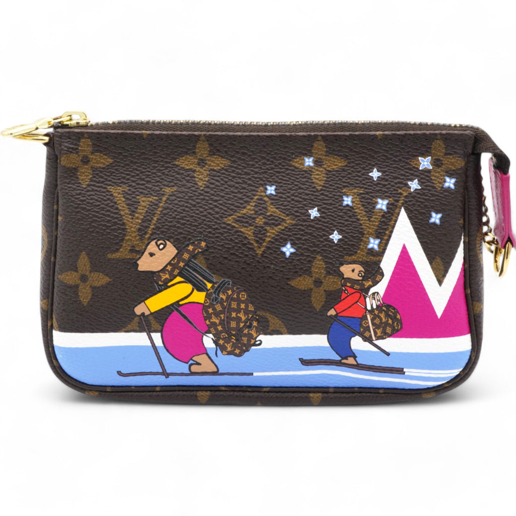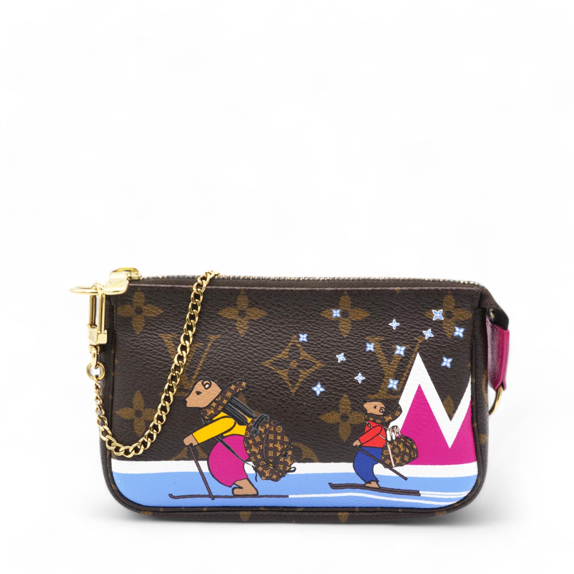 | This mini pouch is crafted of traditional monogram coated canvas and features a playful print of bears skiing. The bag features a polished brass chain wrist strap with a clasp at one end. The top zipper opens to a vibrant pink fabric interior. |