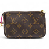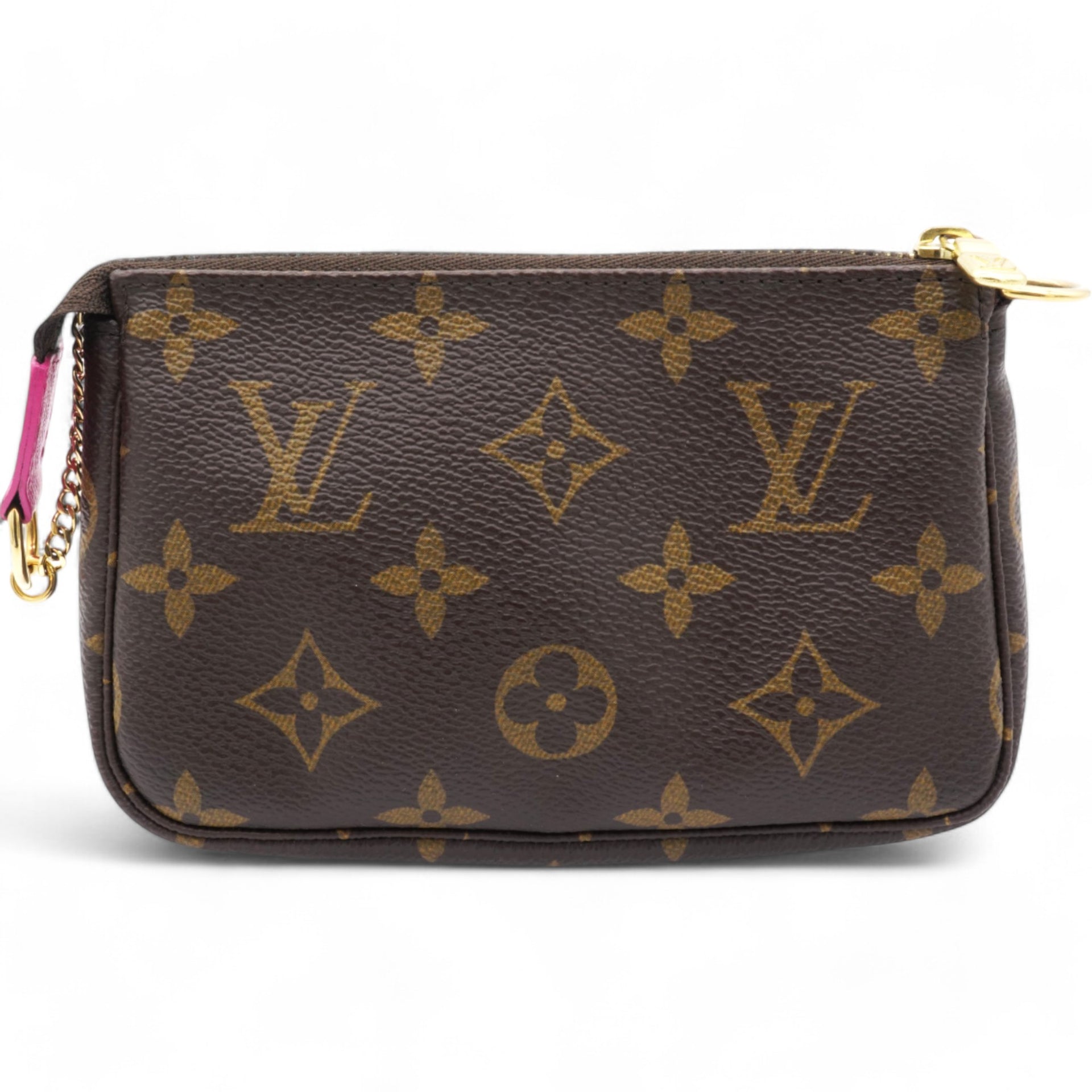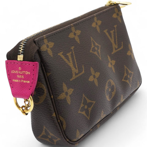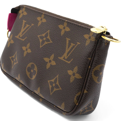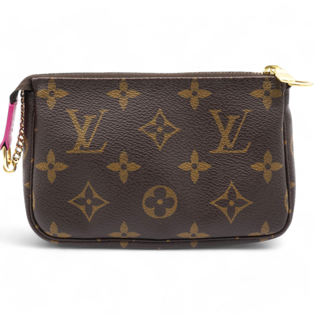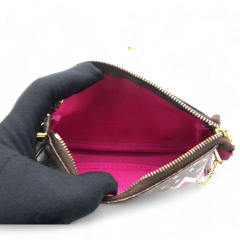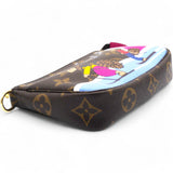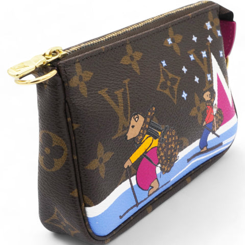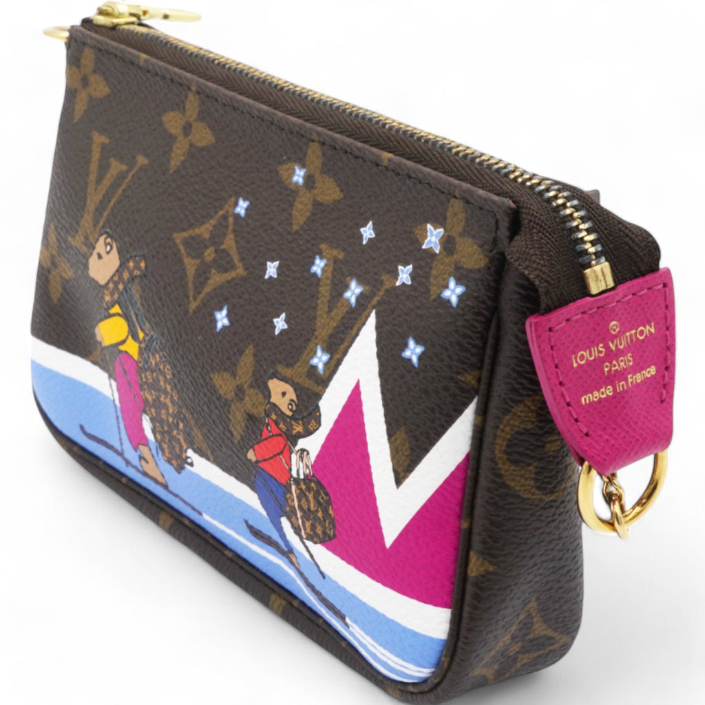 | This mini pouch is crafted of traditional monogram coated canvas and features a playful print of bears skiing. The bag features a polished brass chain wrist strap with a clasp at one end. The top zipper opens to a vibrant pink fabric interior. |