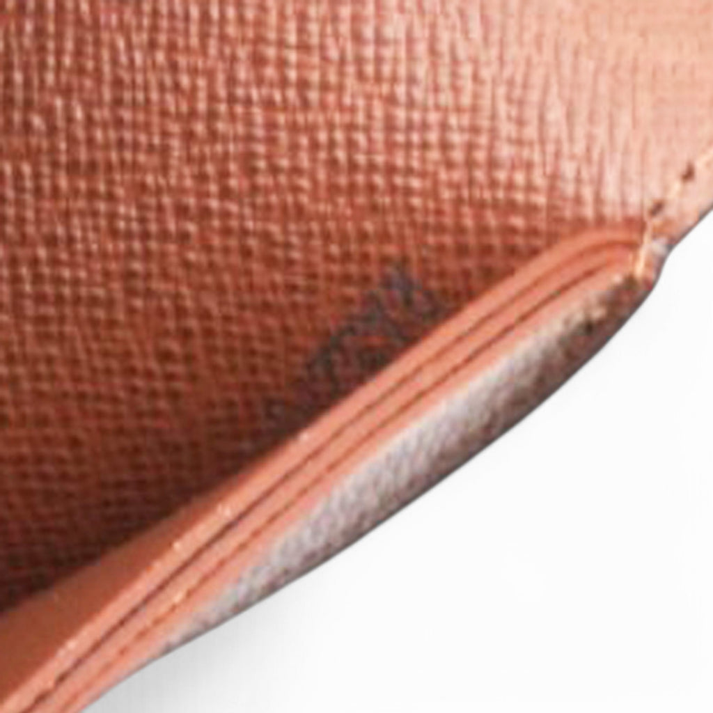 | This agenda cover is crafted of classic Louis Vuitton monogram on coated toile canvas. This cover opens to a terra cotta cross grain leather interior with patch pockets and card slots. |