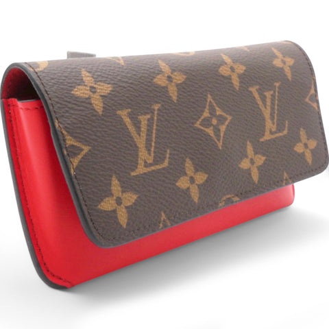 This stylish case is crafted of Louis Vuitton monogram-coated canvas and a red leather base. The case unsnaps to a red microfiber interior with room for glasses.
